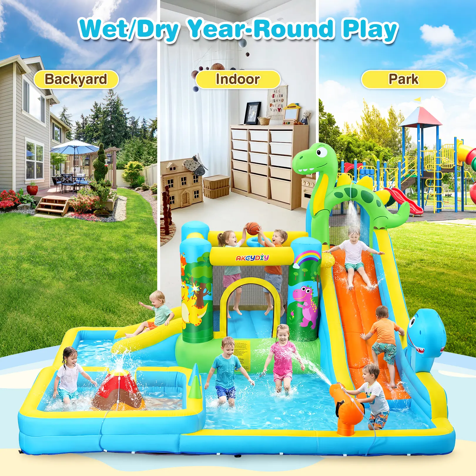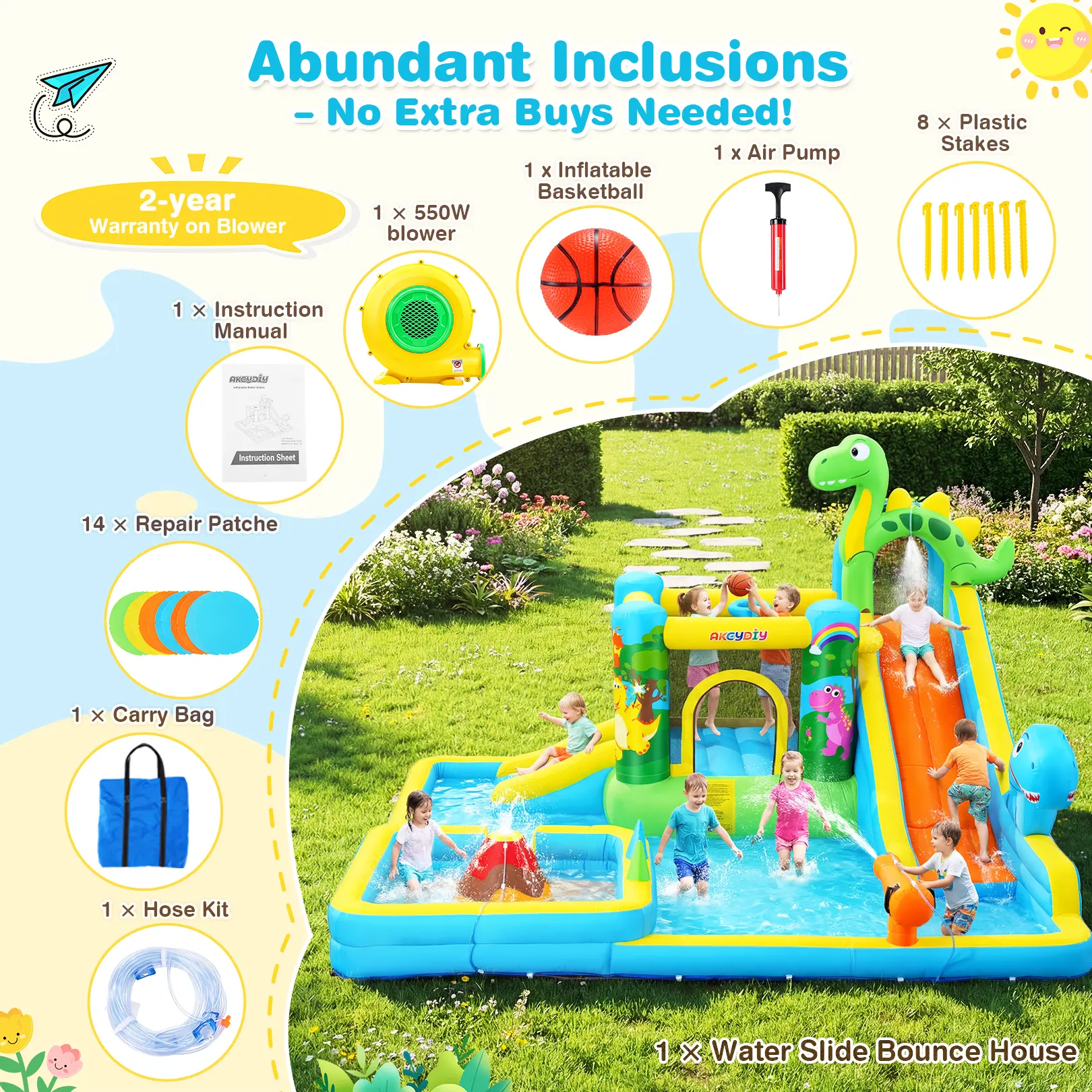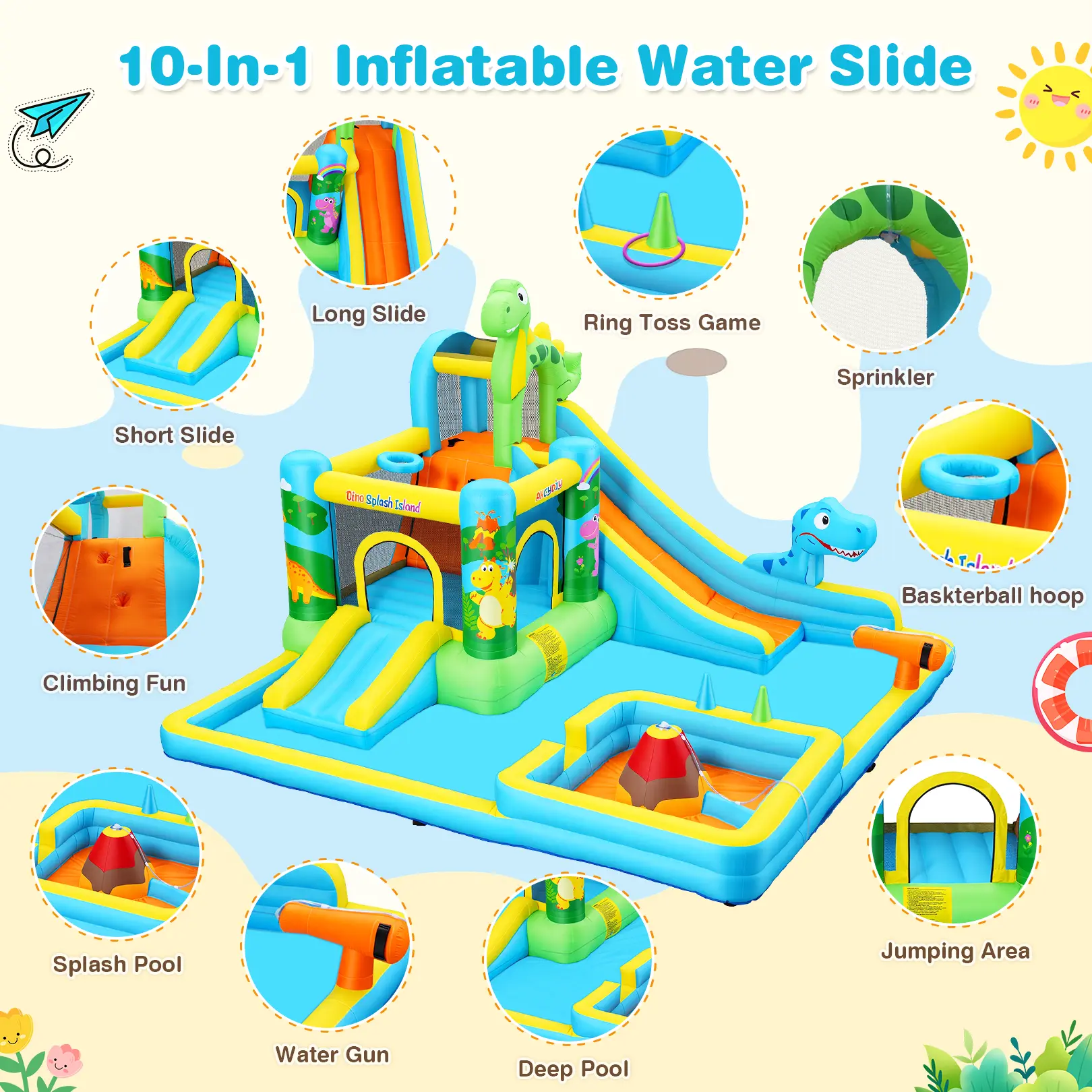 10-in-1 Fun Zone: Long slide, short slide, climbing wall, jumping area, splash pool, deep pool, water gun, basketball hoop, ring toss, and dinosaur sprinkler!