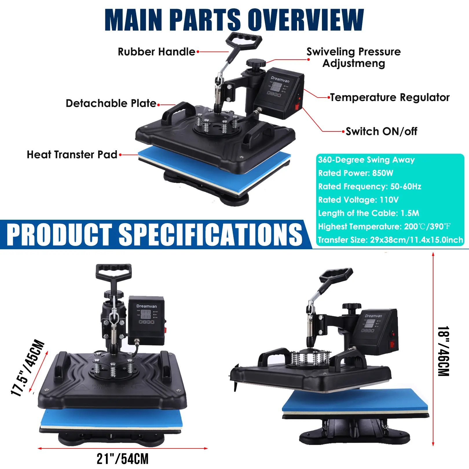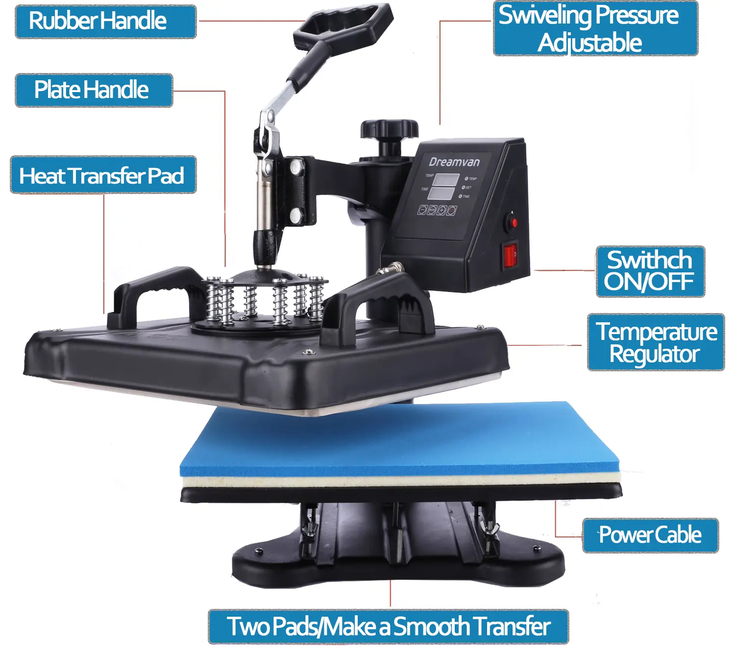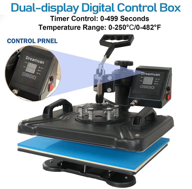 AKEYDIY heat press machine Adopts the latest heating technology.Press-casting aluminum heating plate with teflon coating,harmless to the cloth.12" x 15" Heat Press provides a big surface to create your own custom T-shirt,cap. Special thickened heating plate make the printing more even and better