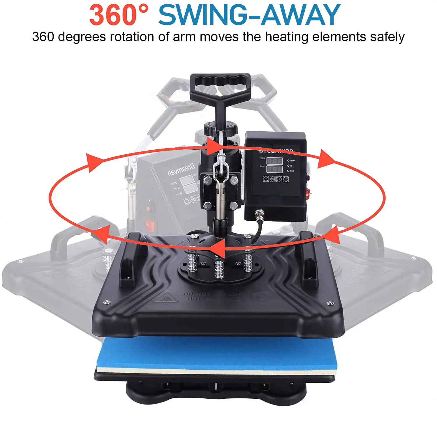 Alternatively, a swing away heat press allows the top portion of the press to swing to the side, while the lower platen remains in place, and offers the benefits of even heat distribution and energy efficiency.