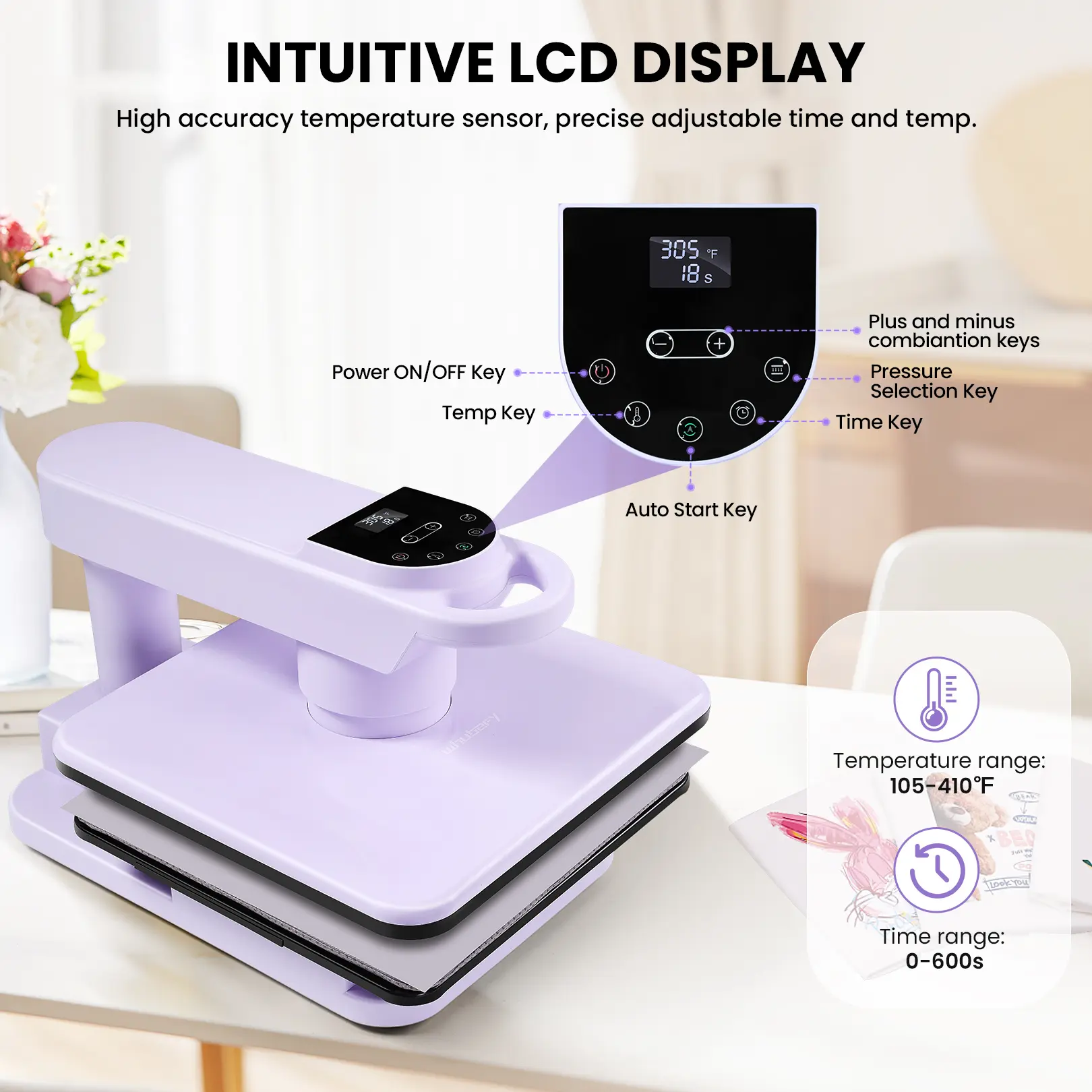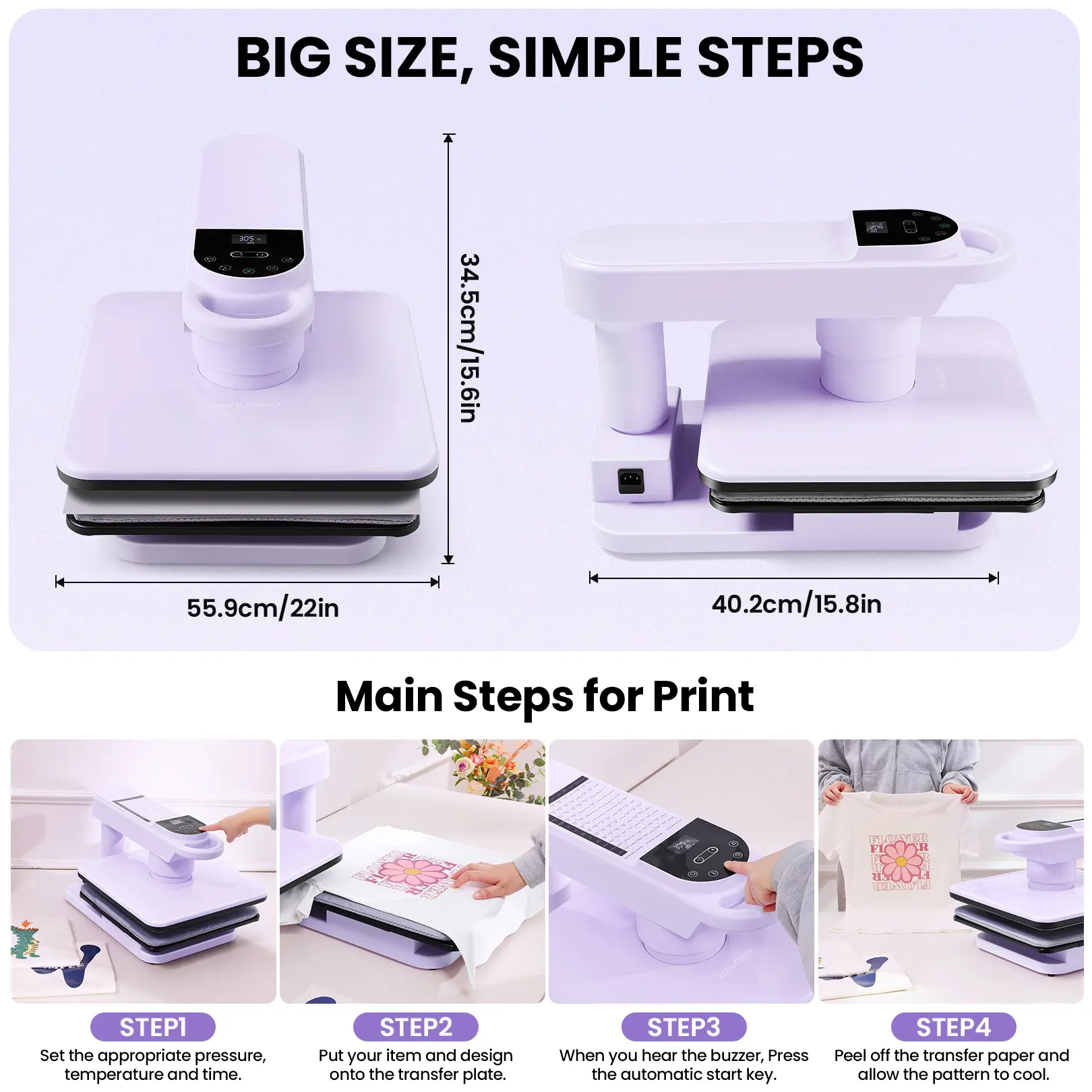 · Intuitive Display and Controls: The panel on this T-shirt press provides instant status updates so you can easily monitor progress. With the push of a button on the user-friendly control panel, you can select a preset mode or customize temperatures.