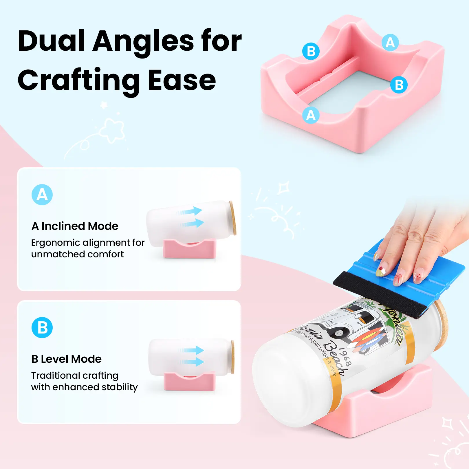 ·【Unique Design】:The included tumbler holder is designed with two-angle support, including horizontal and inclined positions, to provide you with the best conditions to apply your decals to your cups. The cup cradle has built-in slots, where you can put our felt edge squeegee and other crafting tools, which are neat and easy to take out for use.