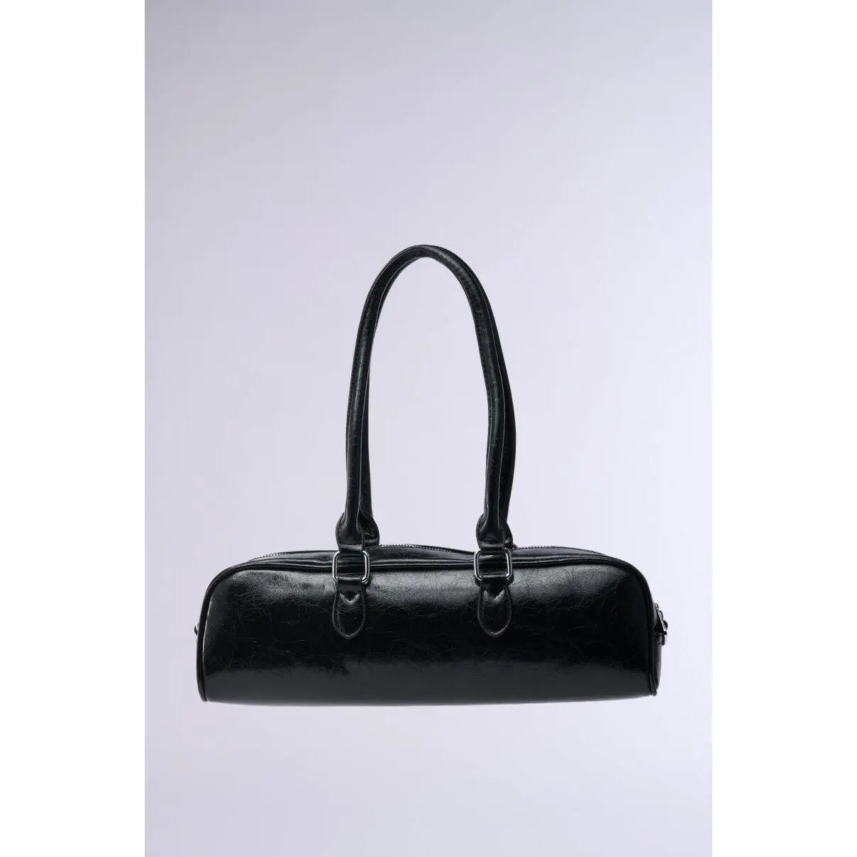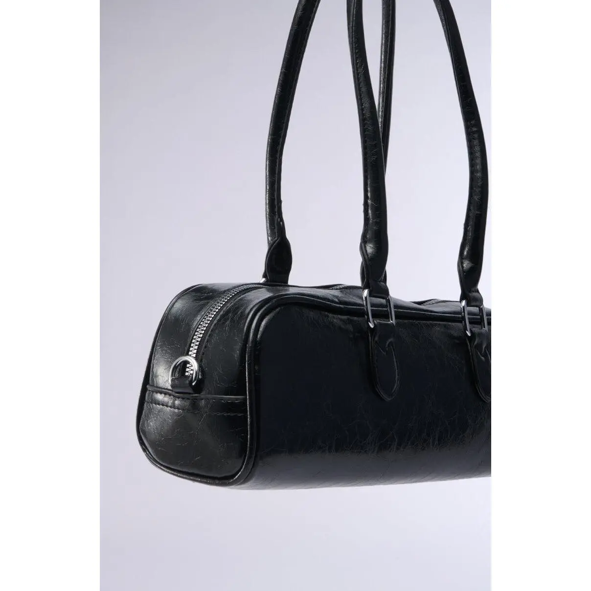 Bad girls to the front! The AKIRA Label Baddie Barrel Bag is crafted from glossy, textured faux leather and features an oblong, semi-cylindrical silhouette, attached top handles, a metallic zip-top closure, and a fully-lined interior with a slip pocket and a zippered pocket. It’s complete with silver hardware throughout and a coordinating, detachable shoulder strap. - 100% PU- Do Not Wash- Imported(all measurements approximate from size O/S)- 14” Length X 3.5” Width X 4” Height- 21” Top Handles - 47” Detachable Strap Product ID: 1026064