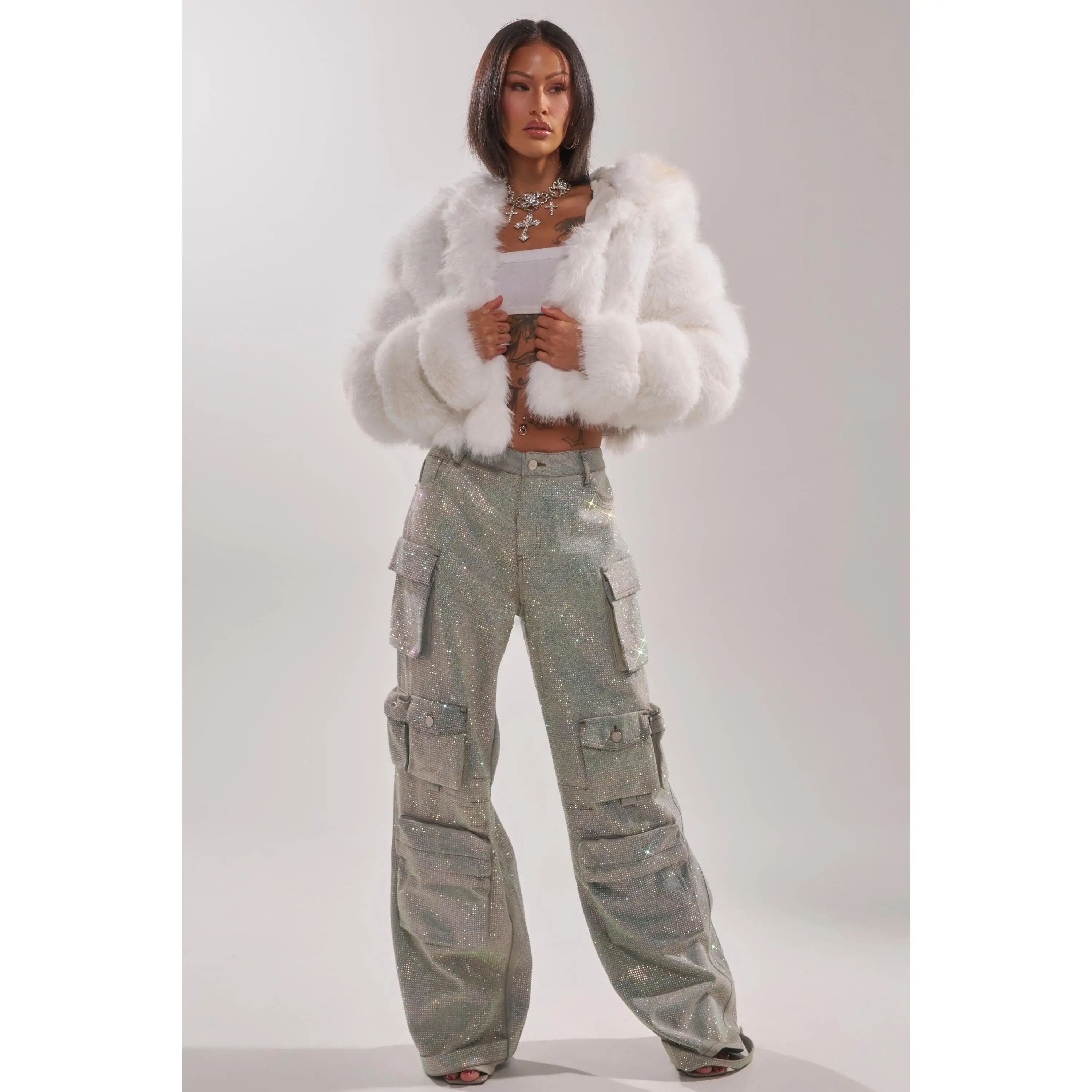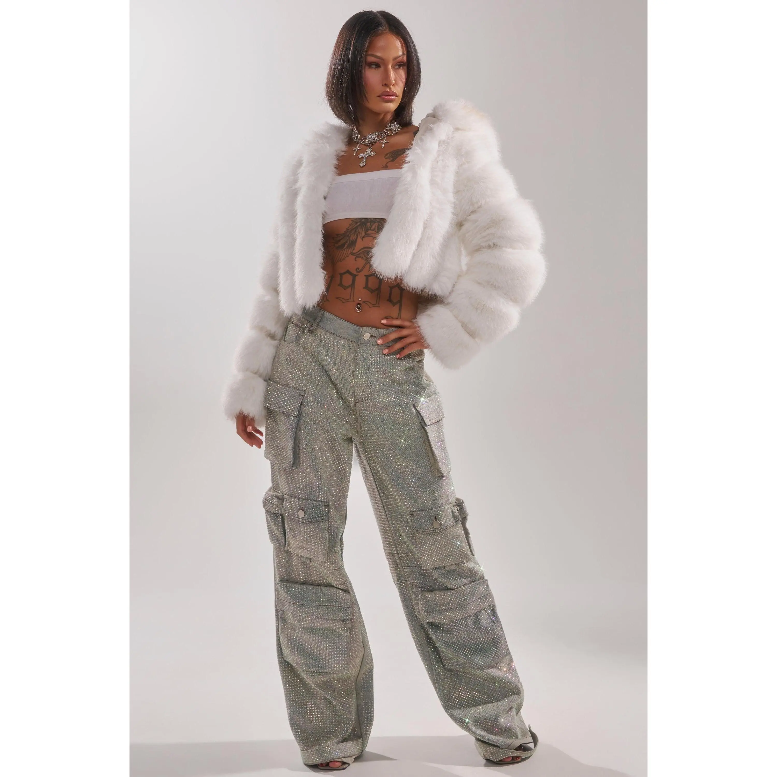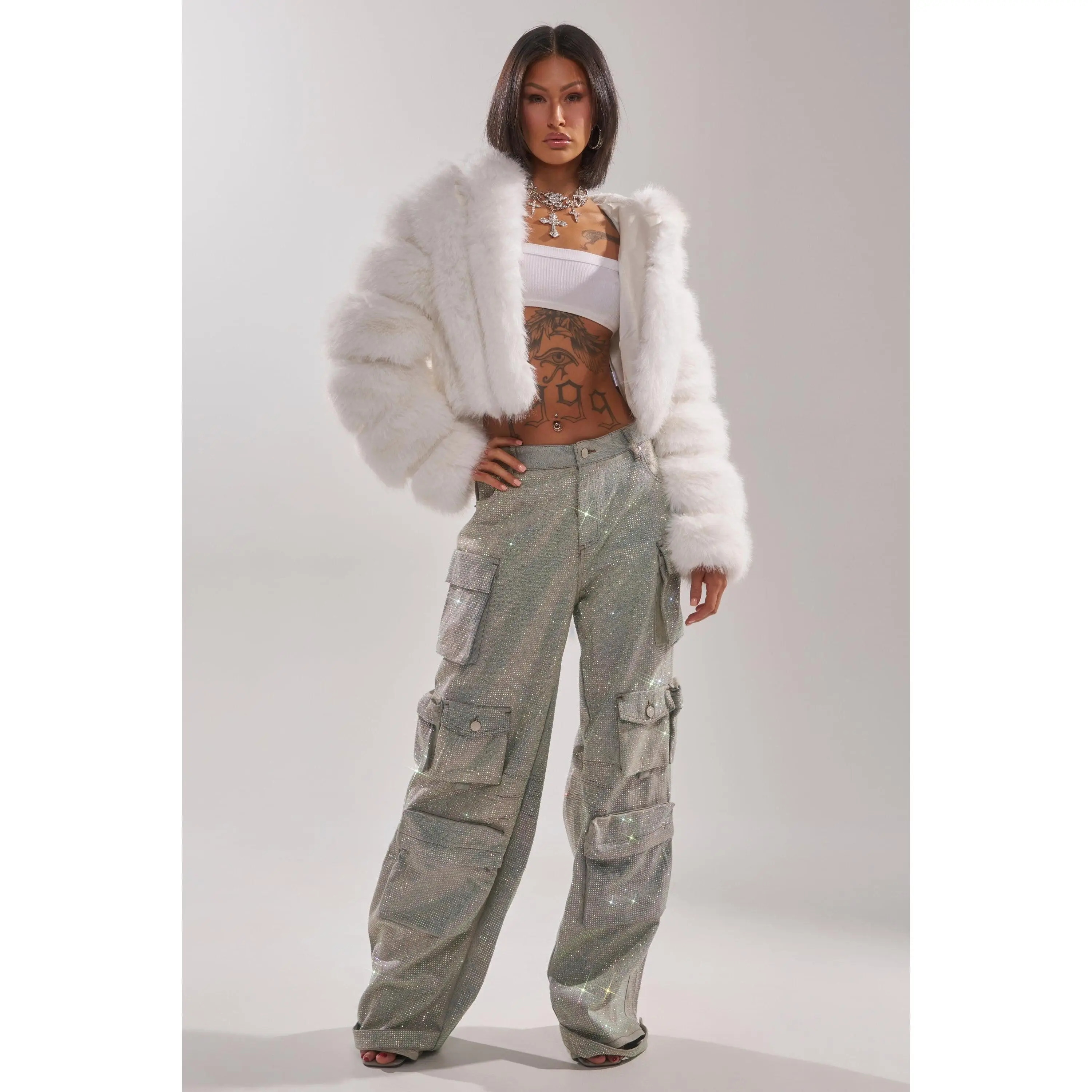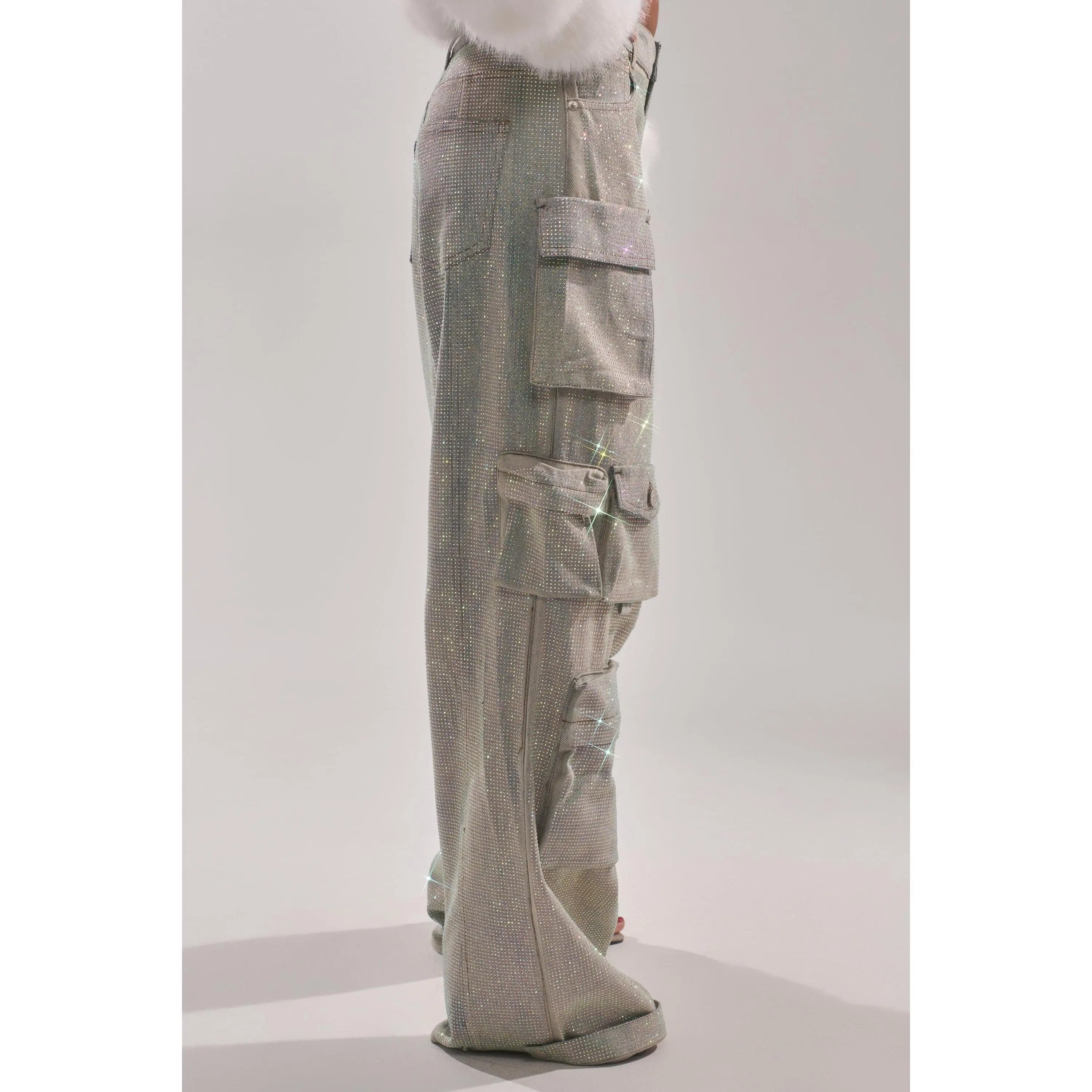 Add some razzle dazzle to your wardrobe with The AKIRA Label Bling Bling Cargo Denim. These glitzy bottoms boast a high-rise fit, functional belt loops, a classic  five-pocket design with additional cargo-style pockets lining each pant leg, and a button-zip front closure. It’s complete with a wide-leg silhouette with strappy accents on the cuffs. Pair with a baby tee and platform boots for a finished look.- 40% Cotton 31% Polyester 28% Tencel 1% Spandex- Spot Clean Only- Little Stretch- Imported(all measurements approximate from size small)- 11” Rise- 33” Inseam- Model is 5’7” and is wearing size smallProduct ID: 1075256(all measurements approximate from size 1X)- 13” Rise- 33” InseamProduct ID: 1075260