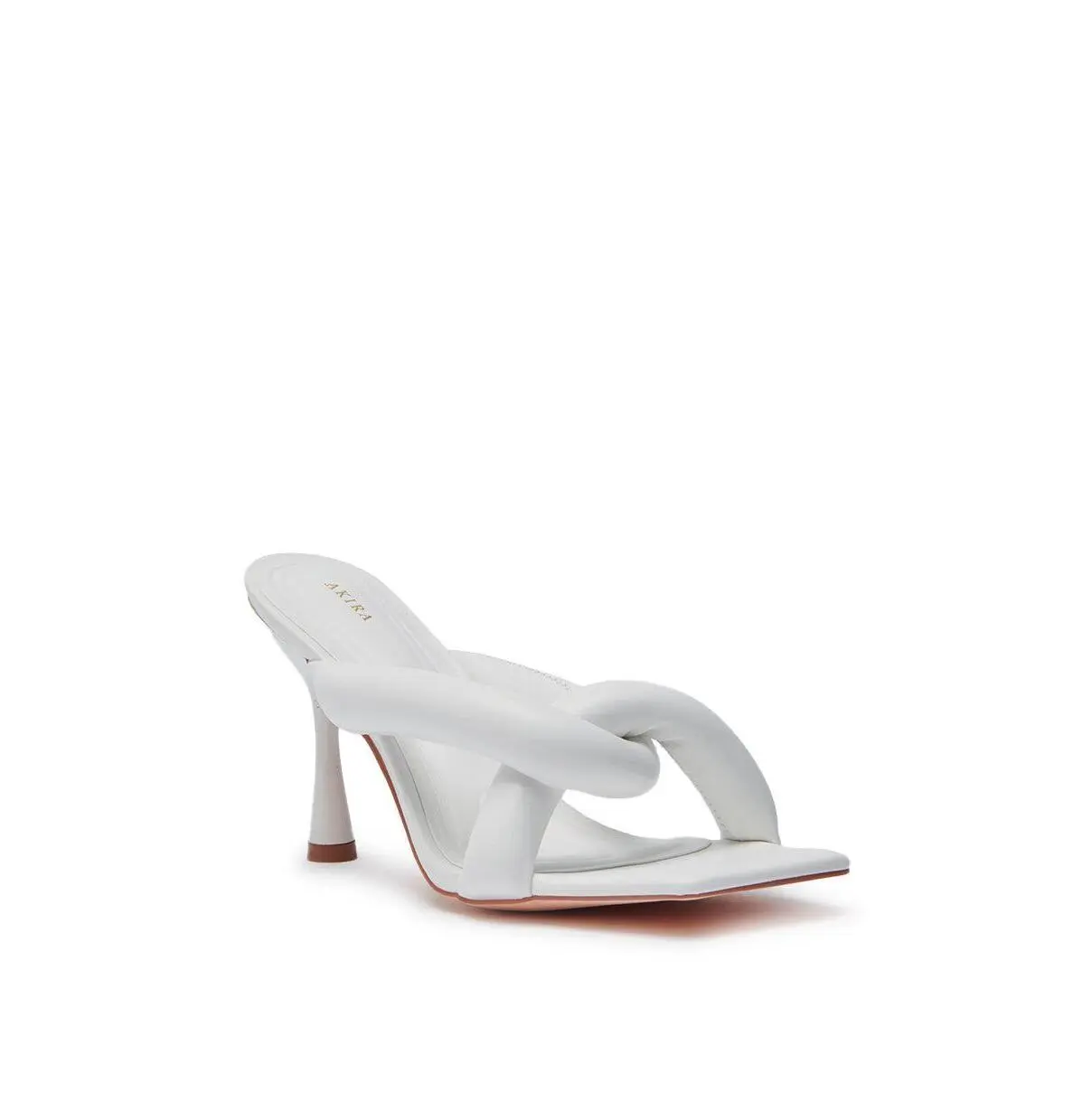 Elevate your summer wardrobe with The AKIRA Christabel New White Puff Stiletto Sandal. These trendy heeled sandals are crafted from sleek faux leather and feature a thong square toe silhouette, a tonal flared stiletto heel, puffy criss-cross toe straps, and a cushioned insole. Complete with an effortless, slide-on fit. Style with anything from a swimsuit coverup to a maxi sundress to soak up the sun’s rays in style.- Faux Leather Upper- Open Square Toe- Flared Stiletto Heel- Imported(all measurements approximate from size 7.5)- 3.75” Heel HeightProduct ID: 1049913
