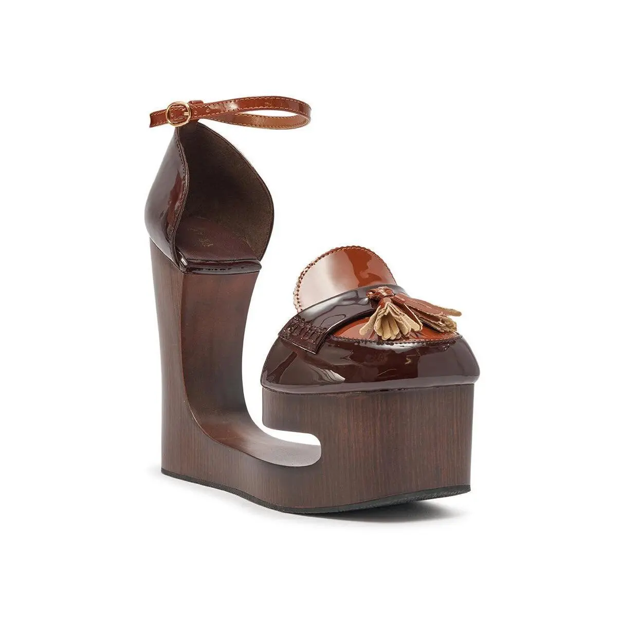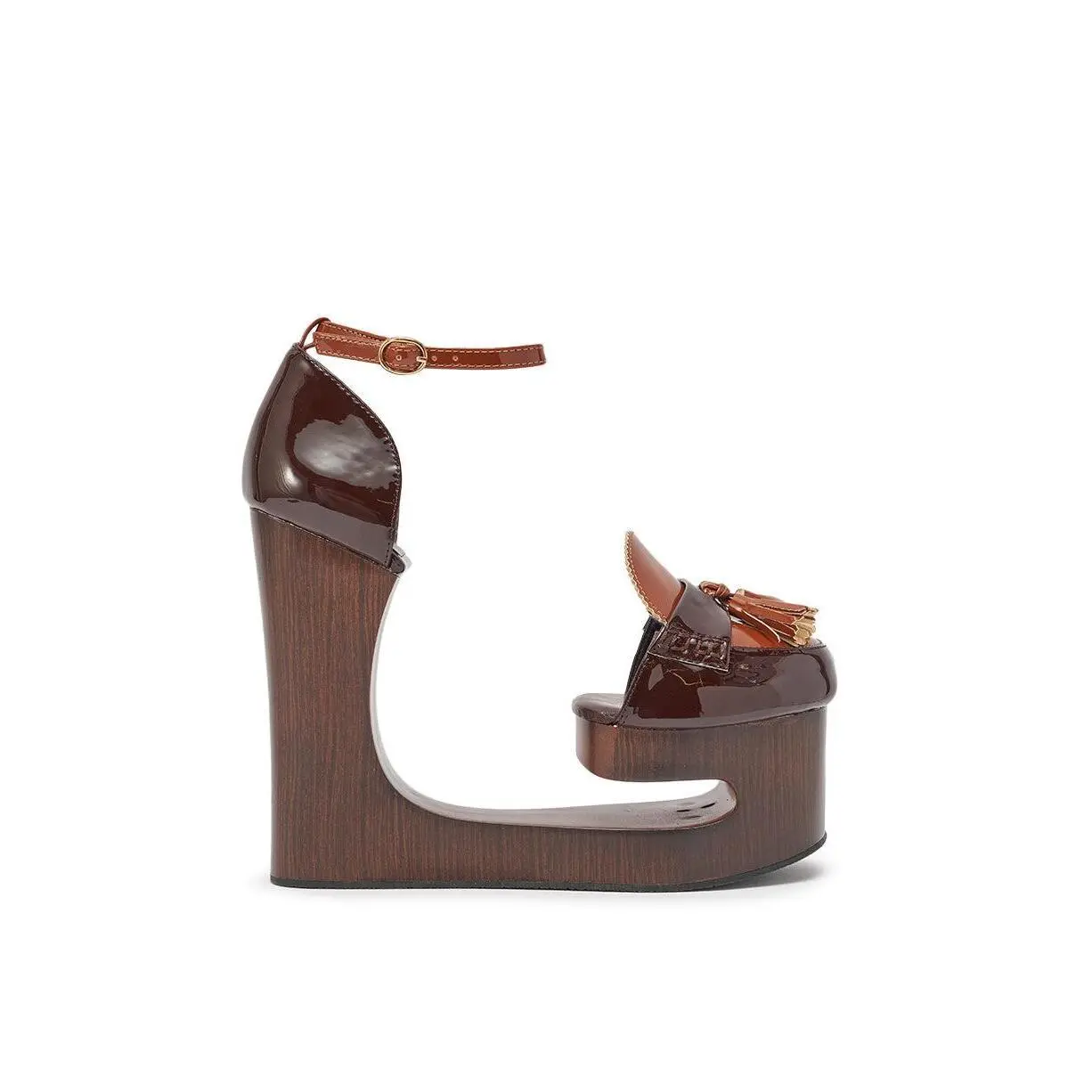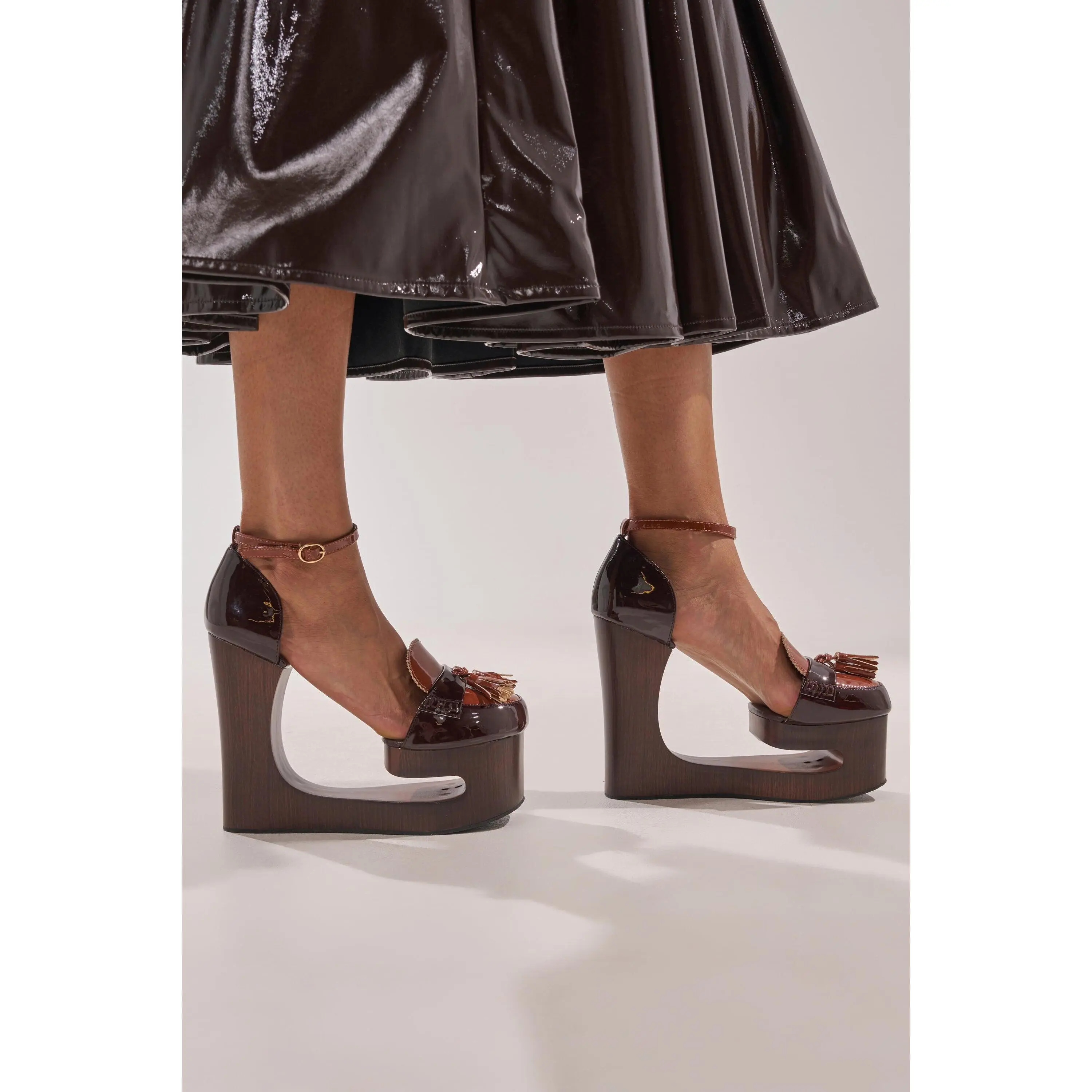 Loafer-inspired wedge pump with a bold sculptural silhouette, perfect for nights out, fashion events, or leveling up your everyday look. Featuring a glossy faux leather upper with a rich contrast trim, this standout heel is designed with a dramatic wood-look platform sculptural wedge that delivers major height with a sleek, futuristic edge. The square loafer-esque front is finished with a chic tassel accent for a playful touch, while the slingback ankle strap adds support and a secure fit. Style it with a mini dress, wide-leg trousers, or a sharp blazer set for an unapologetically elevated vibe.- Faux Leather Upper- Square Toe - Wedge Heel- Imported(all measurements are approximate from size 10)- 6.25” HeelProduct ID: 1081406
