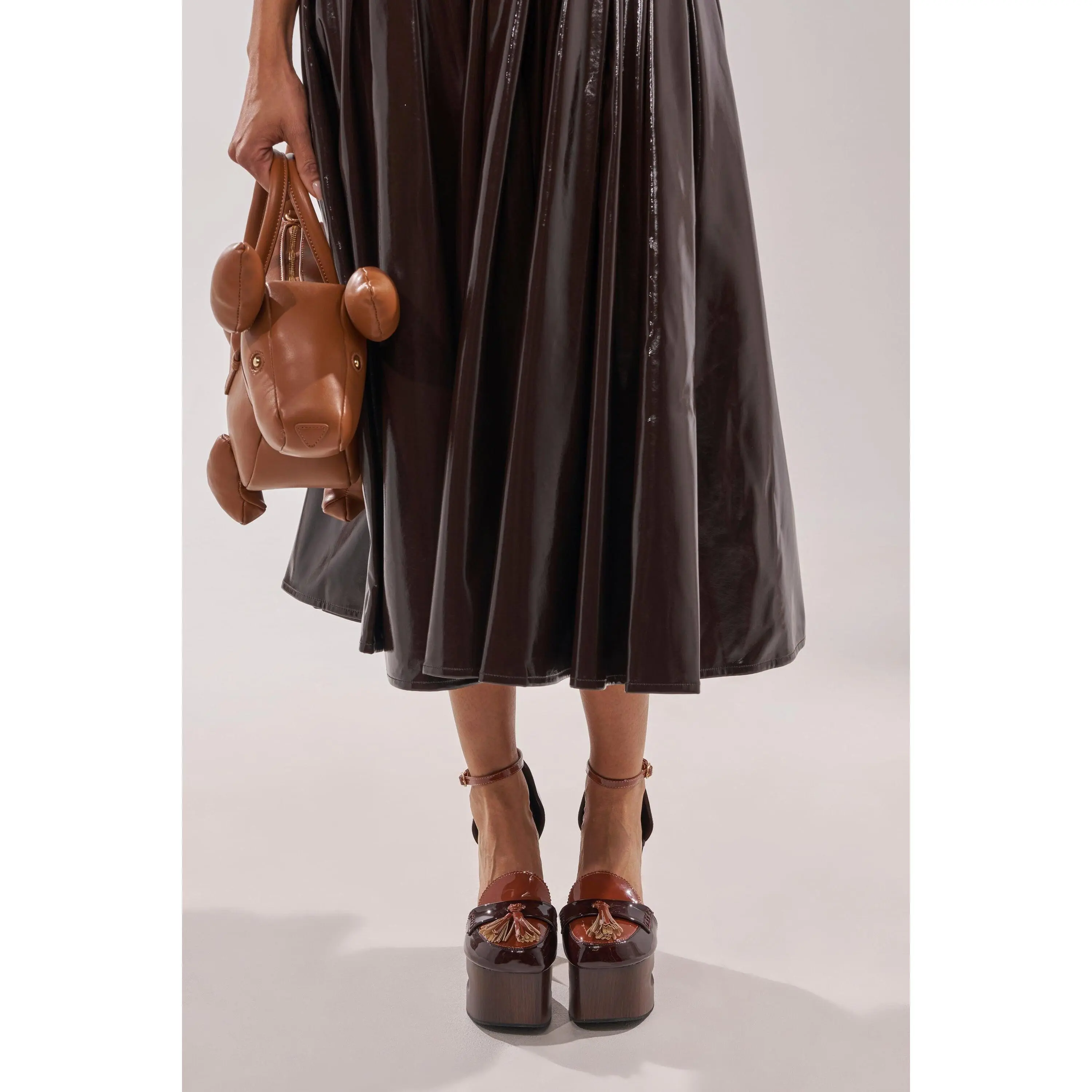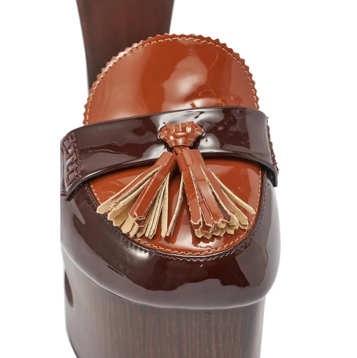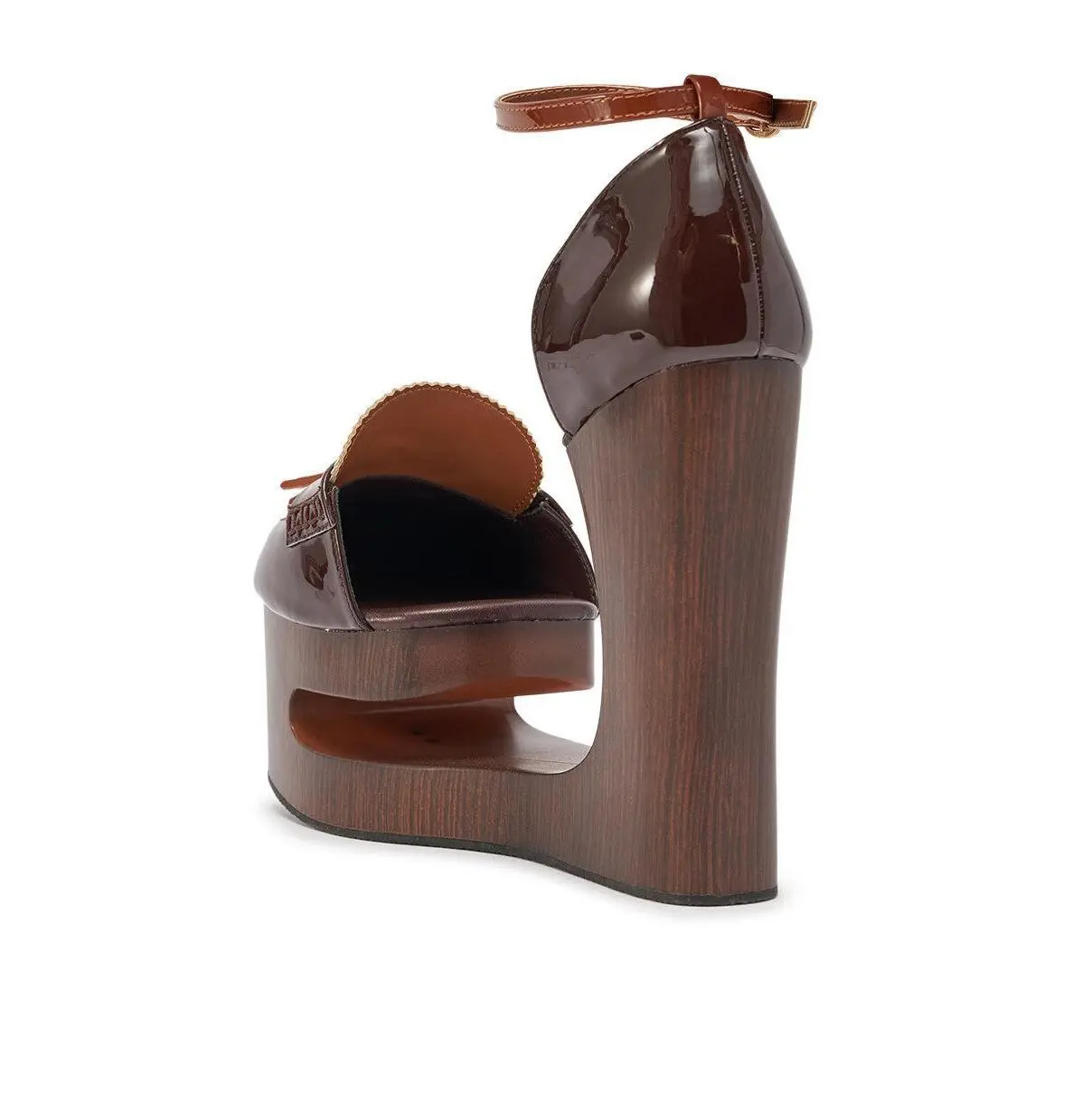 Loafer-inspired wedge pump with a bold sculptural silhouette, perfect for nights out, fashion events, or leveling up your everyday look. Featuring a glossy faux leather upper with a rich contrast trim, this standout heel is designed with a dramatic wood-look platform sculptural wedge that delivers major height with a sleek, futuristic edge. The square loafer-esque front is finished with a chic tassel accent for a playful touch, while the slingback ankle strap adds support and a secure fit. Style it with a mini dress, wide-leg trousers, or a sharp blazer set for an unapologetically elevated vibe.- Faux Leather Upper- Square Toe - Wedge Heel- Imported(all measurements are approximate from size 10)- 6.25” HeelProduct ID: 1081406