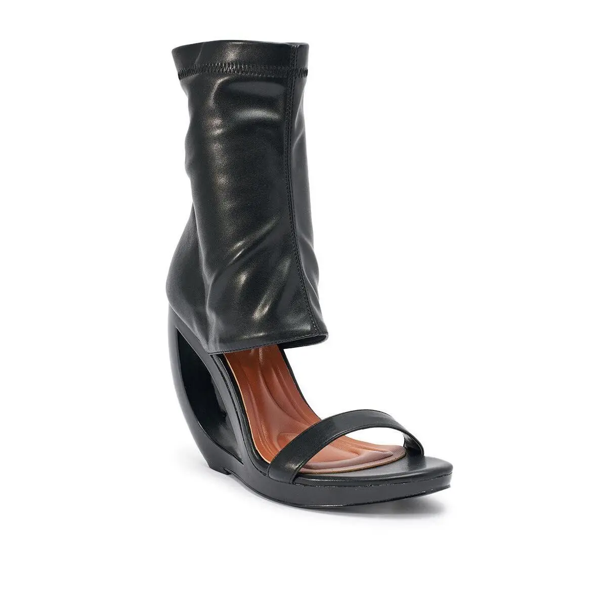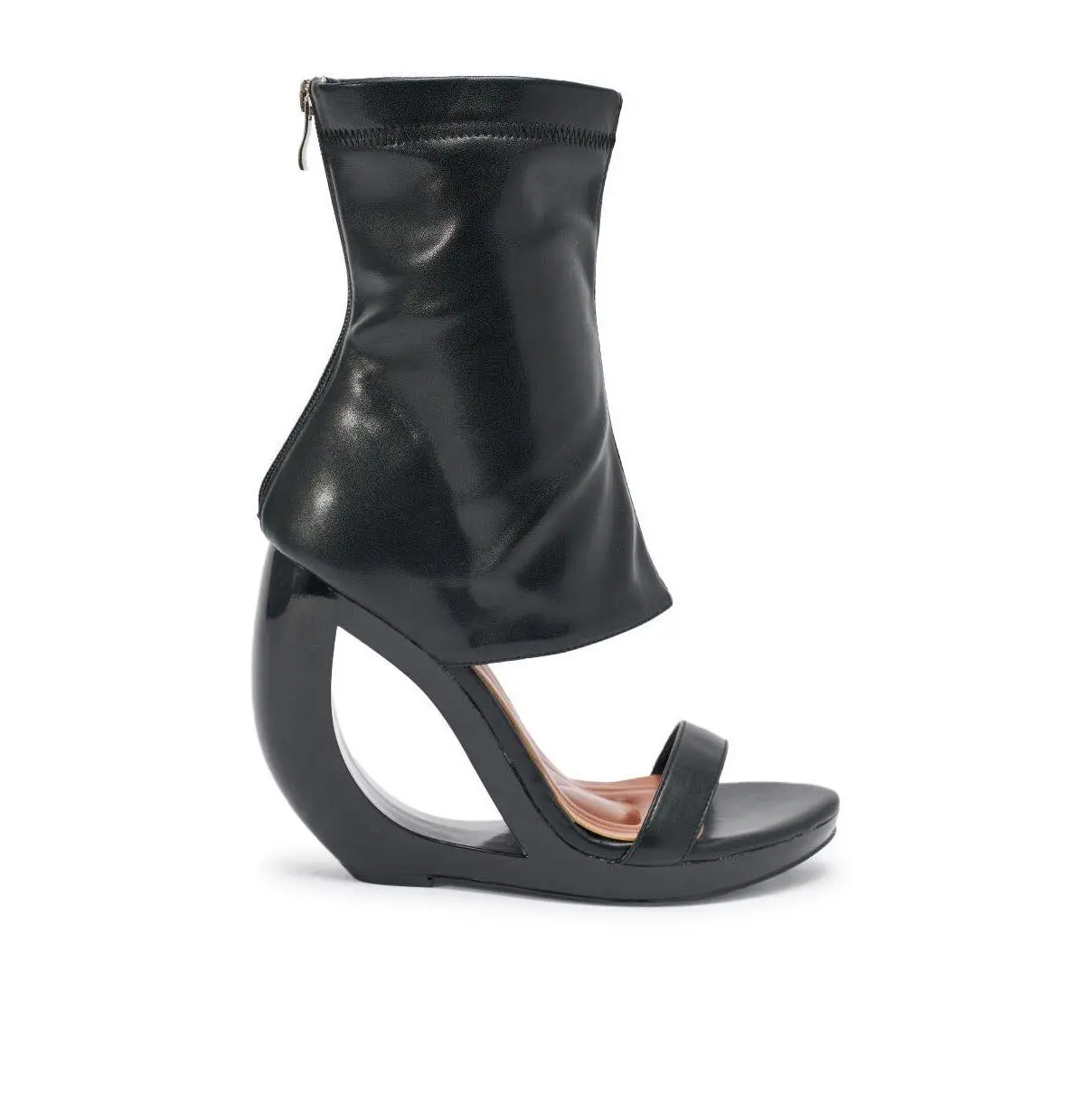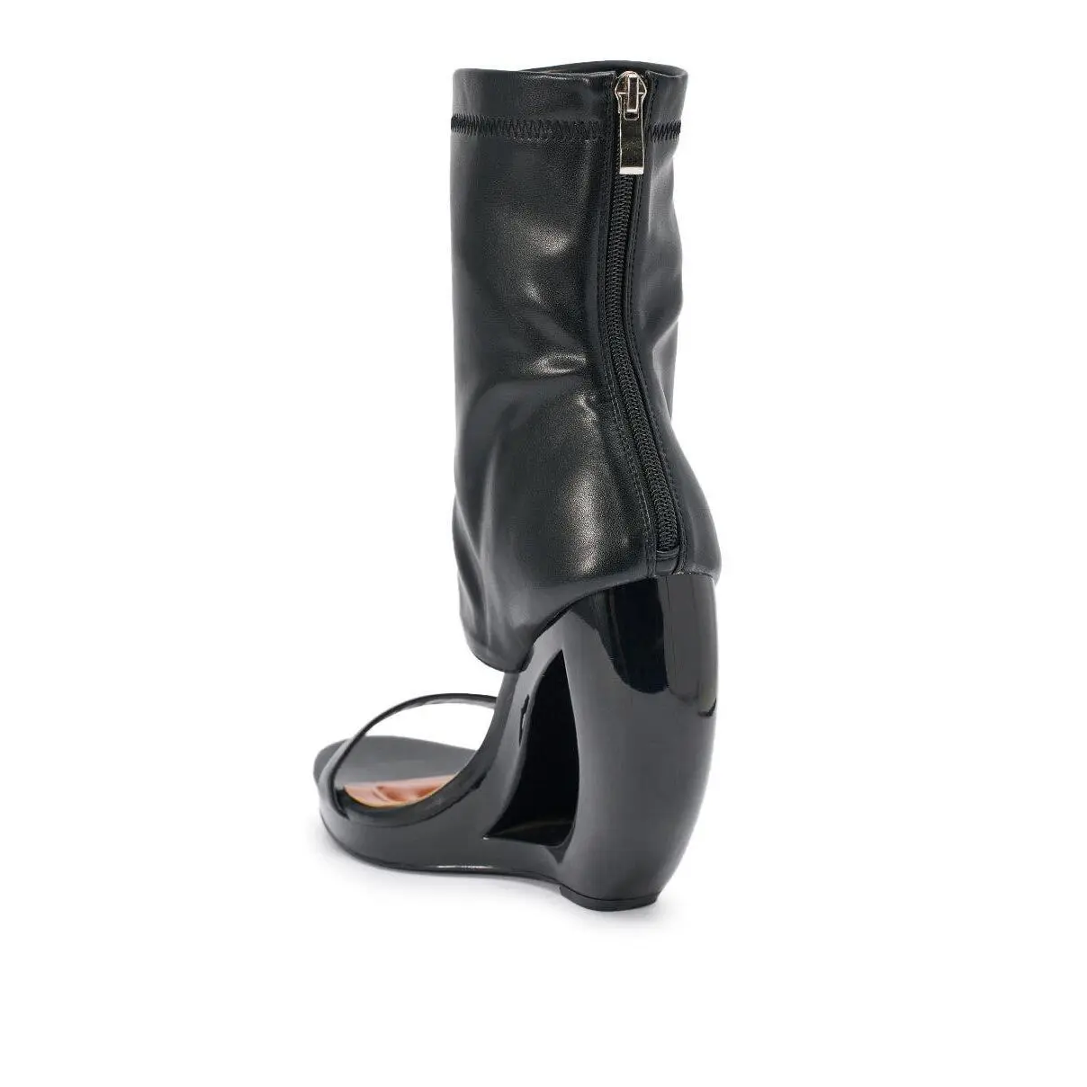 Sculptural heel open-toe black faux leather booties designed for modern statement styling, fashion-forward ensembles, and elevated evening looks. Made from glossy faux leather, this versatile heel boasts an open almond toe, a uniquely curved wedge heel with a cut out accent, an ankle-high shaft that wraps around the upper ankle, a cushioned faux leather insole, and a back zip closure.- Faux Leather Upper- Open Almond Toe- Wedge Heel- Ankle-High Shaft- Imported(all measurements approximate from size 10)- 5” Heel Height- 6.5” Shaft Height- 11” Shaft Opening CircumferenceProduct ID: 1081672