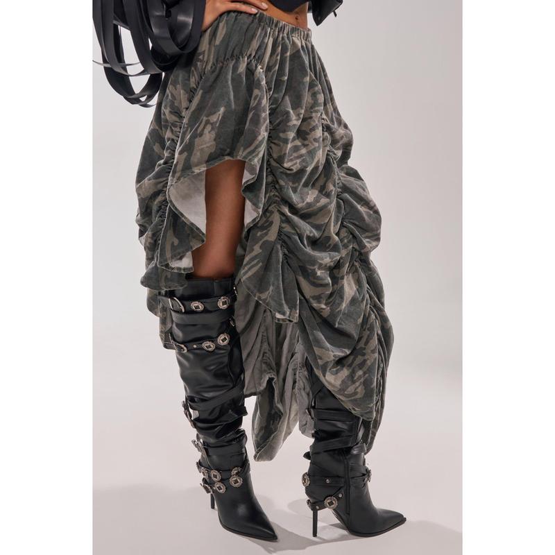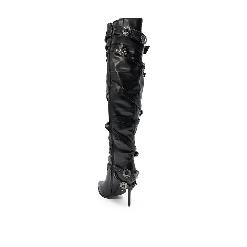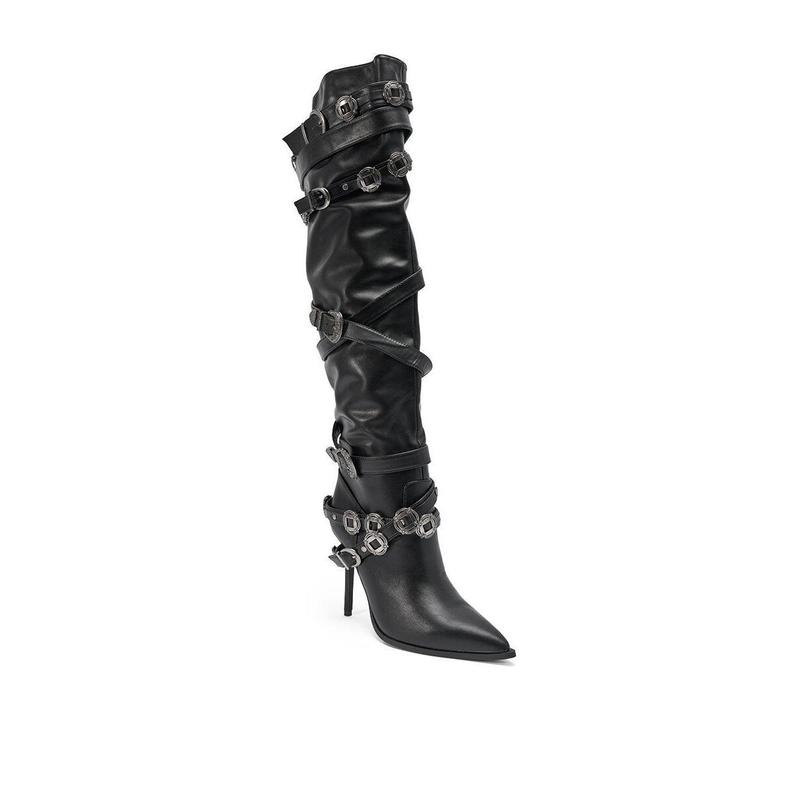 These fierce knee-high heeled boots are crafted from sleek black faux leather with bold buckled strap detailing and polished silver hardware for an instantly elevated, biker-inspired look. They feature a pointed toe, a slouchy knee-high shaft with layered buckle straps, a slim stiletto heel for a leg-lengthening finish, and an inner ankle zipper closure. Style them with a mini dress or distressed denim and a leather jacket for a bold, night-out-ready vibe.- Faux Leather Upper- Pointed Toe- Stiletto Heel- Knee-High Shaft- Imported(all measurements approximate from size 10)- 4.5” Heel Height- 23” Shaft Height- 20” Shaft Opening Circumference- 14” Calf CircumferenceProduct ID: 1078855