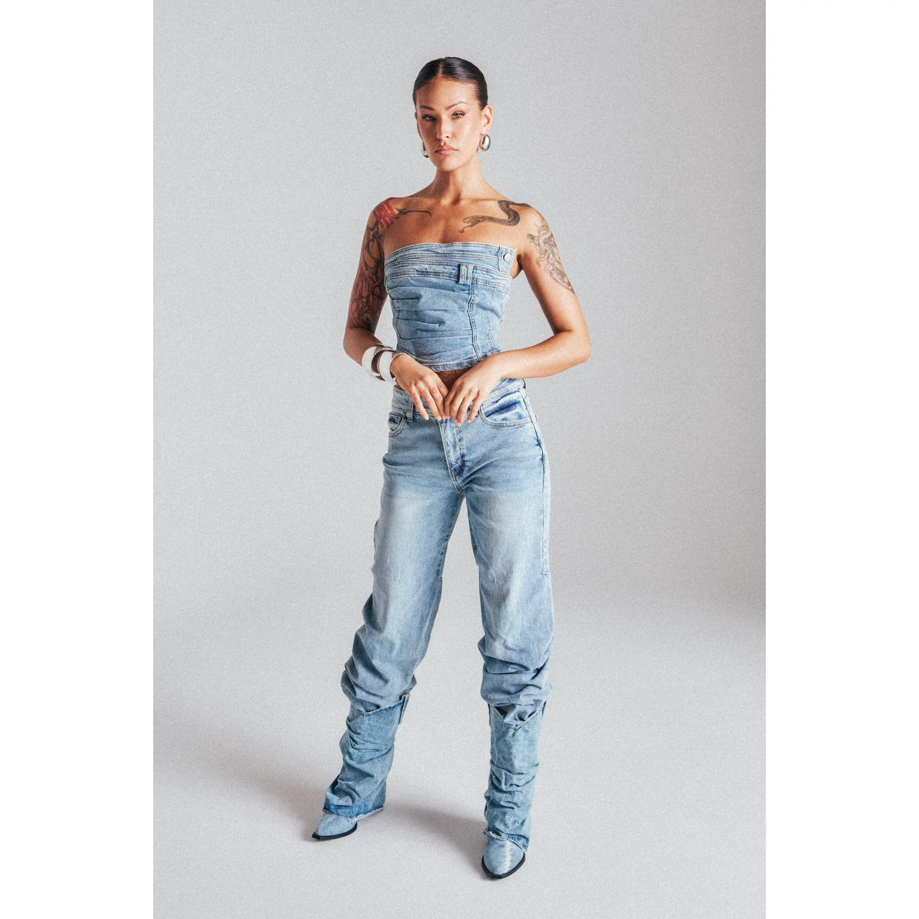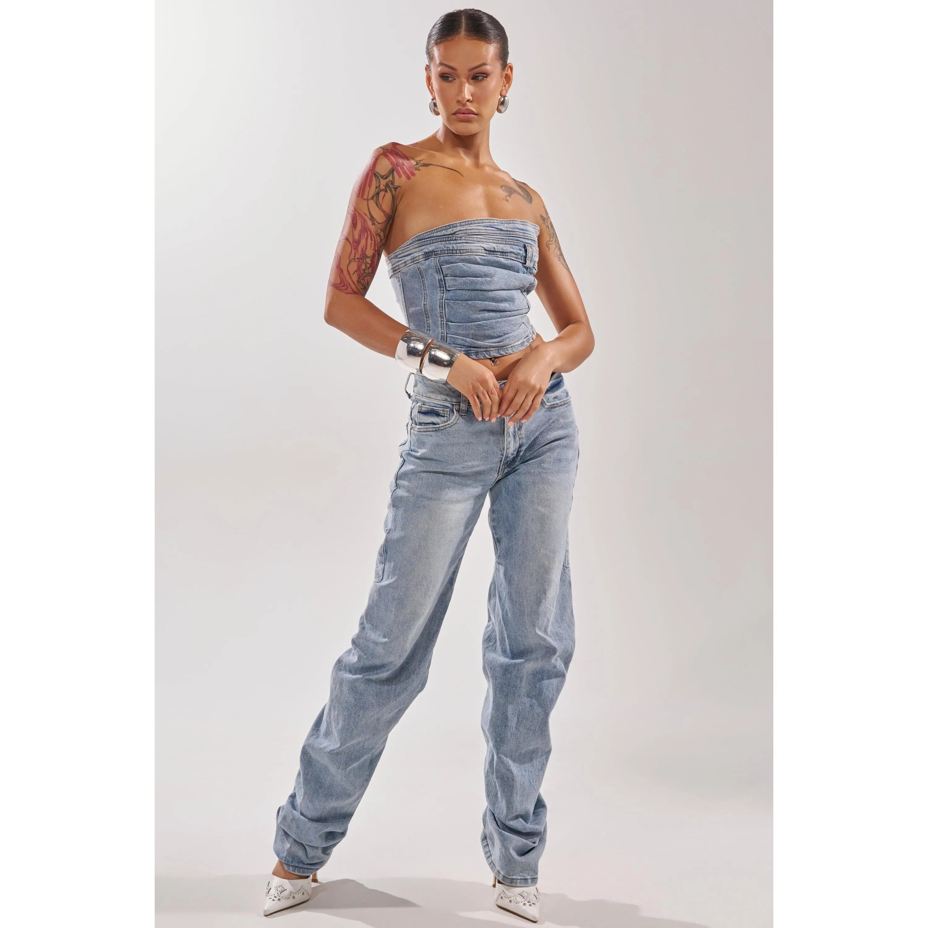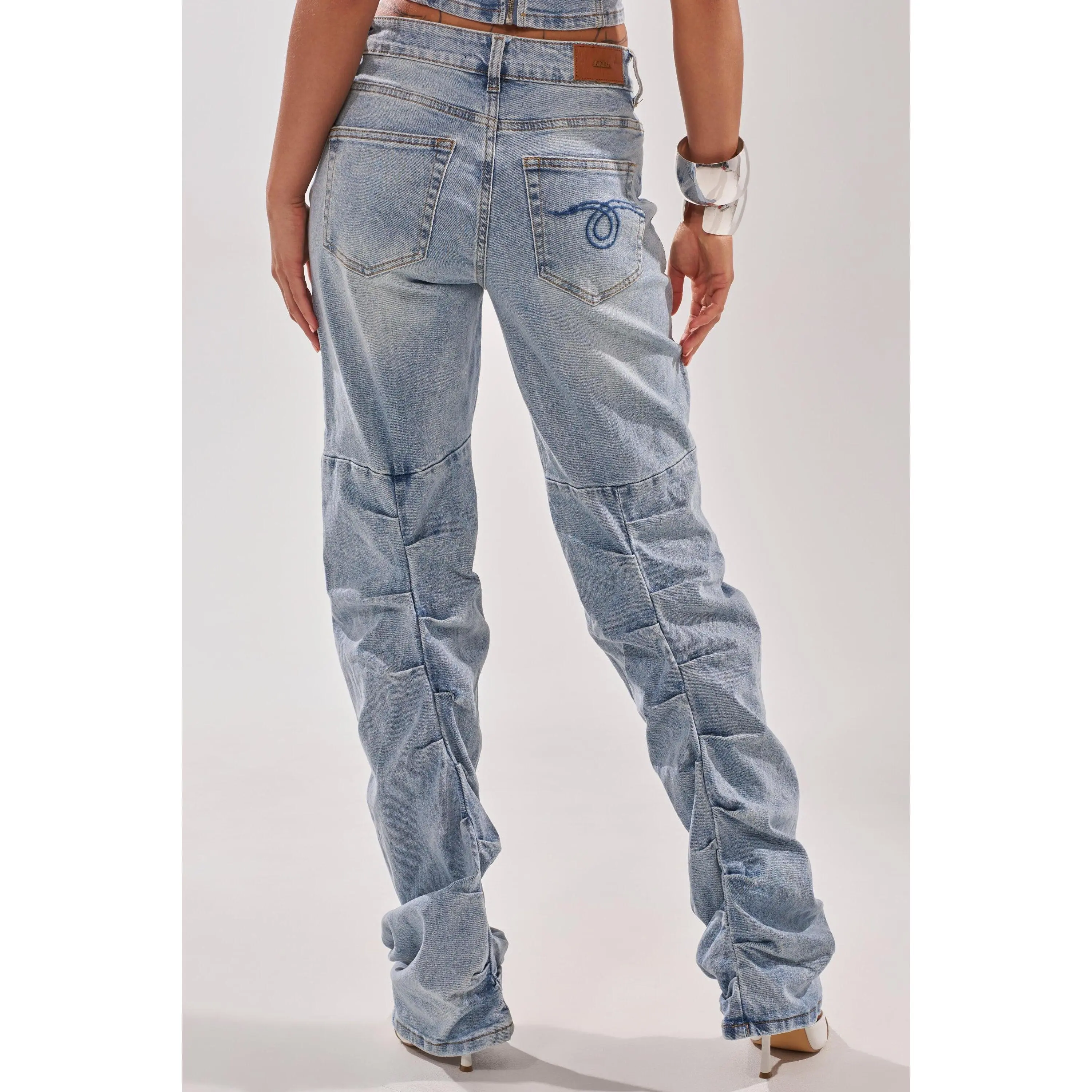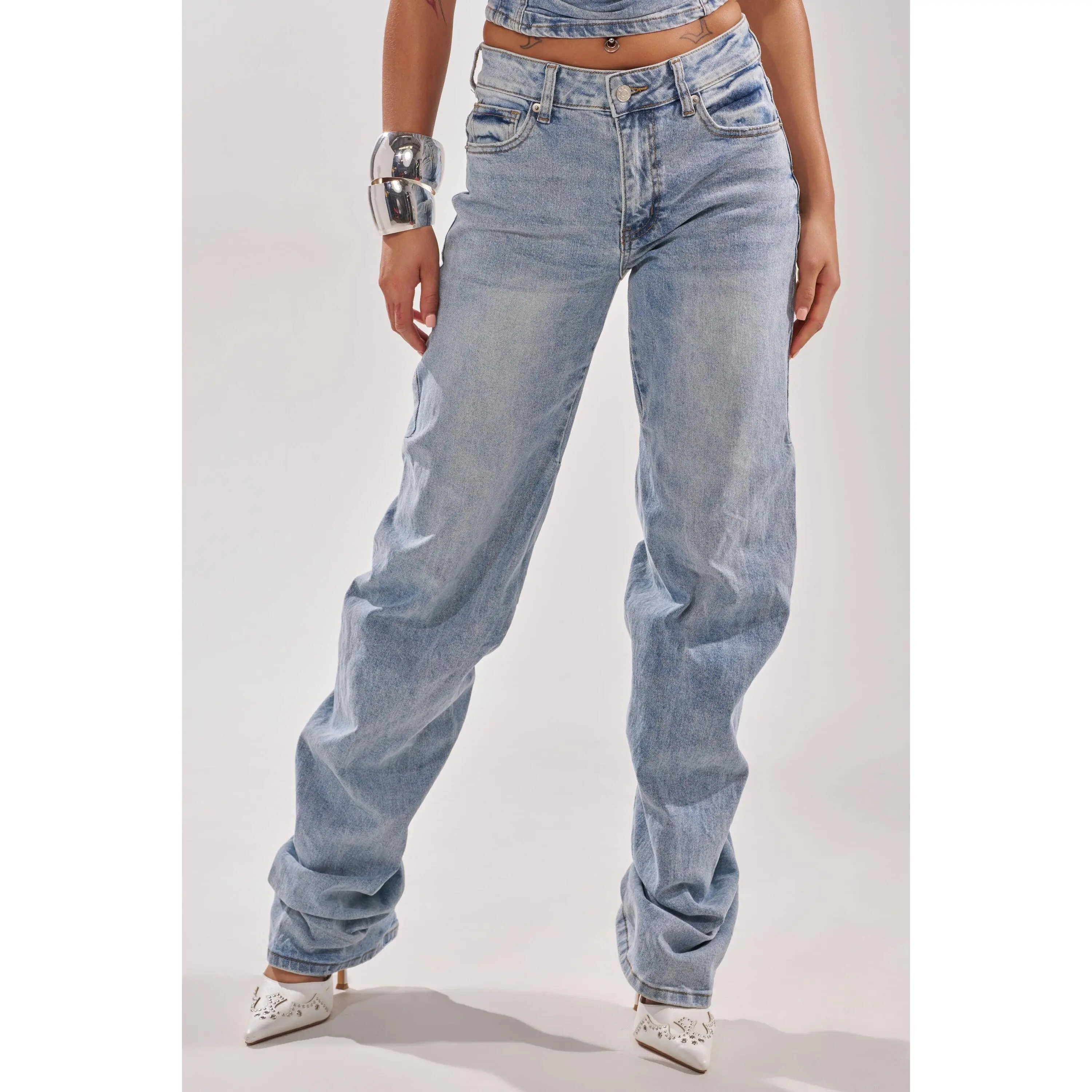 The AKIRA Label On Your Mind Stacked Denim is crafted from semi-stretchy denim in a light-wash colorway. It features a high-rise first, functional belt loops, a classic five-pocket design with embroidered accents on the rear, a button-zip front closure, and a stacked, ultra-ruched construction on the pant legs. Complete with a skinny-leg silhouette. Style with the coordinating AKIRA Label On Your Mind Denim Corset, platform pumps, and a clutch for a finished look.- 99% Cotton 1% Spandex- Slight Stretch- Imported(all measurements approximate from size small)- 10” Rise- 34” Inseam- Model is 5’7” and is wearing size smallProduct ID: 1074537