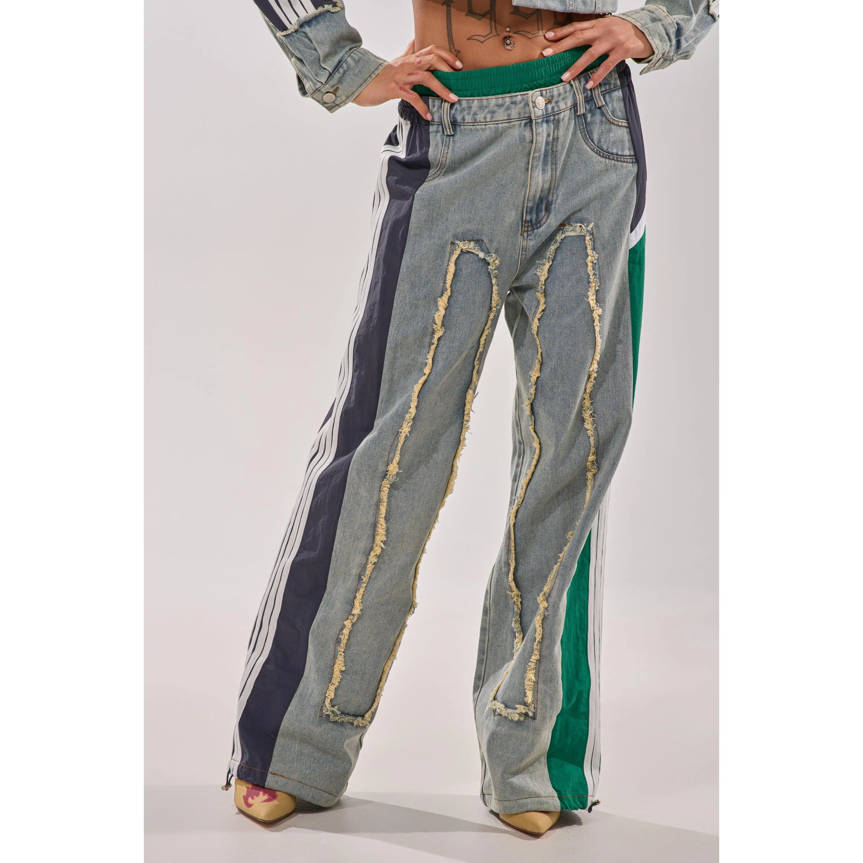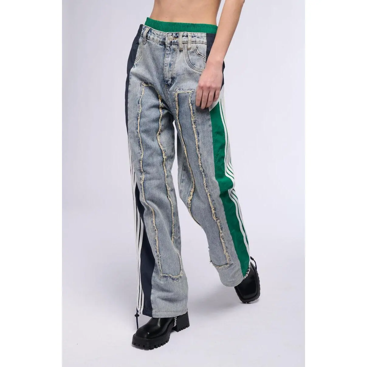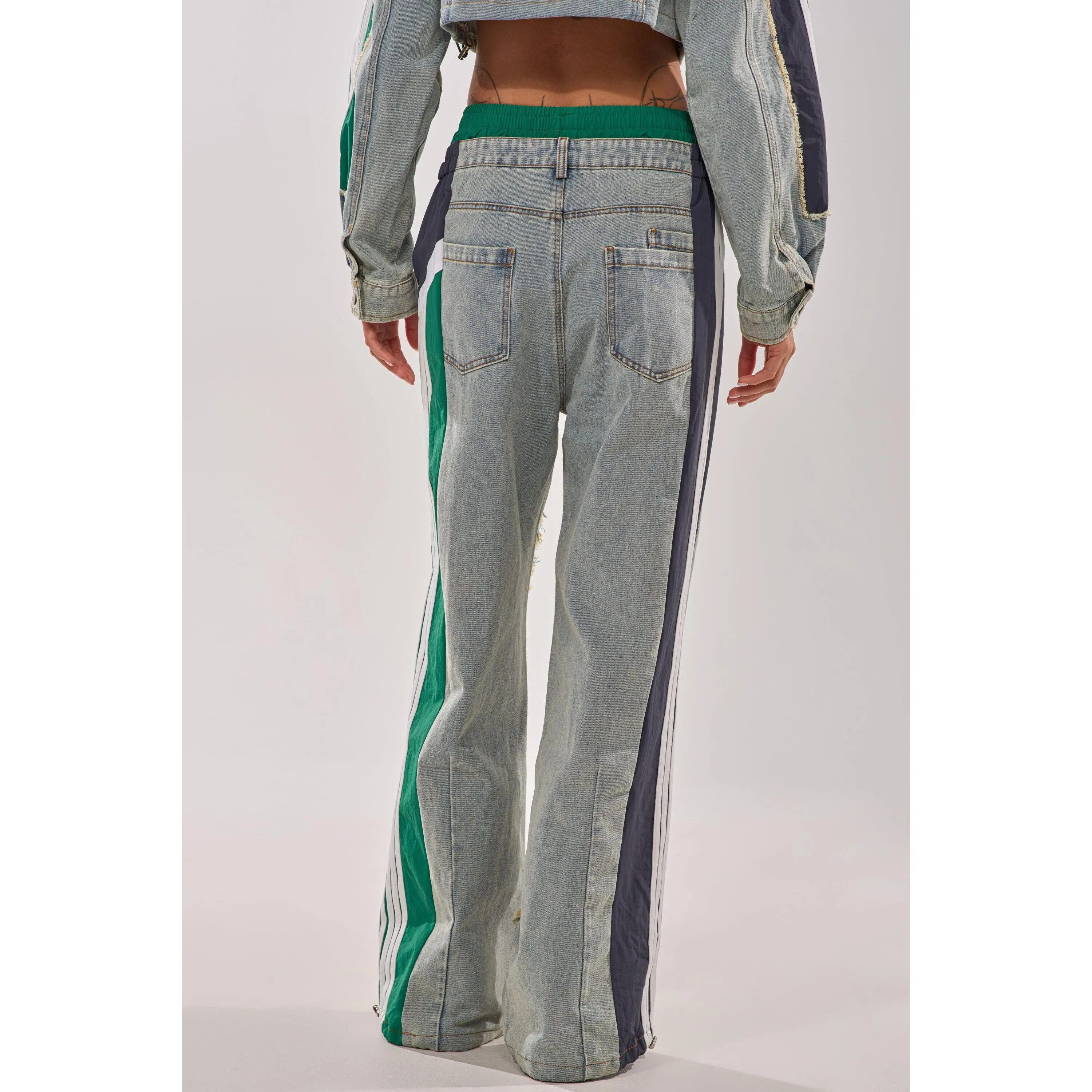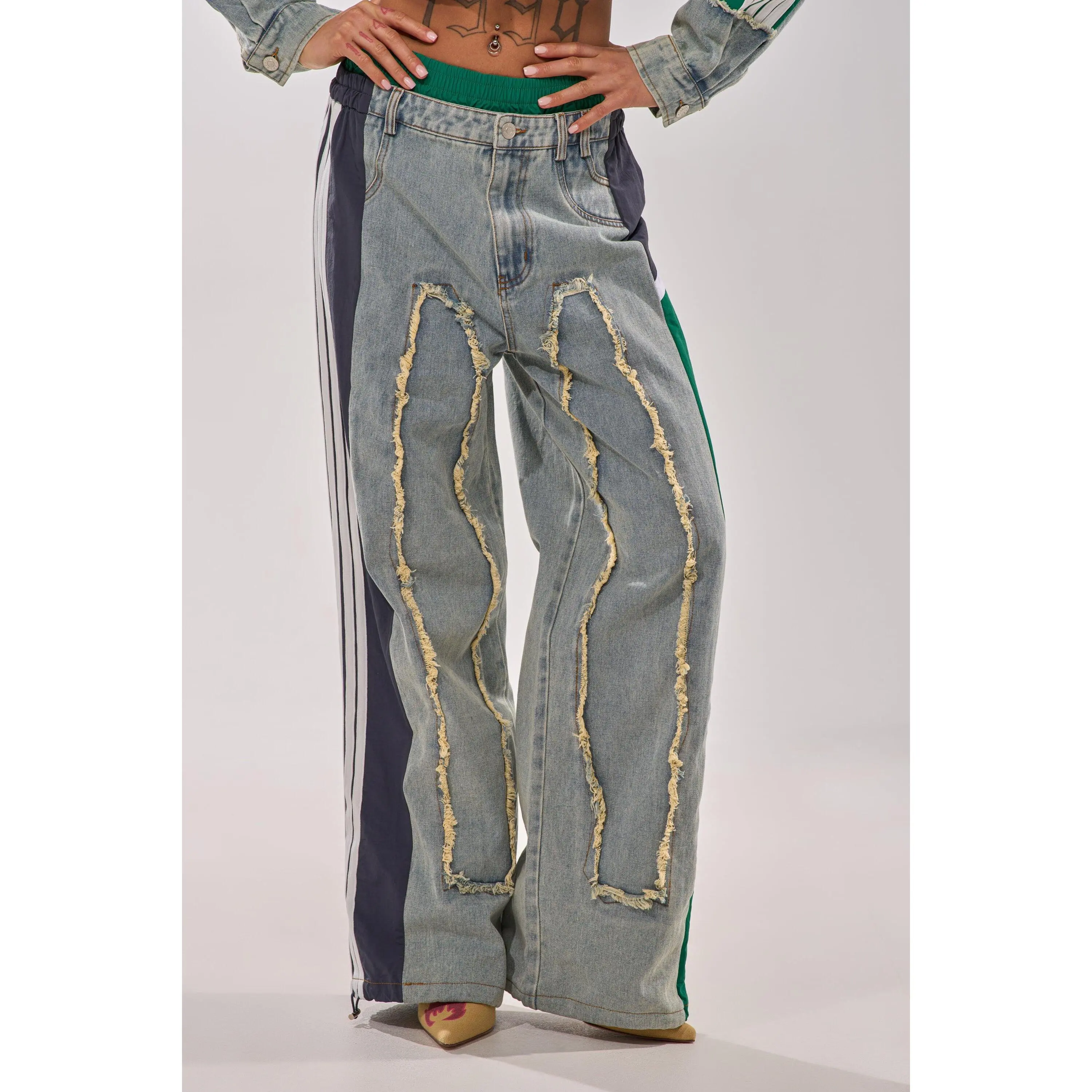 The AKIRA Label All Around The World Patchwork Denim Jogger Pant In Green Multi is a multi-fabric piece that features a non-stretch, washed denim base, distressed detailing down the front, stacked denim and shirred elastic contrast waistbands, a high rise design, functional belt loops, three back pouch pockets, and dual mock front pockets with one functional side slant pocket. Complete with color block windbreaker-inspired striped contrast paneling down the sides, a wide leg silhouette, adjustable cinched drawcord hems, a pull-on design, and a front zip button closure. Style with cropped cotton tees and platform sneakers for a finished look. - Shell 1: 93% Cotton 4% Polyester 3% Viscose, Shell 2: 100% Polyester - Little to No Stretch - Imported (all measurements are approximate from size small) - 14” Rise - 32” Inseam - Model is 5’9” Product ID: 422485