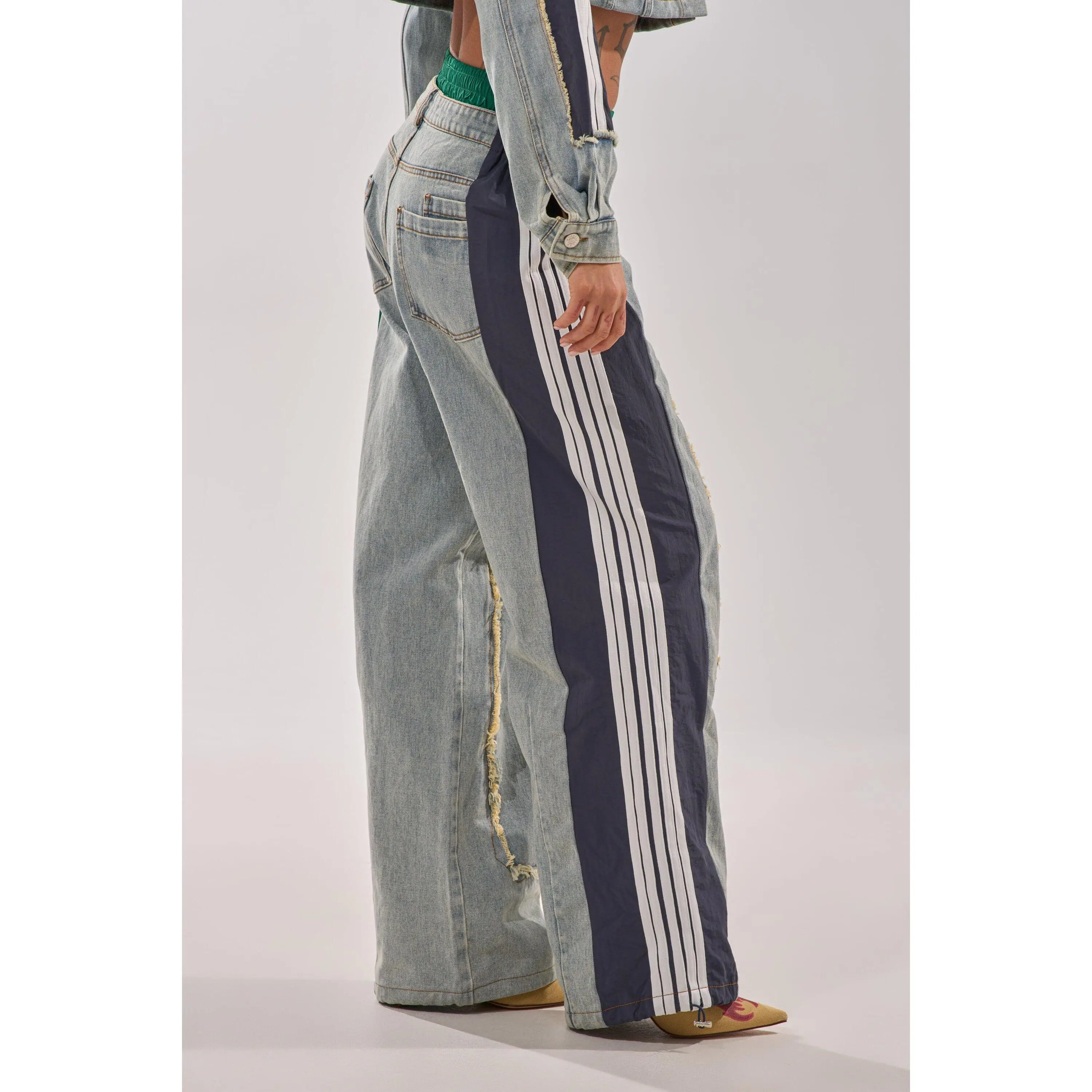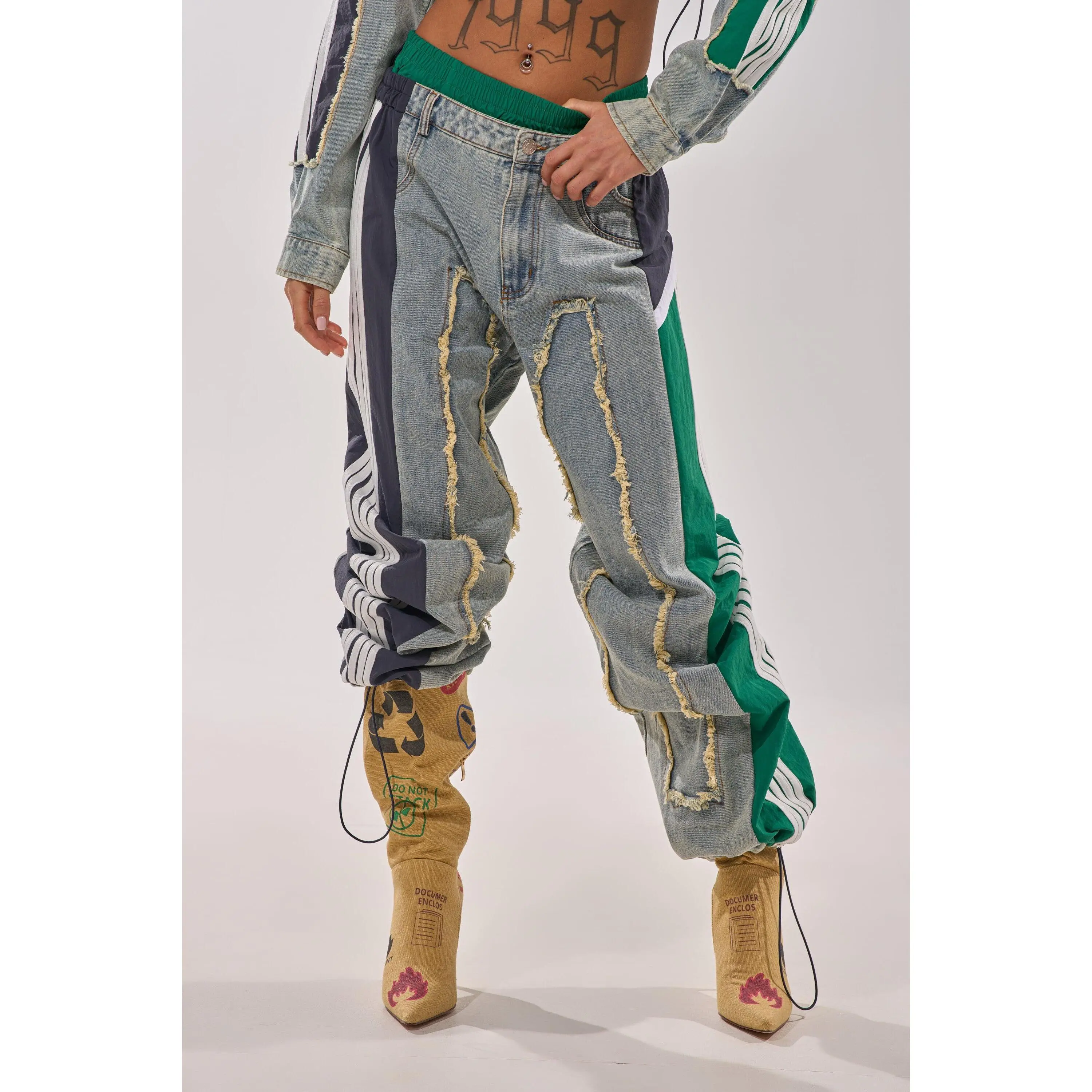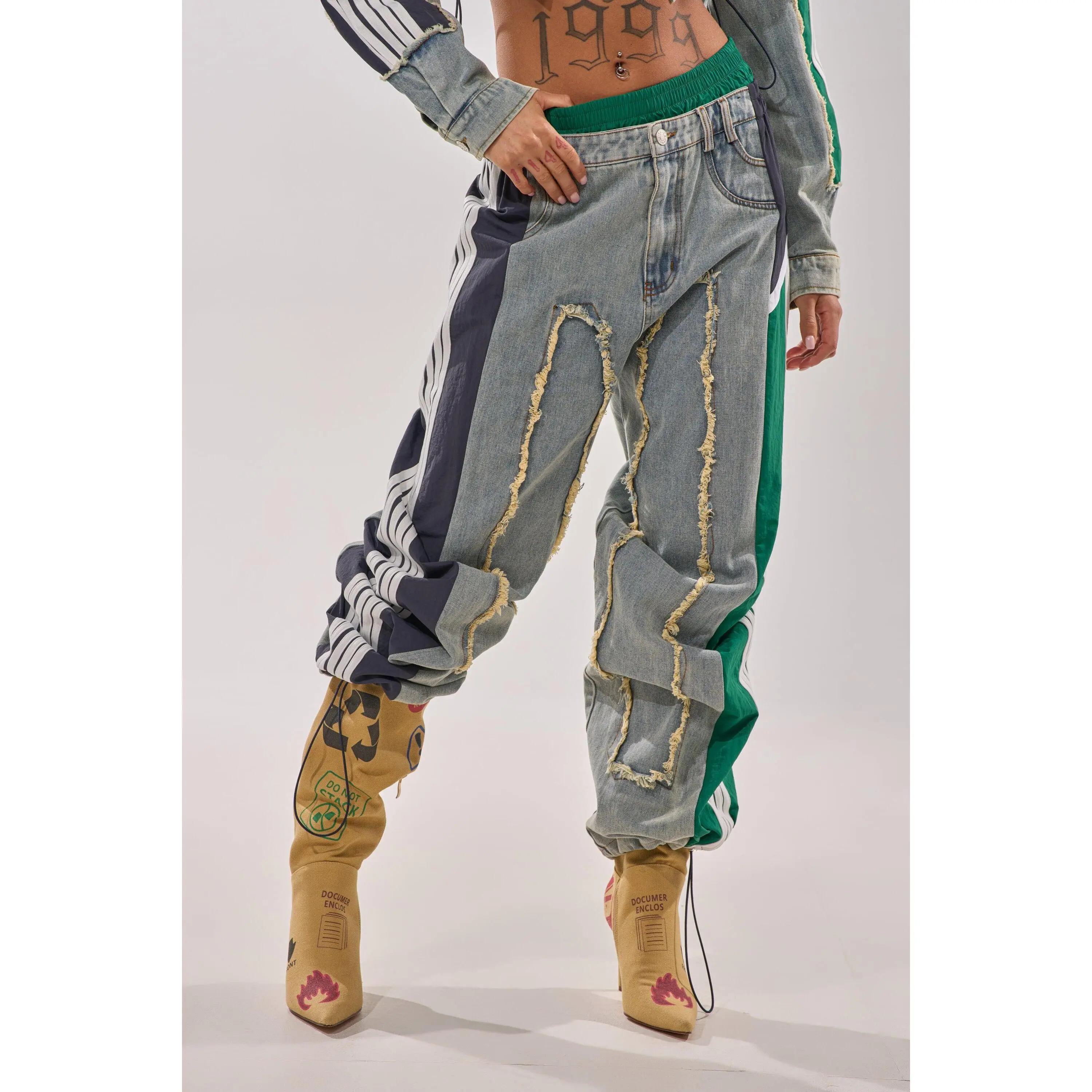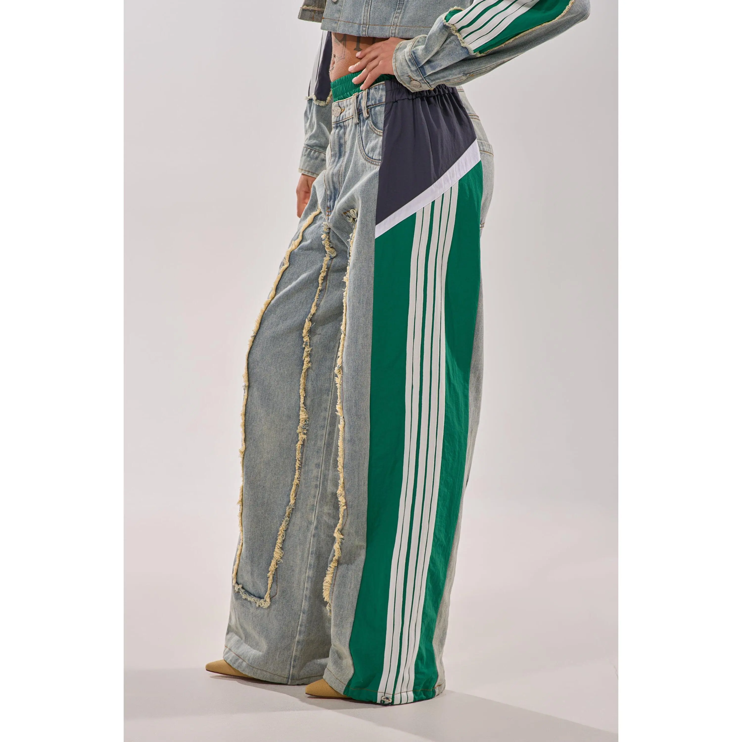 The AKIRA Label All Around The World Patchwork Denim Jogger Pant In Green Multi is a multi-fabric piece that features a non-stretch, washed denim base, distressed detailing down the front, stacked denim and shirred elastic contrast waistbands, a high rise design, functional belt loops, three back pouch pockets, and dual mock front pockets with one functional side slant pocket. Complete with color block windbreaker-inspired striped contrast paneling down the sides, a wide leg silhouette, adjustable cinched drawcord hems, a pull-on design, and a front zip button closure. Style with cropped cotton tees and platform sneakers for a finished look. - Shell 1: 93% Cotton 4% Polyester 3% Viscose, Shell 2: 100% Polyester - Little to No Stretch - Imported (all measurements are approximate from size small) - 14” Rise - 32” Inseam - Model is 5’9” Product ID: 422485