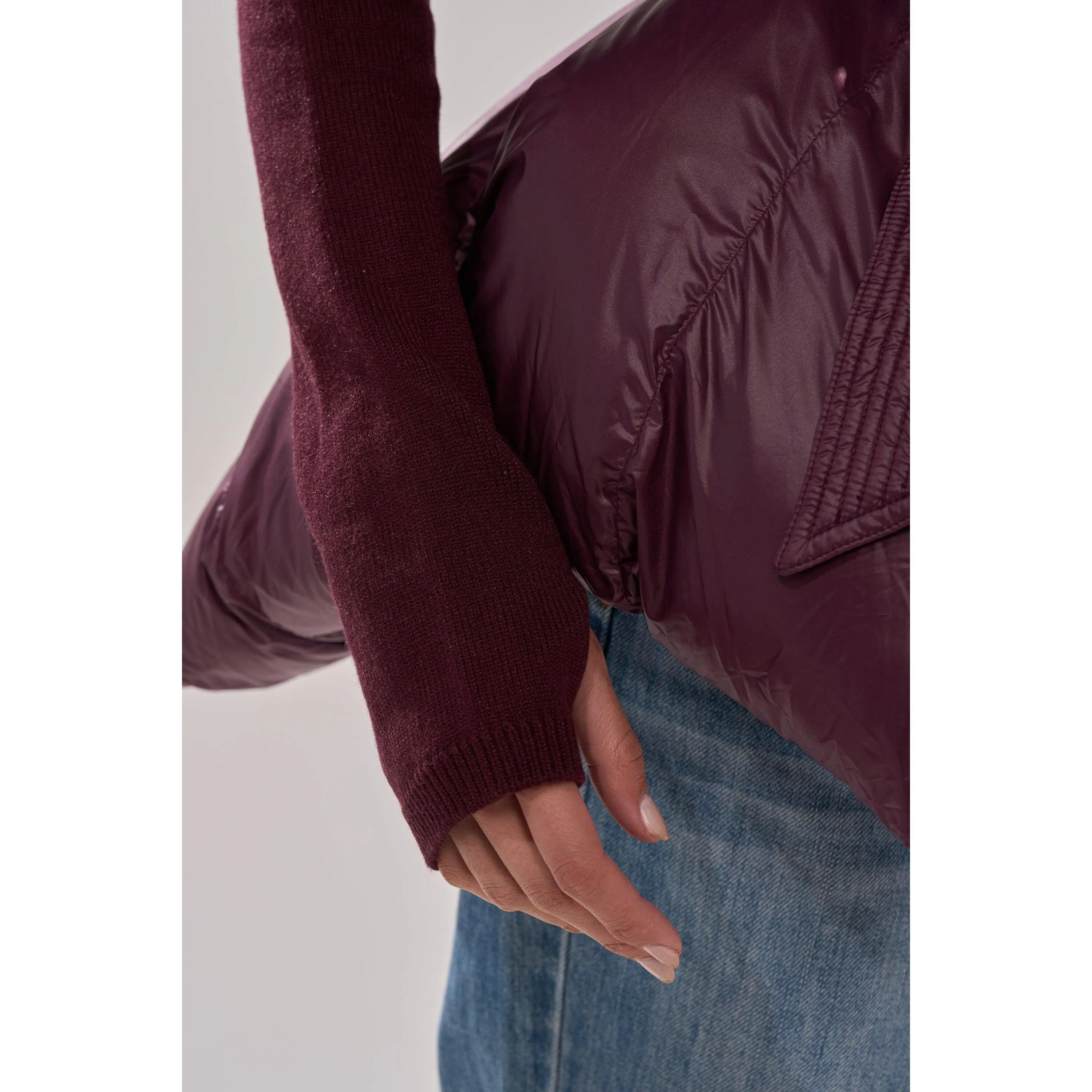 RIB SLEEVE PEPLUM PUFFER IN PURPLE