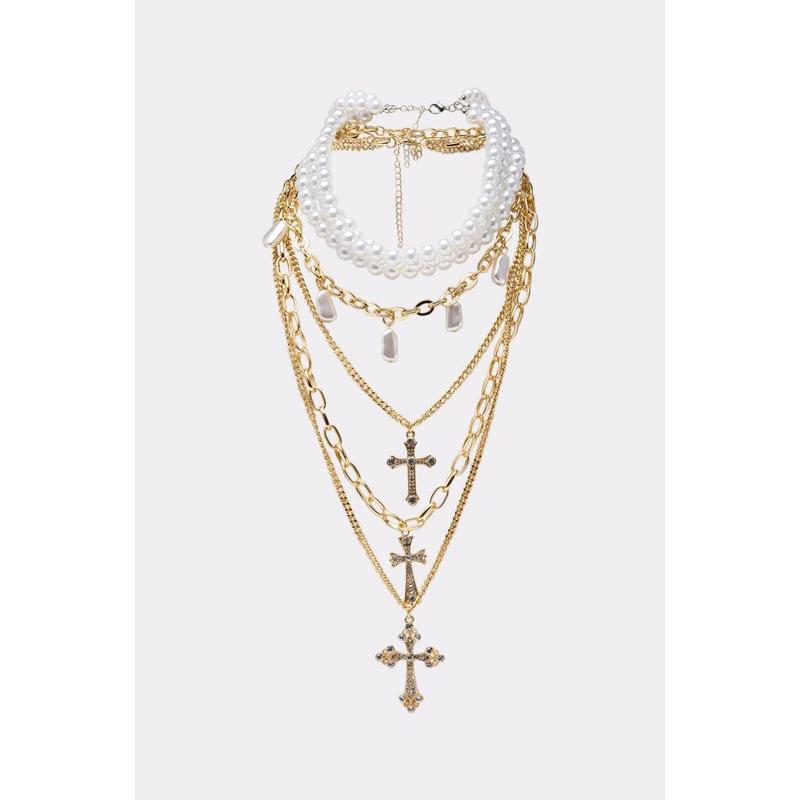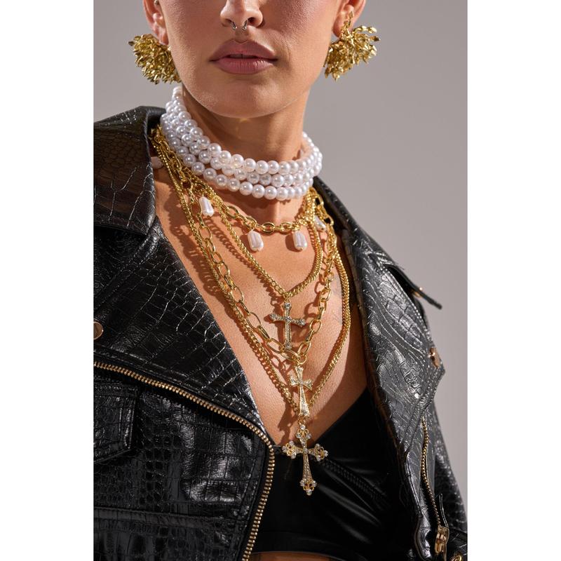The AKIRA Label Take Me On A Trip Necklace contains a set of three chains, featuring a stacked faux pearl choker, a gold-tone chain link with organic-shaped dangling pearl hardware, and a triple layered chain that boasts a mixture of chain links and cross pendants. Perfect for styling with corset tops, plunging necklines, or oversized tees, this necklace redefines power dressing with holy allure.- 100% Man-Made Materials- Imported(all measurements approximate from size O/S)- 16”, 20”, 23” Total Chain LengthsProduct ID: 1071583