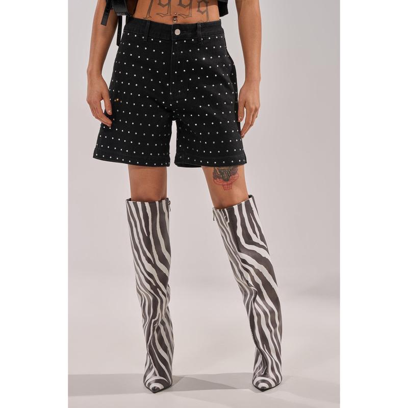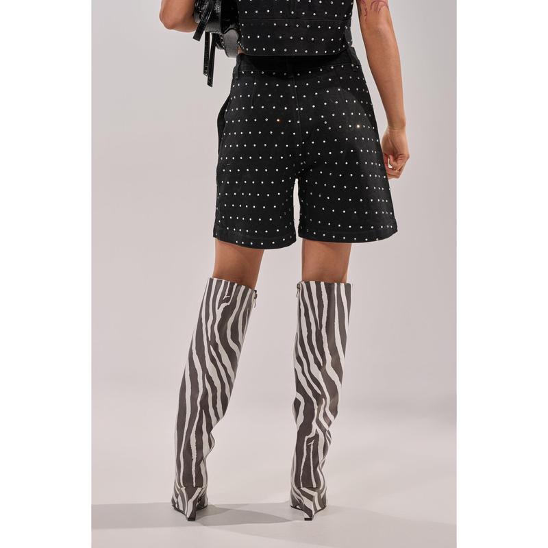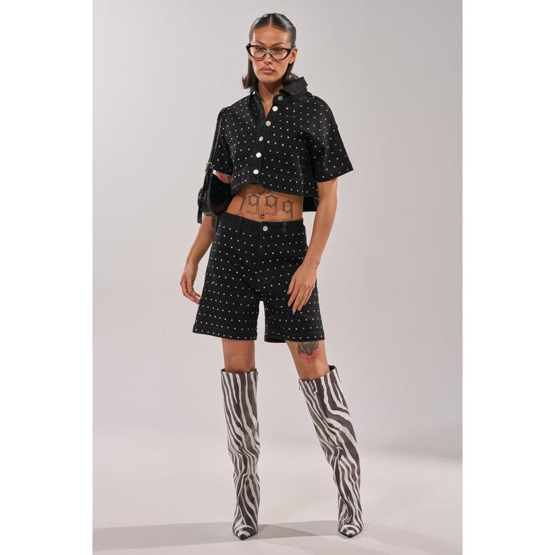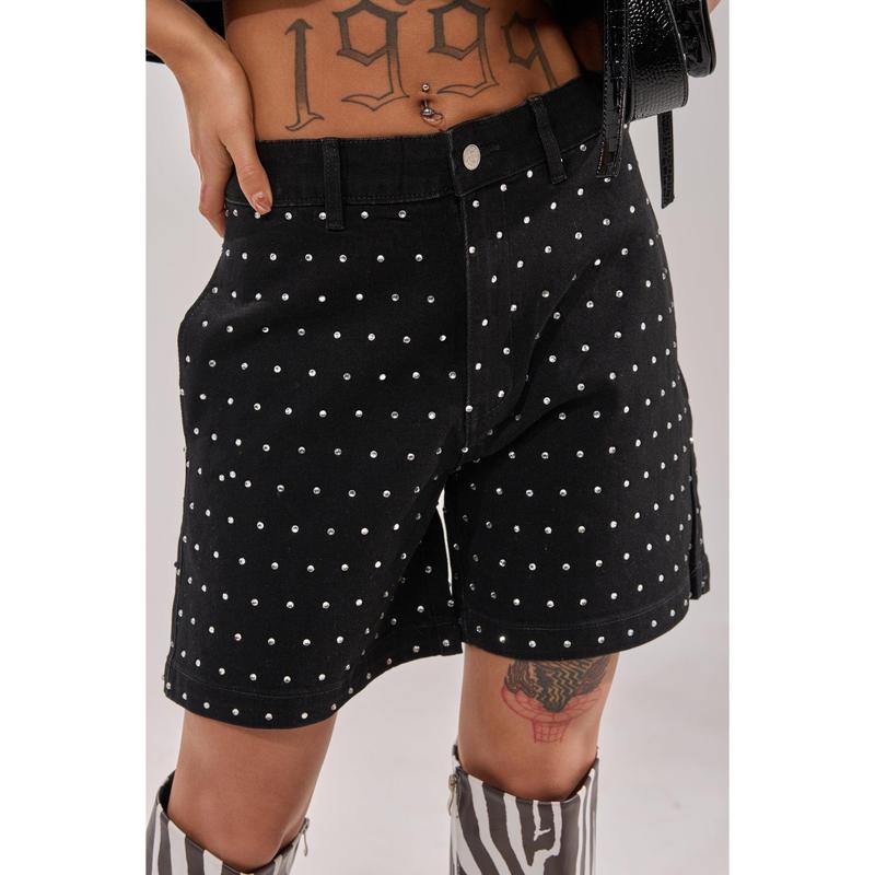 These sparkly bermuda shorts are crafted from black-wash stretch denim and adorned with rhinestones for a touch of glam. They feature a high-rise waist with functional belt loops, a button-and-zip fly closure, on-seam waist pockets, and a classic bermuda-length leg that hits above the knee. Pair them with the matching AKIRA Label It’s Giving Denim Rhinestone Button Down and strappy heels for a night-out look, or keep it chic with a blazer and pointed-toe mules for dinner and drinks.- Shell: 70% Cotton 28% Polyester 2% Spandex- Light Stretch- Imported(all measurements approximate from size small)- 12” Rise- 6” Inseam- Model is 5’7” and is wearing size smallProduct ID: 1075377(all measurements approximate from size 1X)- 15” Rise- 6.5” InseamProduct ID: 1075381