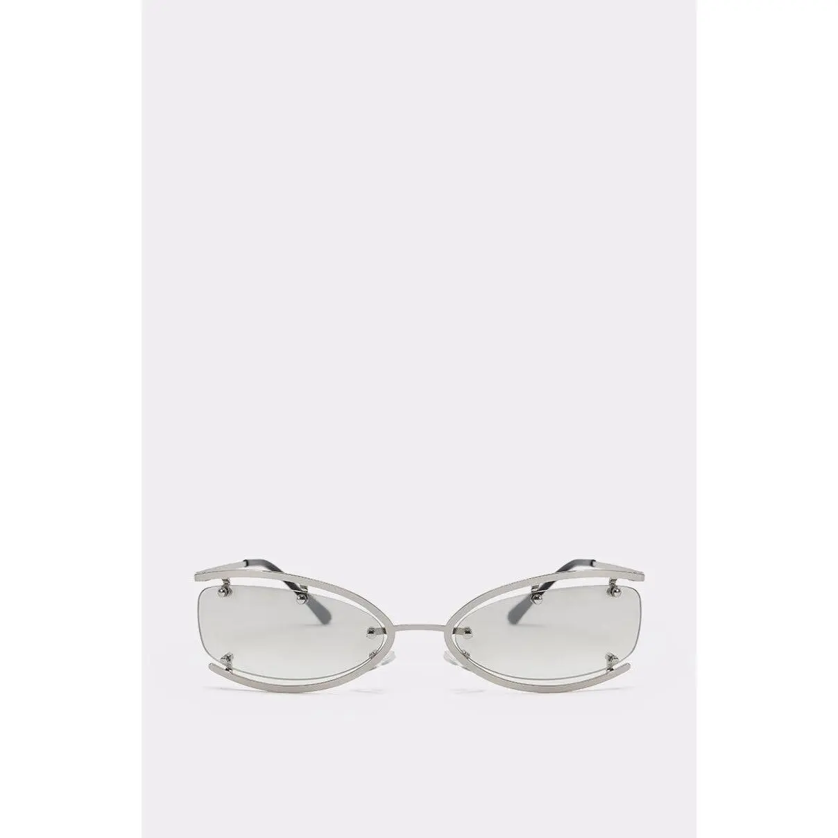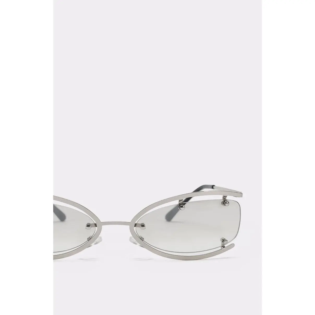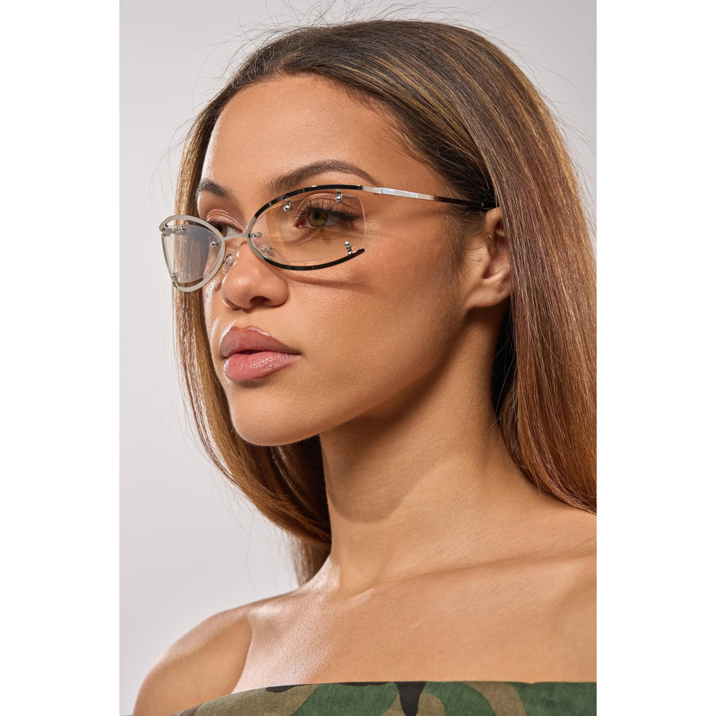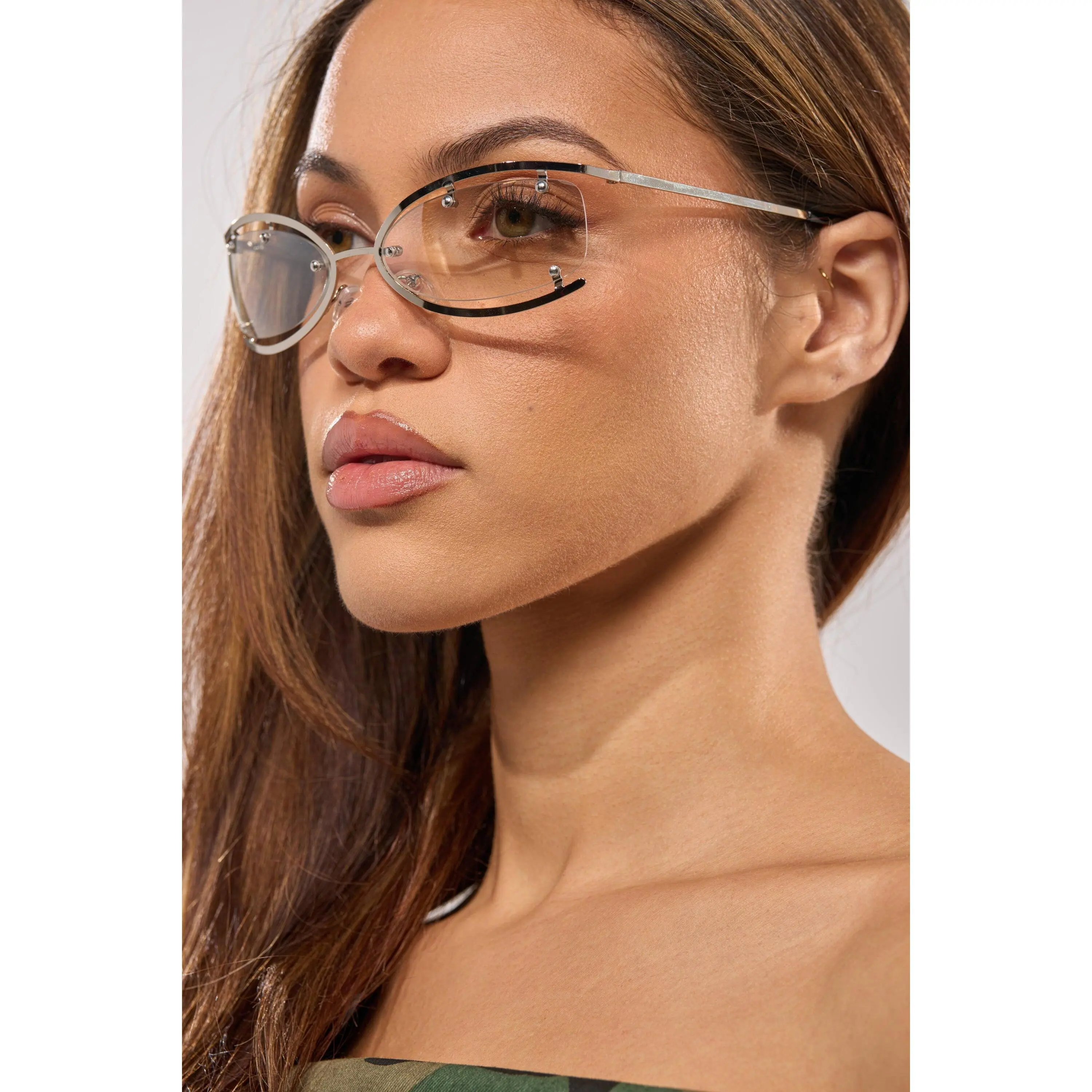 These minimalist oval sunglasses feature a lightweight silver-tone metal frame with rimless clear lenses for a clean, modern edge. Complete with adjustable nose pads and slim temple arms with plastic black endcaps, these trendy shades are perfect for everything from downtown days to late-night looks.- 100% Man-Made Materials- Imported(all measurements approximate from size O/S)- 5.75” Frame Length x 1.5” Height- 5.5” Arm LengthProduct ID: 1081994