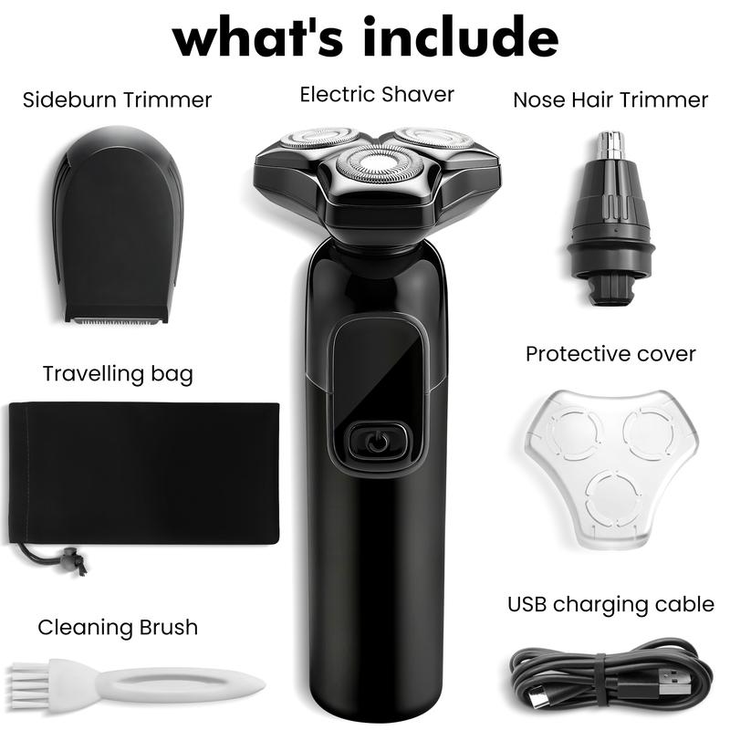 ·【Includes:Electric shaver】 2 additional trimmer attachments, travel storage case, cleaning brush, USB charging cable and user manual. Note: Power adapter not included.