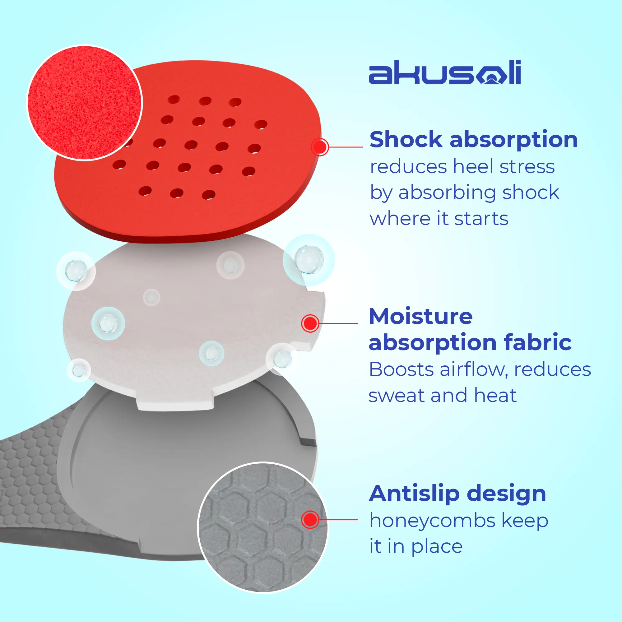 ·Superior Shock Absorption | These Akusoli heel inserts feature advanced shock-absorbing technology that protects your feet from impact. The multi-layered cushioning system reduces stress on joints while providing stability with every step