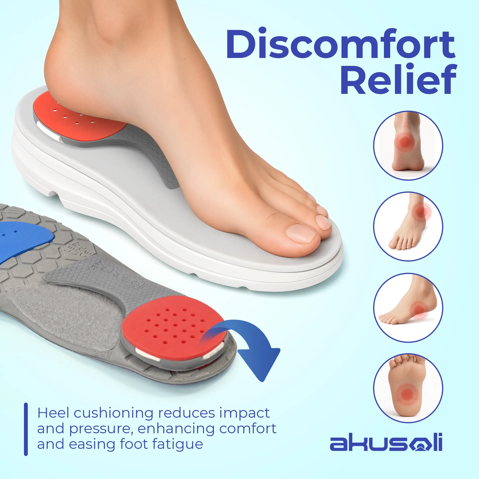 ·Instant Comfort | Our premium Akusoli heel pads provide immediate comfort by reducing pressure on your heels. The anatomically designed heel cushions distribute weight evenly, alleviating heel discomfort and discomfort from prolonged standing