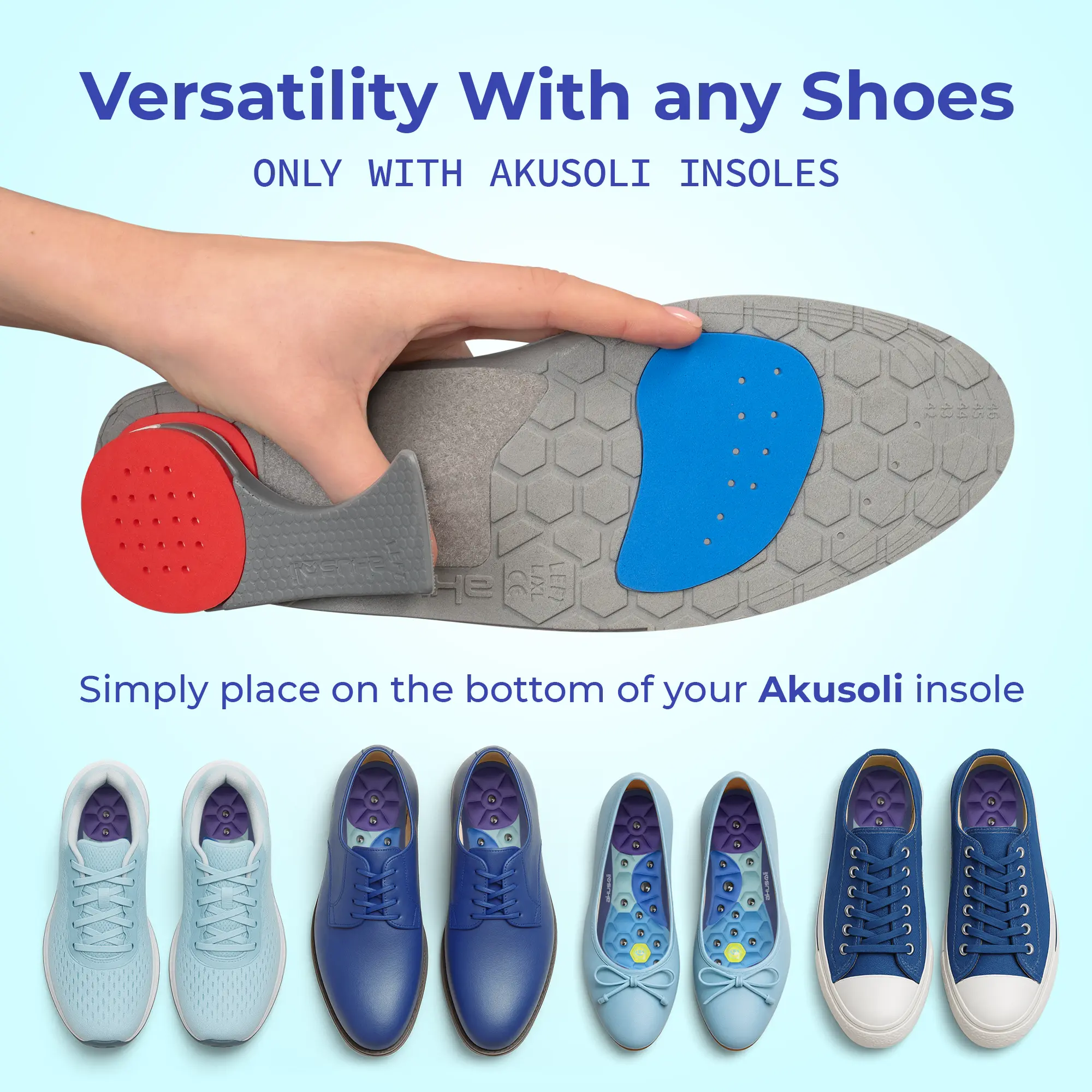 ·Universal Fit Design | These versatile Akusoli heel cushions work seamlessly with all footwear types. From dress shoes to athletic footwear, our heel inserts for women and men provide invisible support without changing your shoe size