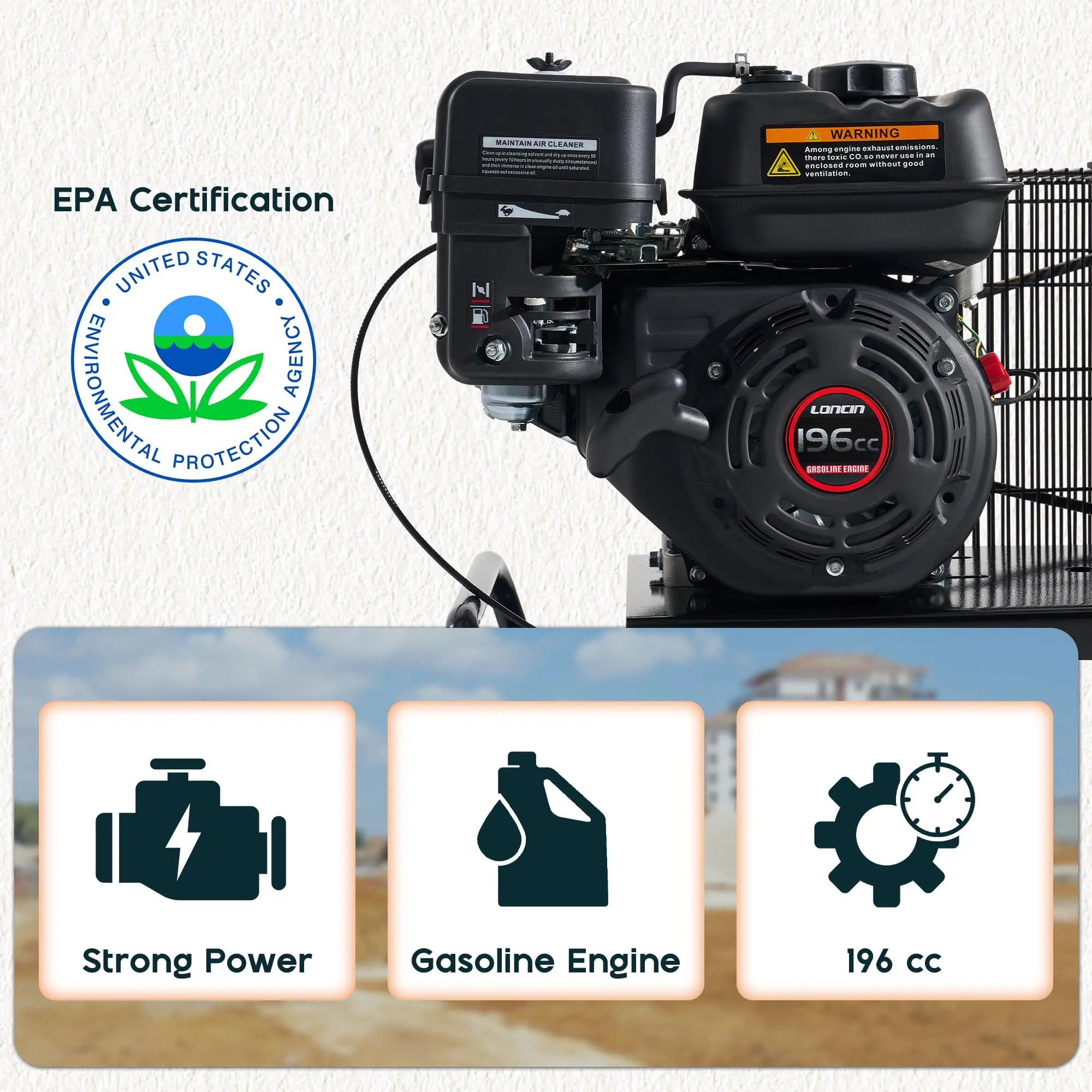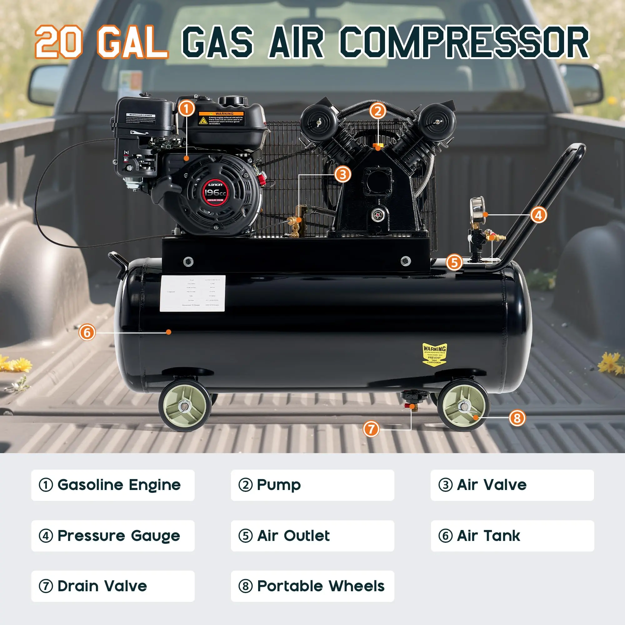 ·ASME Tank: Gas-powered air compressor with 20-gallon ASME-certified tank for safe, long-lasting air storage. Dual air outlets support two tools at once for steady airflow and improved efficiency