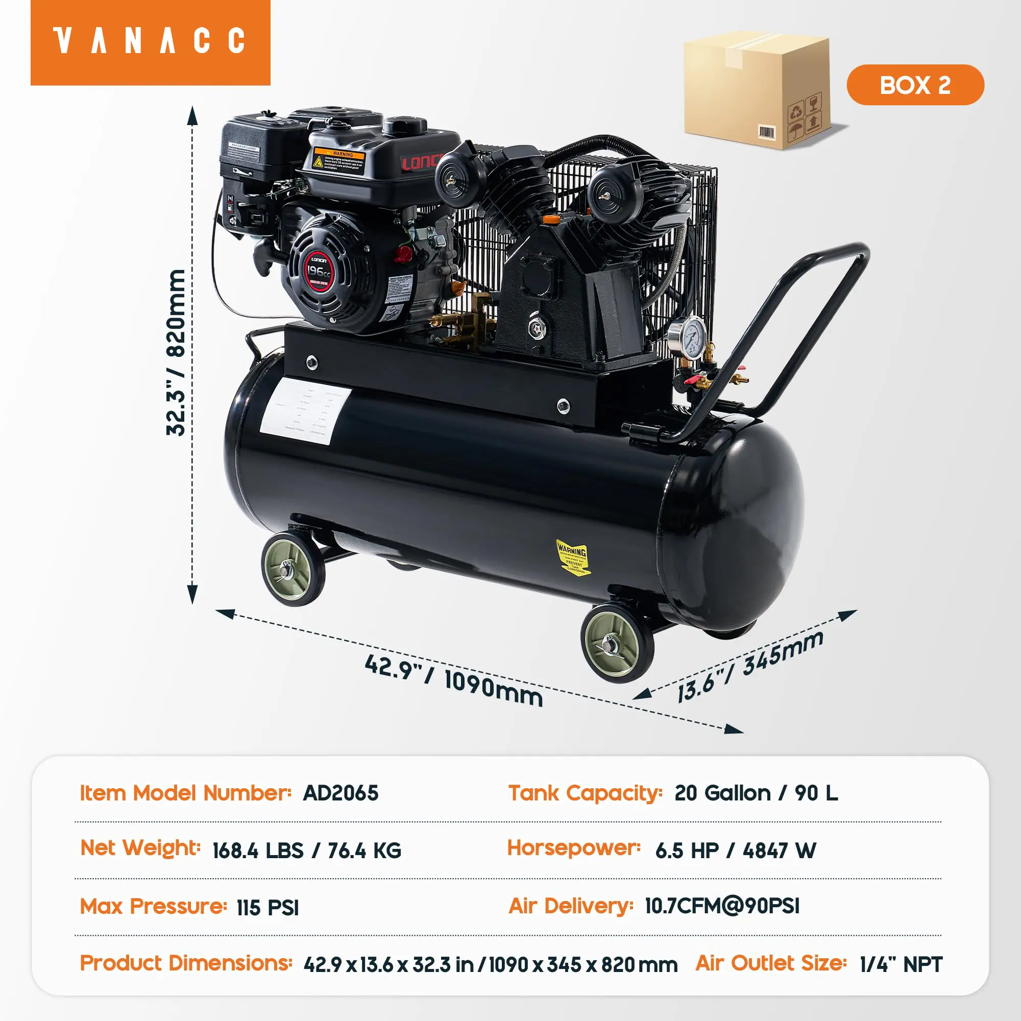 ·Specifics: EPA Certificate NO: SCGPS.1961GR-012. Type: Gas Piston Compressor. Model Power: 6.5HP. Max Pressure: 115 PSI. Air Delivery: 10.7CFM@90PSI. Tank Capacity: 8/20 Gallon. Air Outlet Size: 1/4" NPT