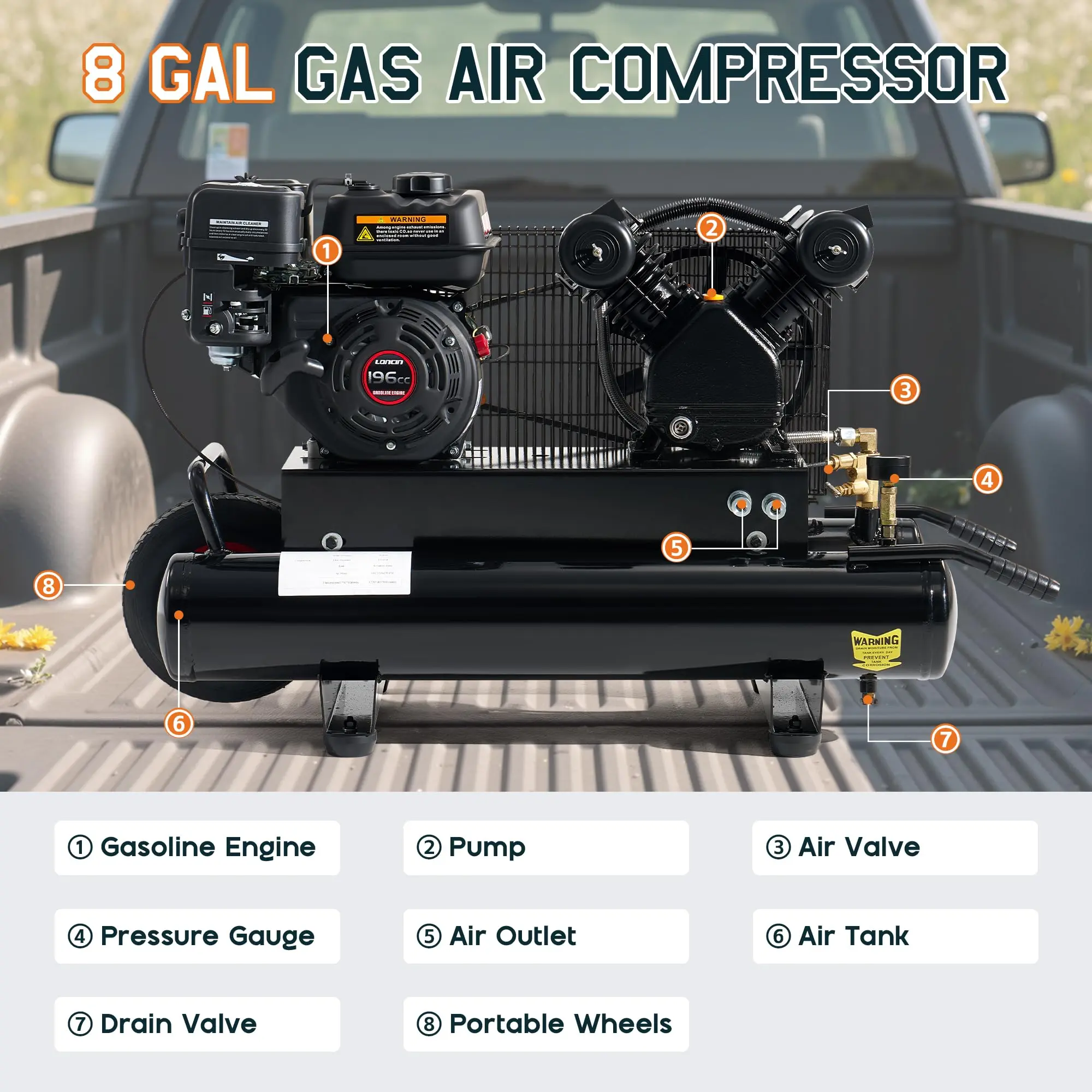 ·Gas-Powered Convenience: Equipped with an automatic safety valve, this gas air compressor offers reliable pressure control and added safety. Easy to operate and place on trucks or service vehicles for flexible use across various job sites