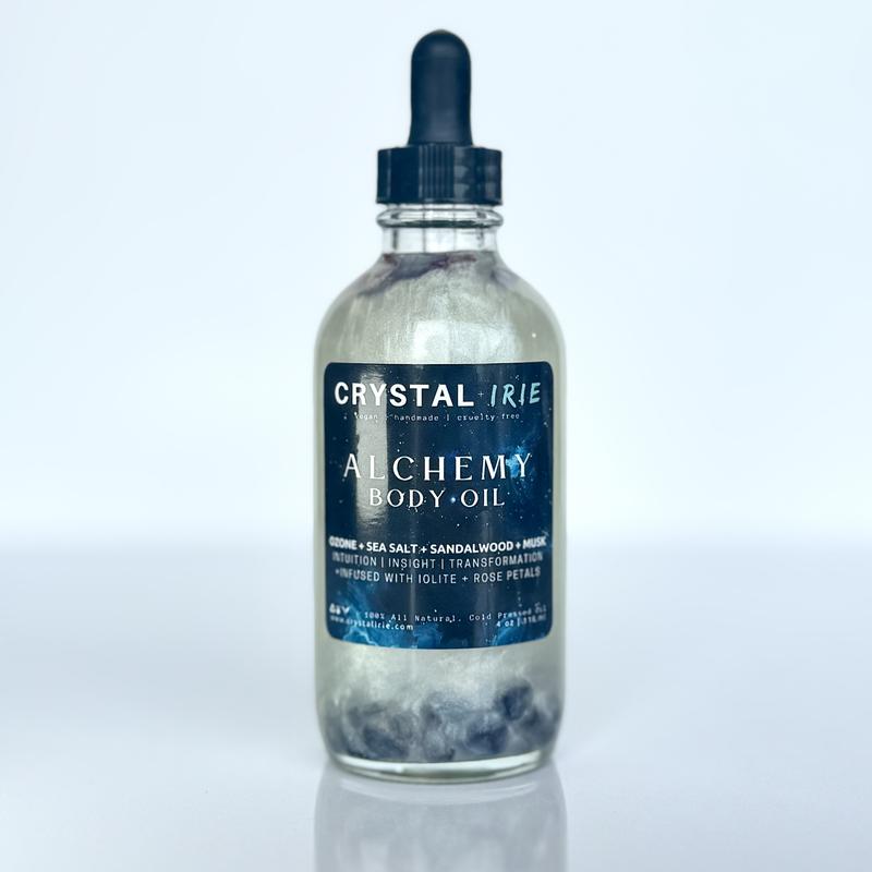 Alchemy Body Oil is infused with Iolite, the stone of "Inner voyage", to awaken intuition, deepen insight, and inspire transformation with clarity and purpose. Acting as a spiritual compass, Iolite helps transmute uncertainty into wisdom, sharpen inner vision, and reveal hidden paths. It harmonizes emotions, restores balance, and empowers you to embrace change like an alchemist turning lead into gold. Paired with delicate rose petals, this shimmer oil embodies balance, creativity, and the courage to evolve. Scented in a seductive blend of airy Petitgrain, Ozone, Sea Salt, Plum, Eucalyptus, Sandalwood and Dark Musk for an evocative fragrance that lingers on the skin.