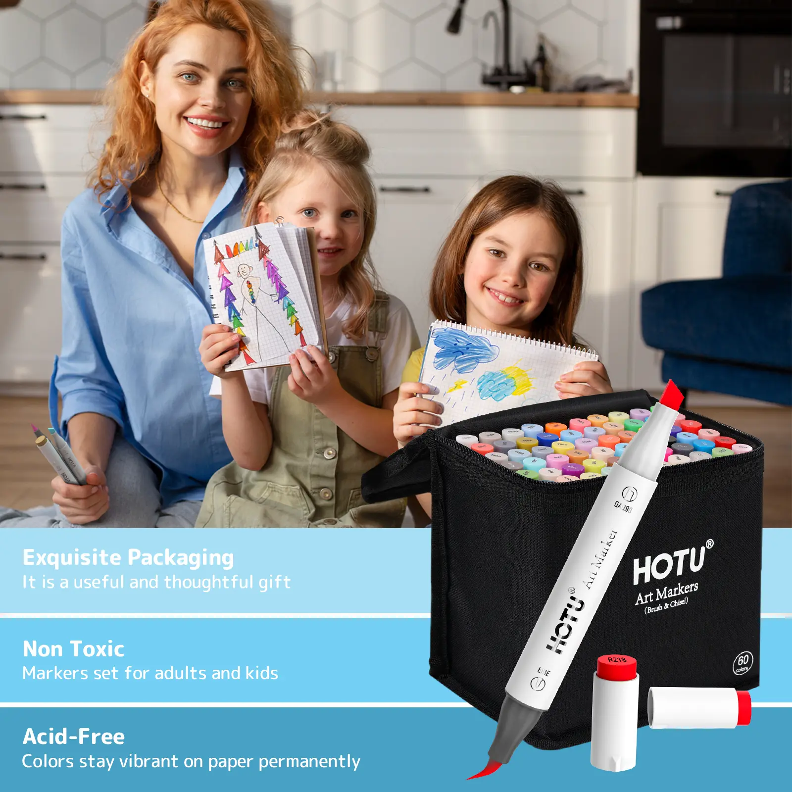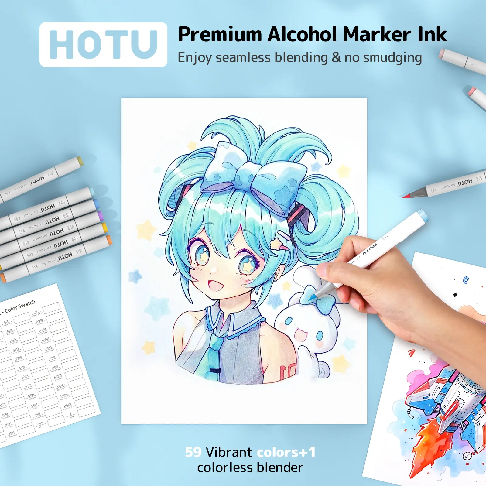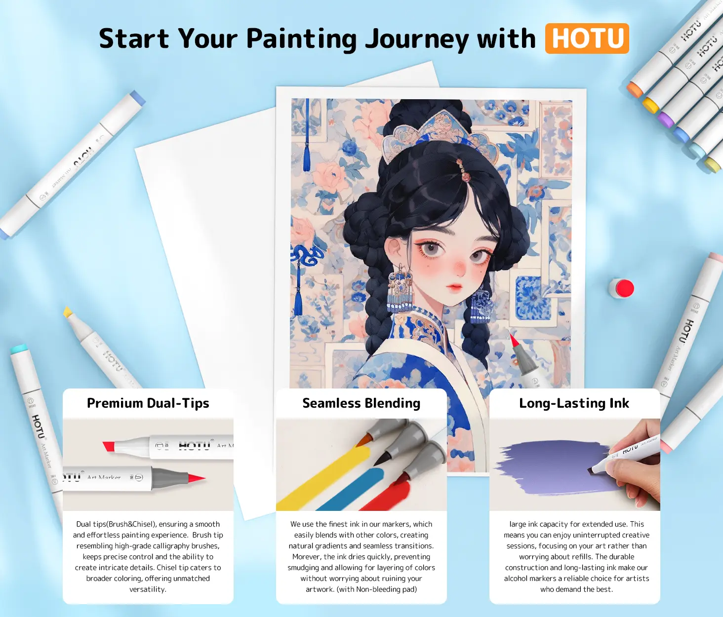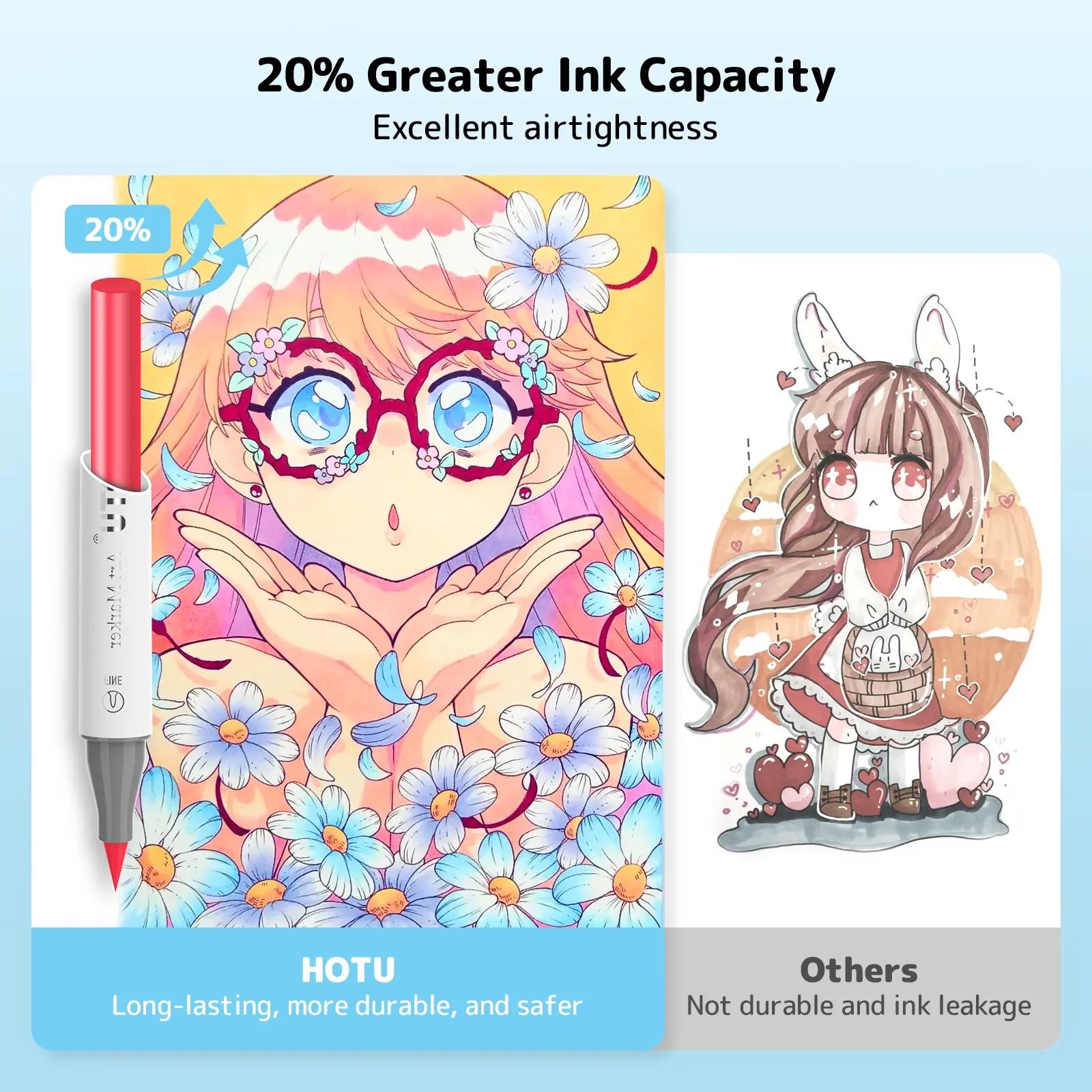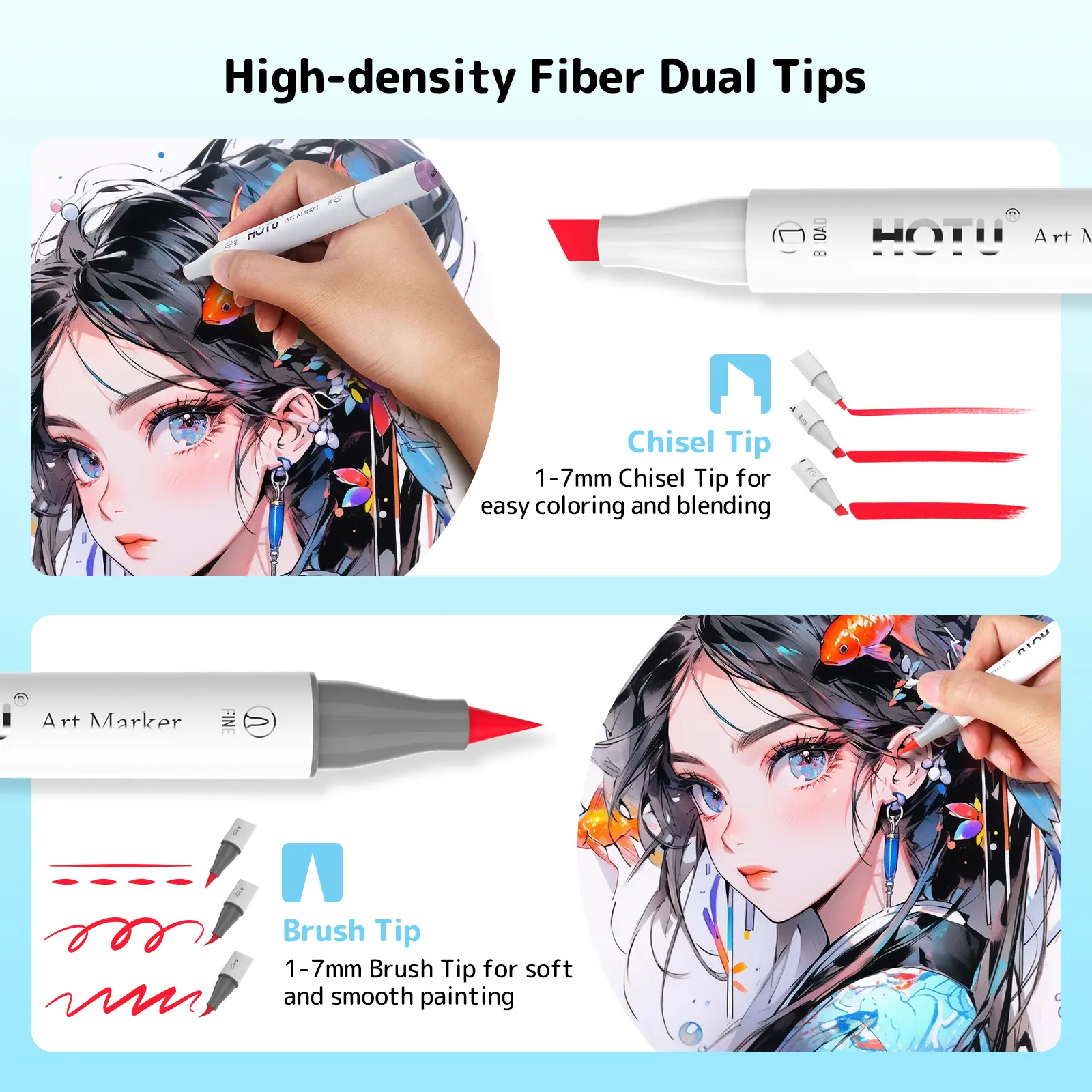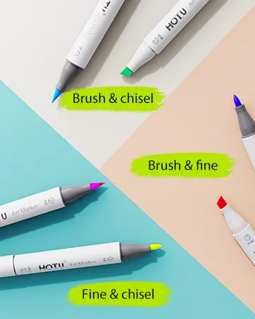 ·DURABLE DUAL TIPS & HIGH QUALITY INK: 1 - 7mm chisel tip for coloring and drawing thick lines; 1mm fine tip is for depicting shadows and outlining details. HOTU alcohol markers using premium ink are more delicate, which have excellent blending and layering ability for seamless transitions and mixing. Perfect for both beginners and experienced artists. Moreover, they also boast good color stability and are water - resistant and sun - proof, ensuring your artworks remain vivid and beautiful, withstanding time gracefully.