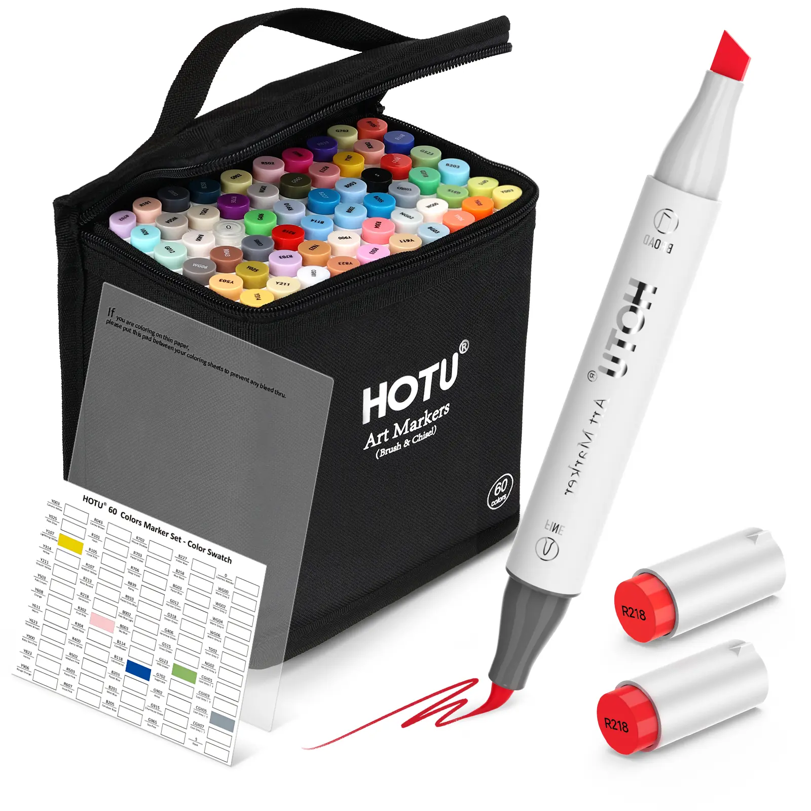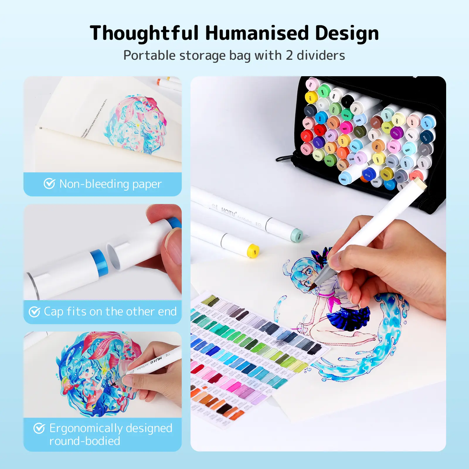 ·THOUGHTFUL HUMANISED DETAIL: Art markers come with a non - bleeding pad to prevent ink bleeding. A 4 - divider storage keeps the markers upright and in place, making it easier to organize. The ergonomic design provides a comfortable and soft grip, making it less tiring to hold. Alcohol markers with uniquely color - coded caps make color identification and organization easy. What's more, the cap can be placed on the other end of the marker, so it's not easy to lose, and the small raised design prevents it from slipping. (NOTE: Like all other brand alcohol - based markers, they will bleed through regular coloring paper, except very thick paper or marker paper.)