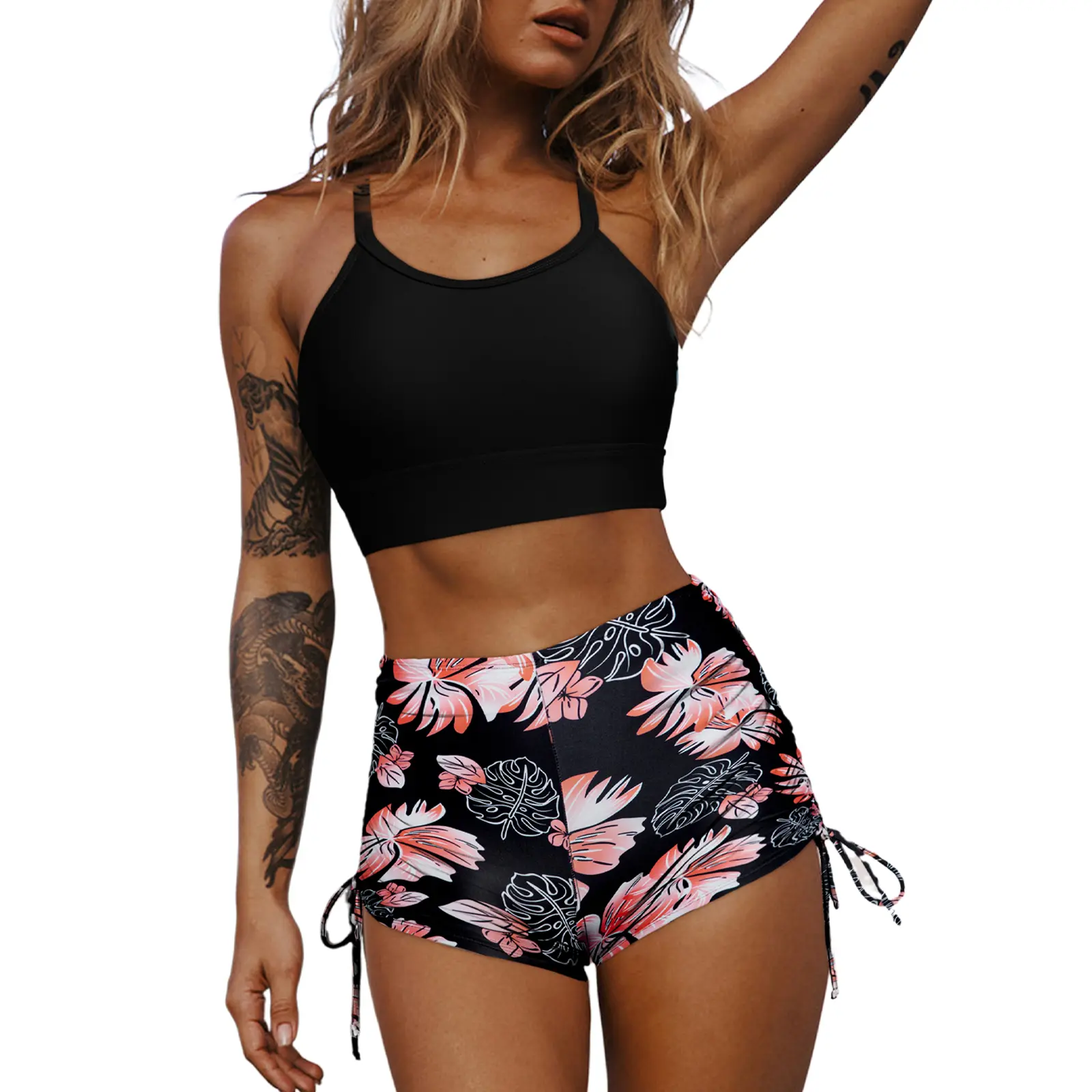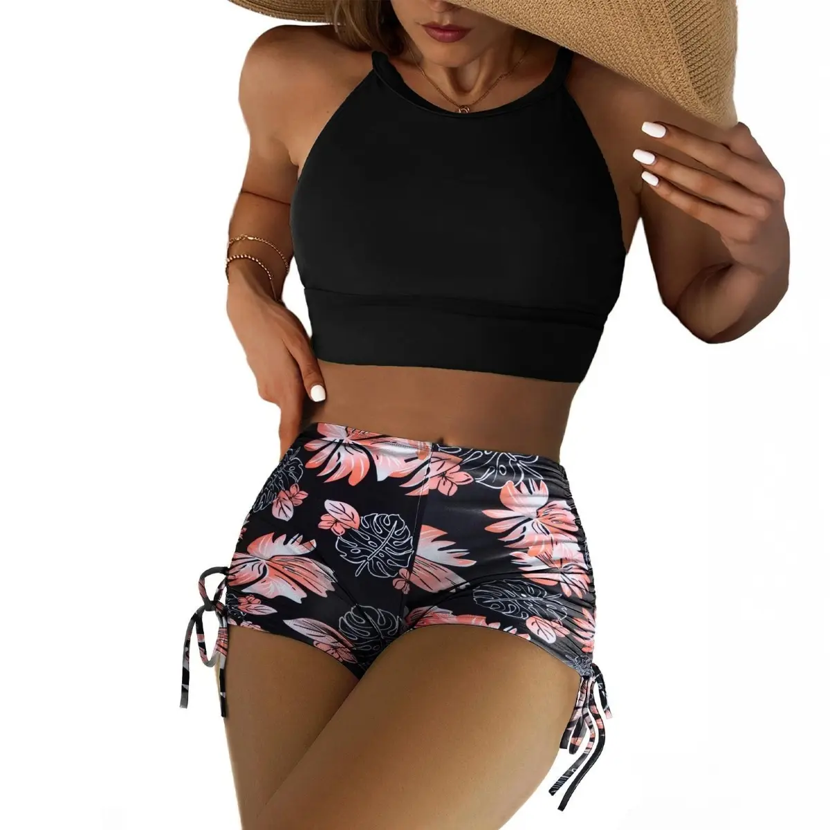·Swim Shorts: Floral print, high-waisted design with tummy control, ruched sides, and an adjustable drawstring in a boyshort style for extra coverage and ease of movement.