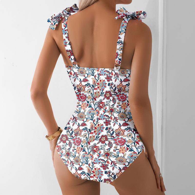 Aleumdr Women's One Piece Swimsuits Tummy Control Bathing Suits V Neck Boho Tie Shoulder Ruched Full Coverage Swimwear