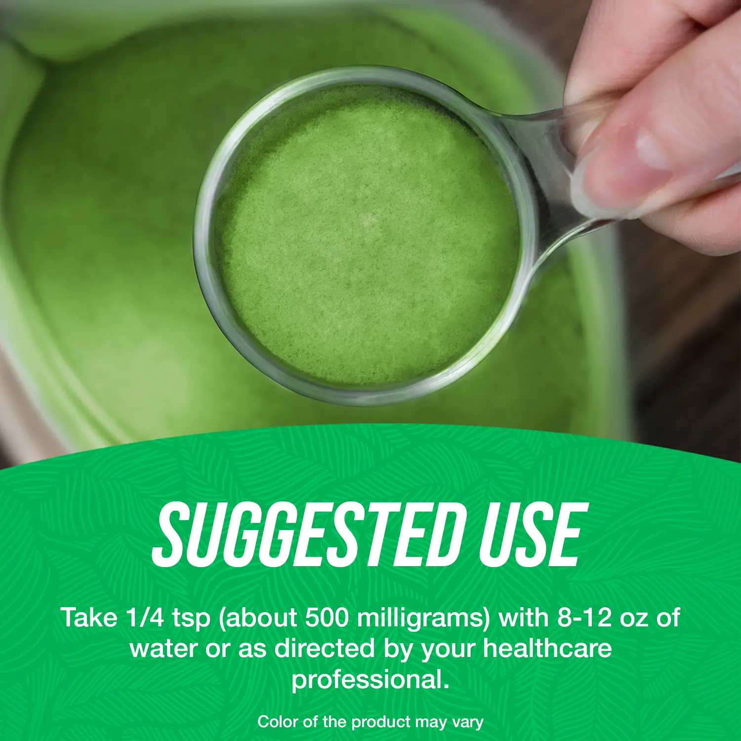 Suggested Use: As a dietary supplement, take 1/4 tsp (about 500 milligrams), or as directed by your healthcare professional.
