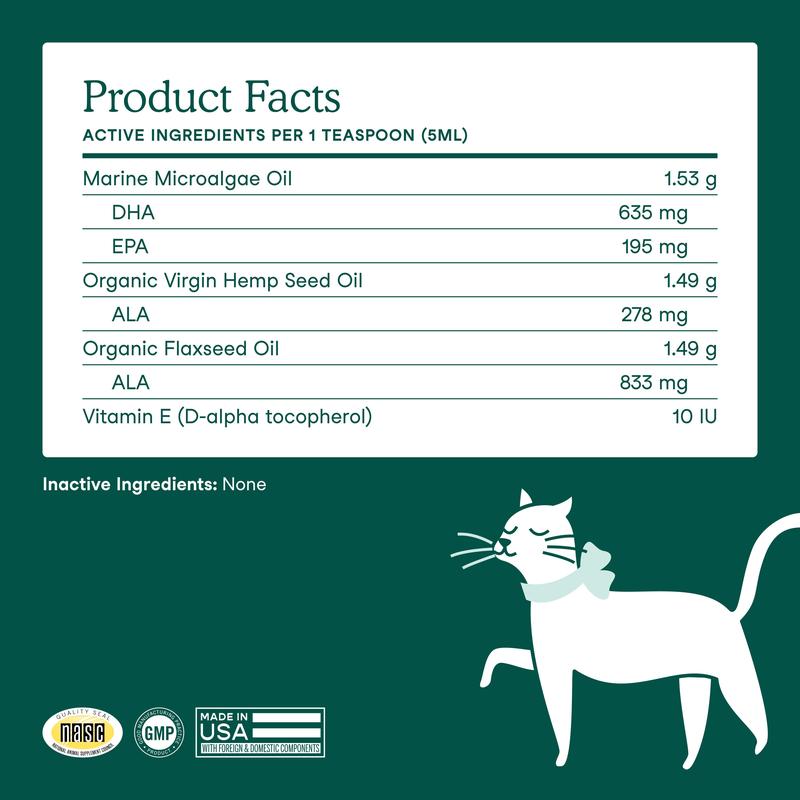 The algae based omegas are so perfect for all my critters. I have them in a dropper bottle i refill so each kitty gets drops in their wet food and dogs get whole dropper amounts. I had a cat with skin and sinus allergies , who was constantly going to the ver. After having her on the omegas and the mushroom blend for a few months her symptoms disappeared! She no longer takes vet meds and her coat is shiny and healthy.