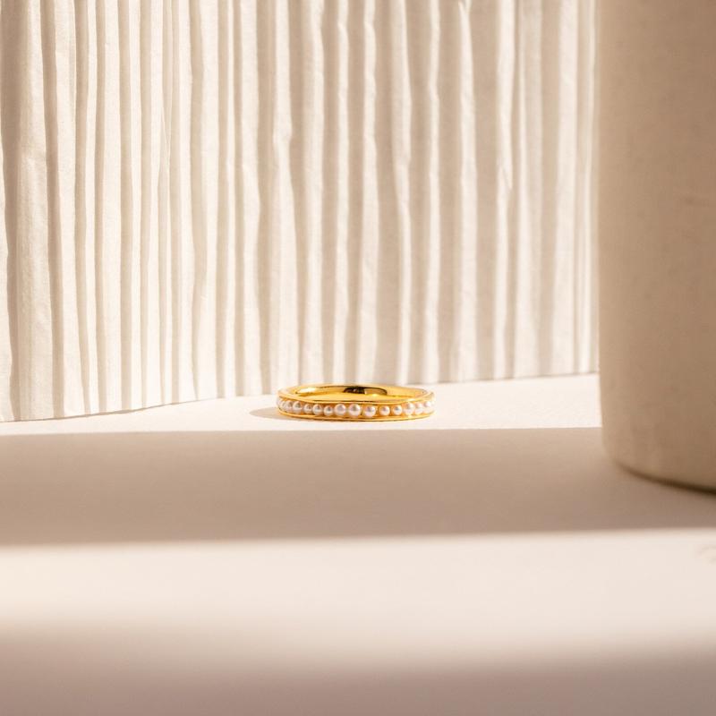 Our Alicia Pearl Ring is surrounded with dainty pearl beads and is easy to stack with other rings in your collection. The minimalist design adds elegance and a delicate touch to this ring.
