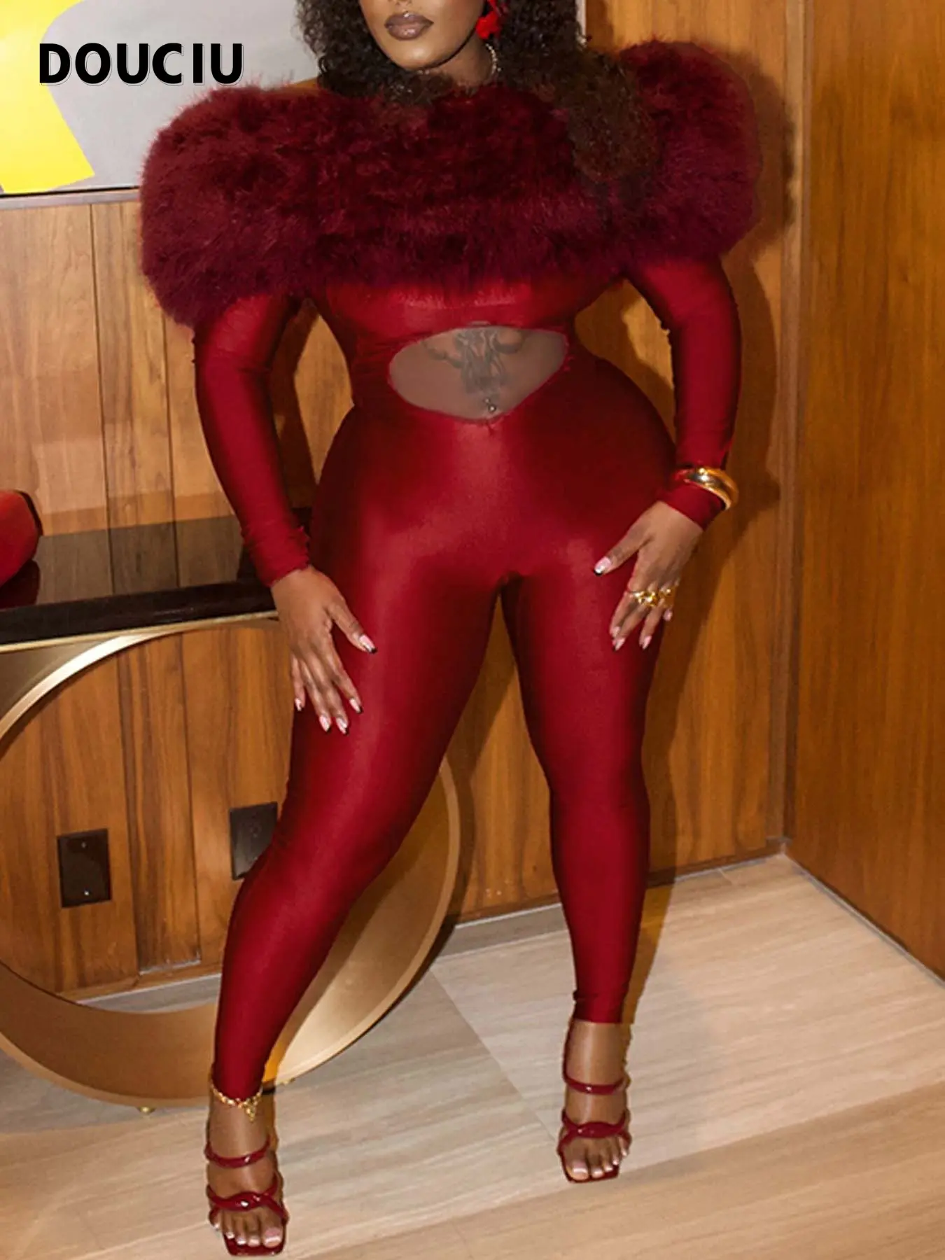 5. DOUCIU Party Bar Nightclub Cocktail Social Trend Street Personality Sexy Hot Women'S Thin Solid Color Alien Plush One Shoulder Long-Sleeved Jumpsuit