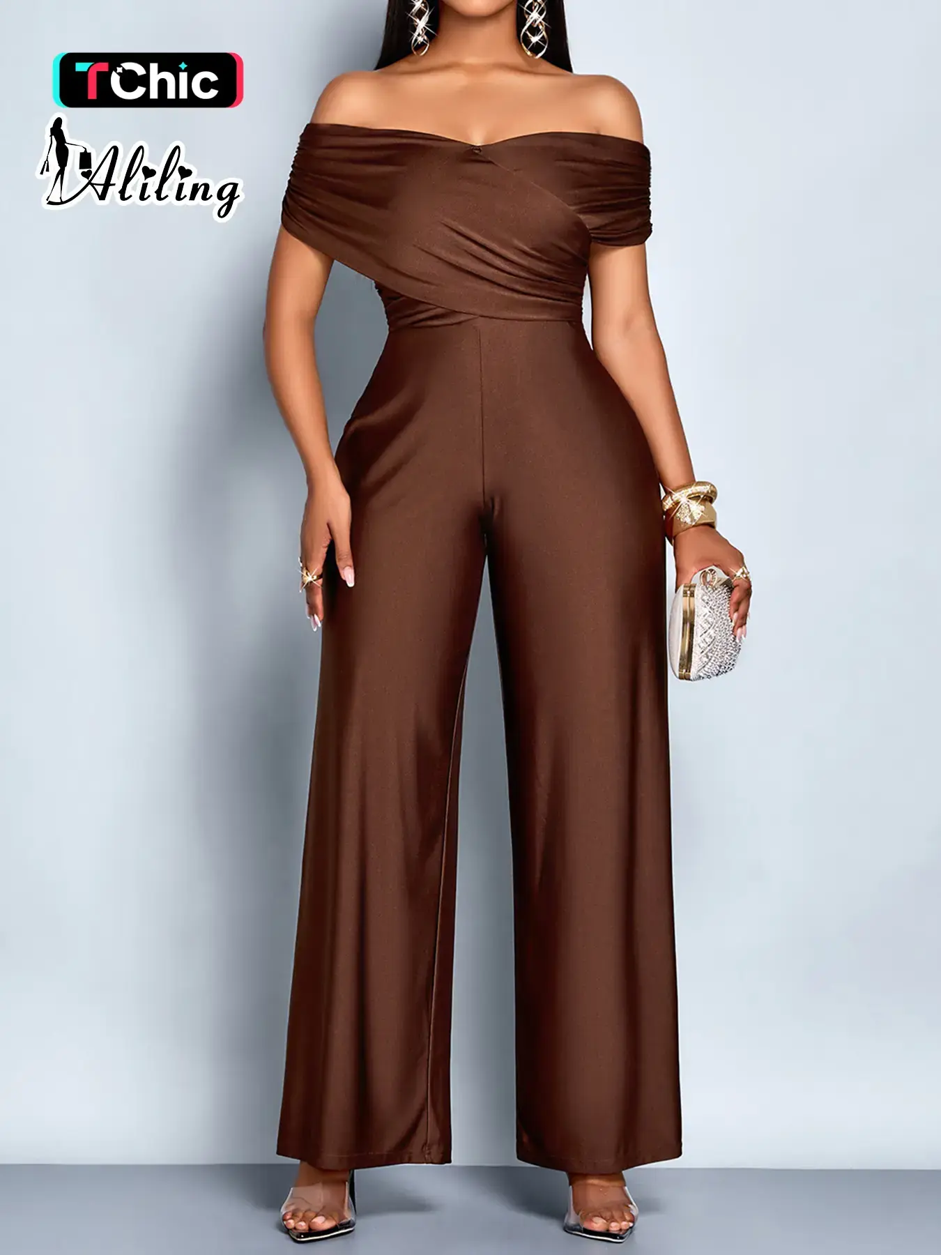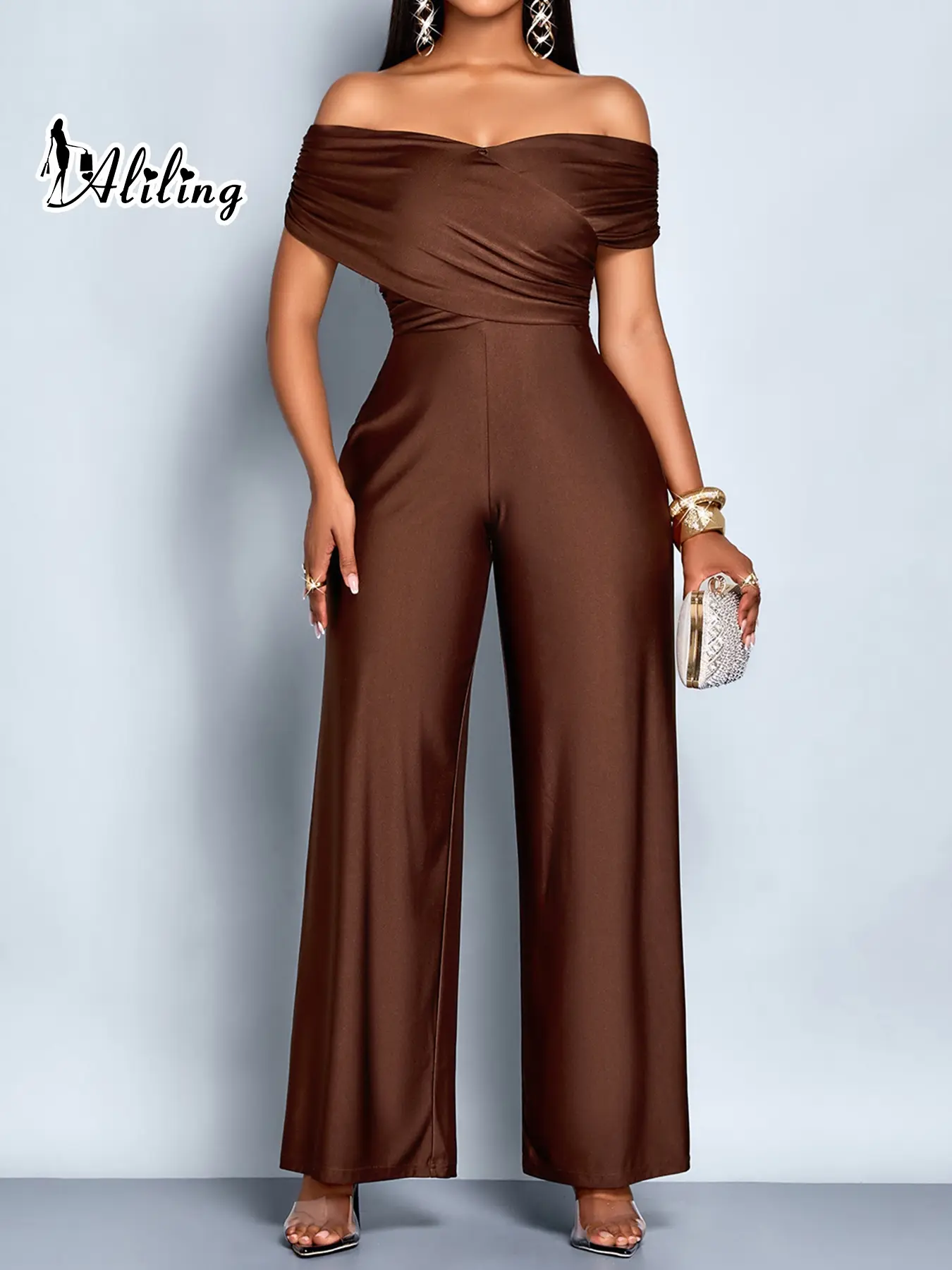 5. Aliling Elegant Casual Women's Solid Color One-Piece Jumpsuit, Shoulder Cut Out High Waist Straight Leg Pants, All Seasons Slim Fit