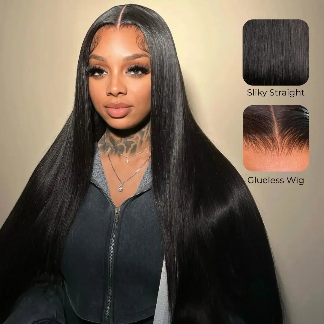 This wig features 250% density and silky smoothness. It's a 12A grade human hair wig, offering a glueless, ready-to-go solution. Experience the convenience of a lustrous straight style without hassle.