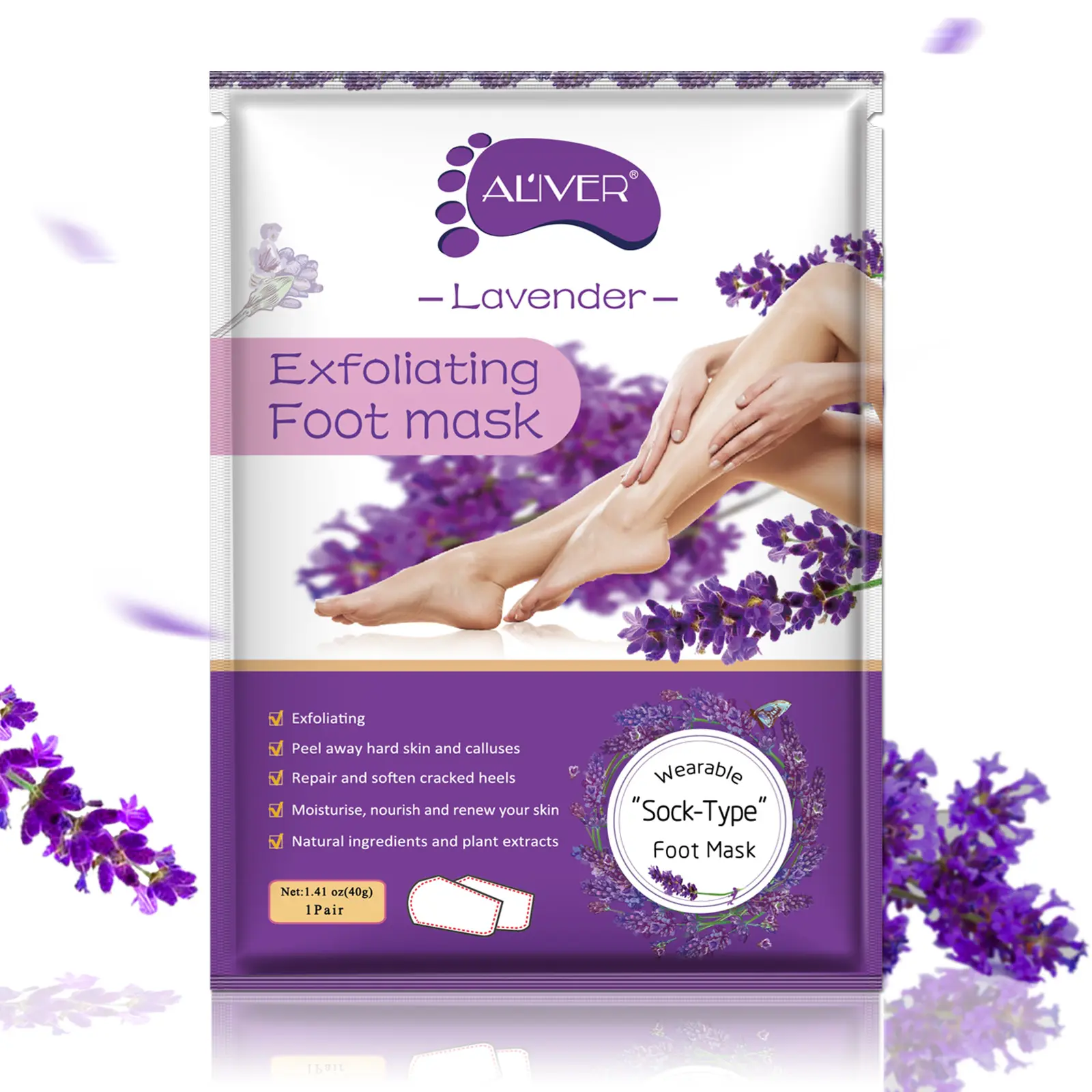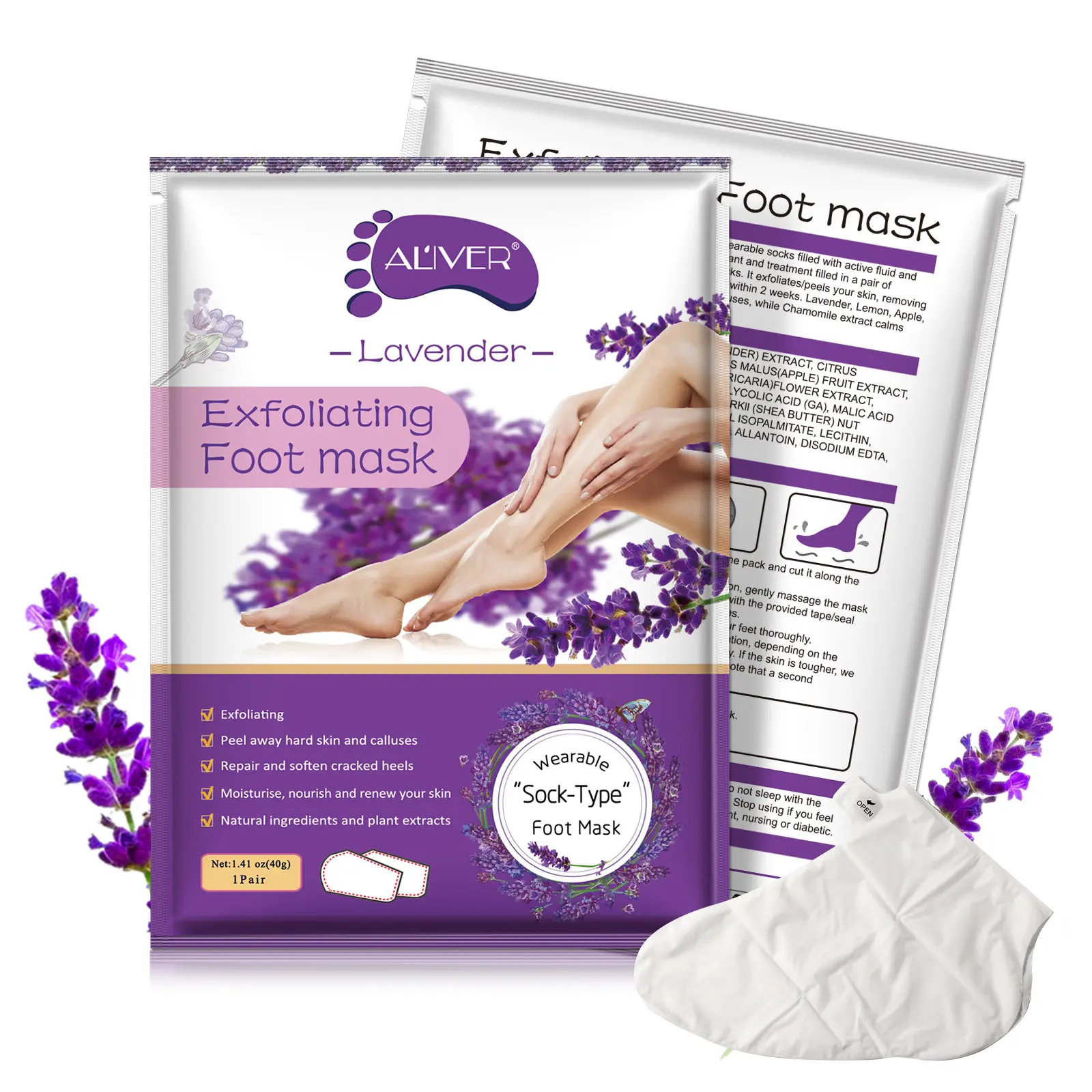 Lavender exfoliating-peeling foot mask in the form of wearable socks filled with active fluid and vitamins. The Aliver exfoliating foot mask is a foot exfoliant and treatment filled in a pair of wearable socks. Put on the mask as you would your socks. It exfoliates/peels your skin, removing calluses and dead skin cells, visibly smoothing your feet within 2 weeks. Lavender, Lemon, Apple, Orange, and other natural botanical extracts remove calluses, while Chamomile extract calms freshly exfoliated skin.