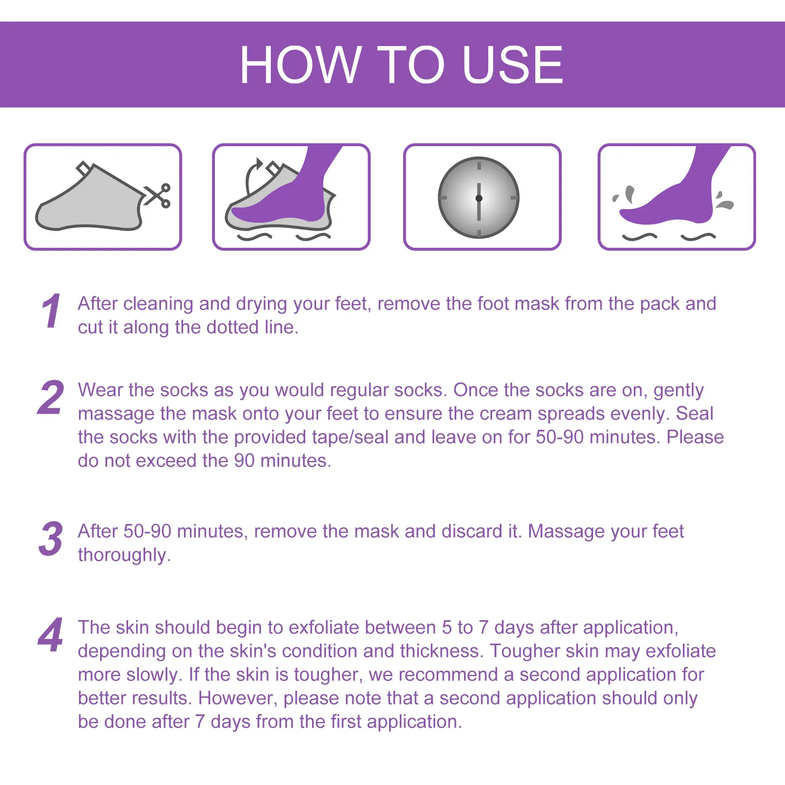 2.Wear the socks as you would regular socks. Once the socks are on, gently massage the mask onto your feet to ensure the cream spreads evenly. Seal the socks with the provided tape/seal and leave on for 50-90 minutes. Please do not exceed the 90 minutes.