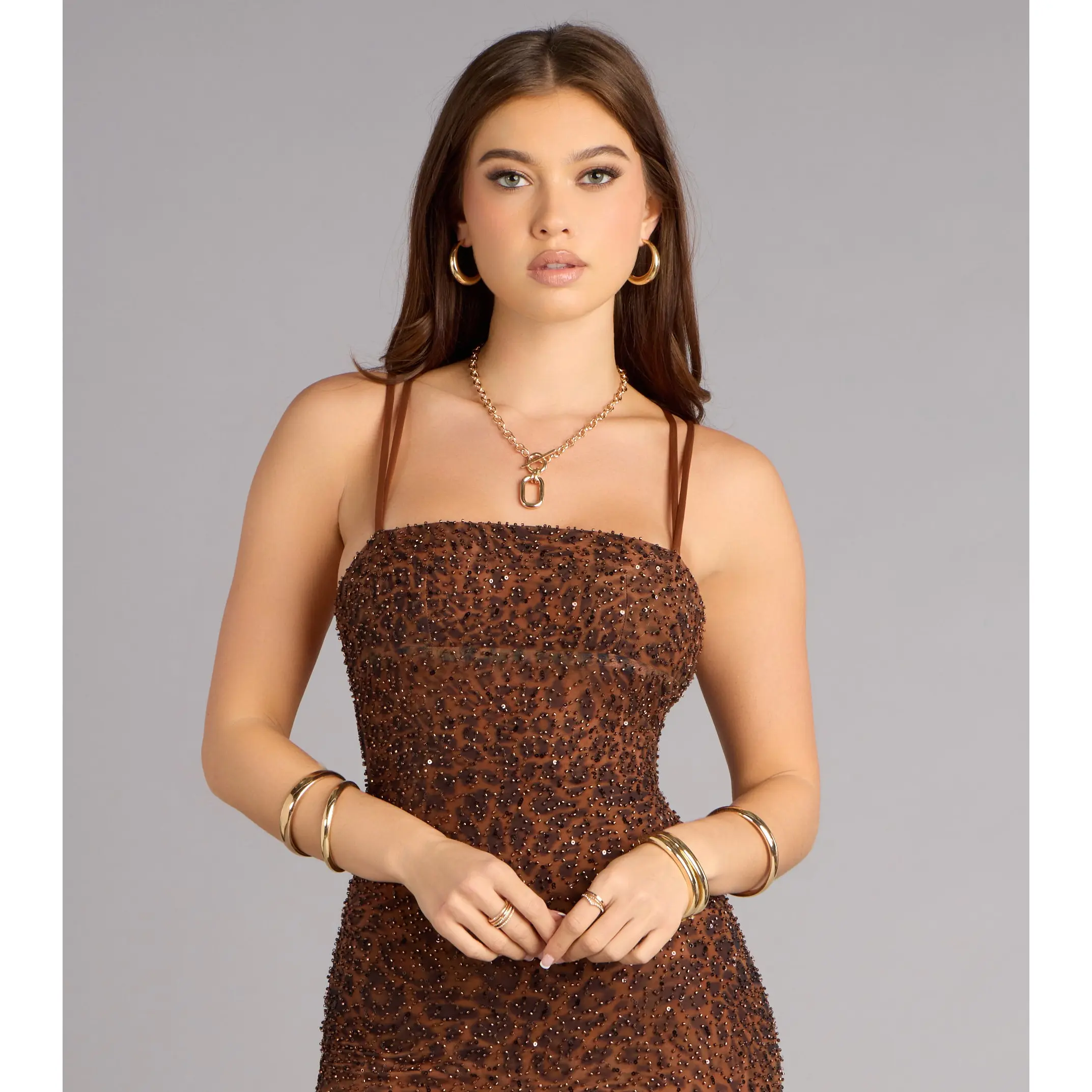 ·Leopard print mesh-lined beaded fabric with subtle sequin shimmer