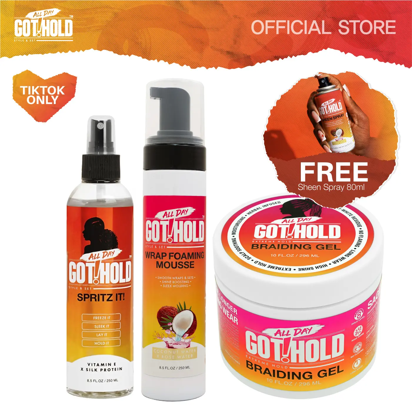 ·Spritz It! – A powerful setting spray that re-coats and seals your braids for extra-long hold. Adds a glossy, high-shine finish while locking everything in place for a sleek, polished look.