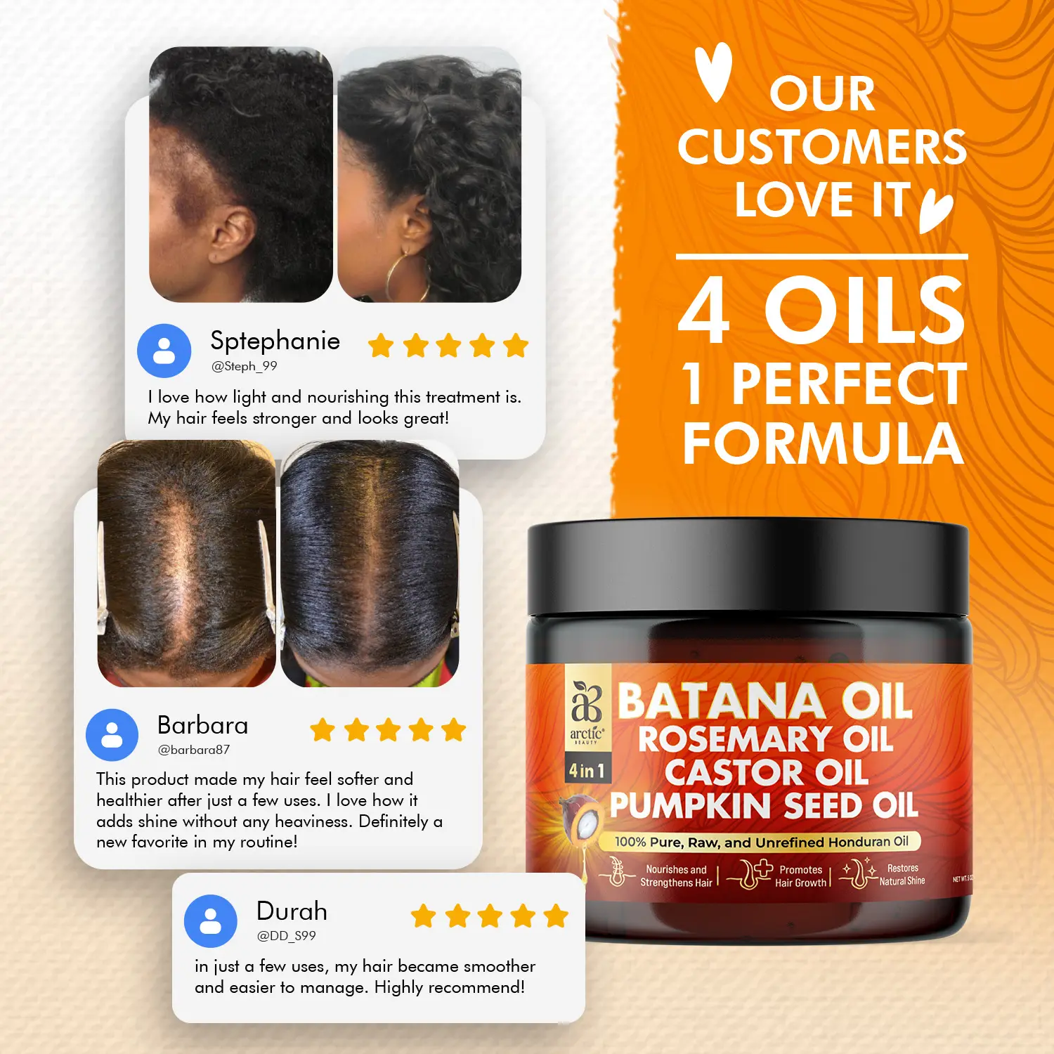 Unlock the power of nature with All-in-One: Arctic Beauty Batana Oil, an all-in-one solution crafted to rejuvenate and nourish your hair from root to tip. Infused with a potent blend of Batana Oil, Rosemary Oil, Castor Oil, and Pumpkin Seed Oil, this luxurious formula works to promote hair growth, strengthen strands, and add a radiant shine.
