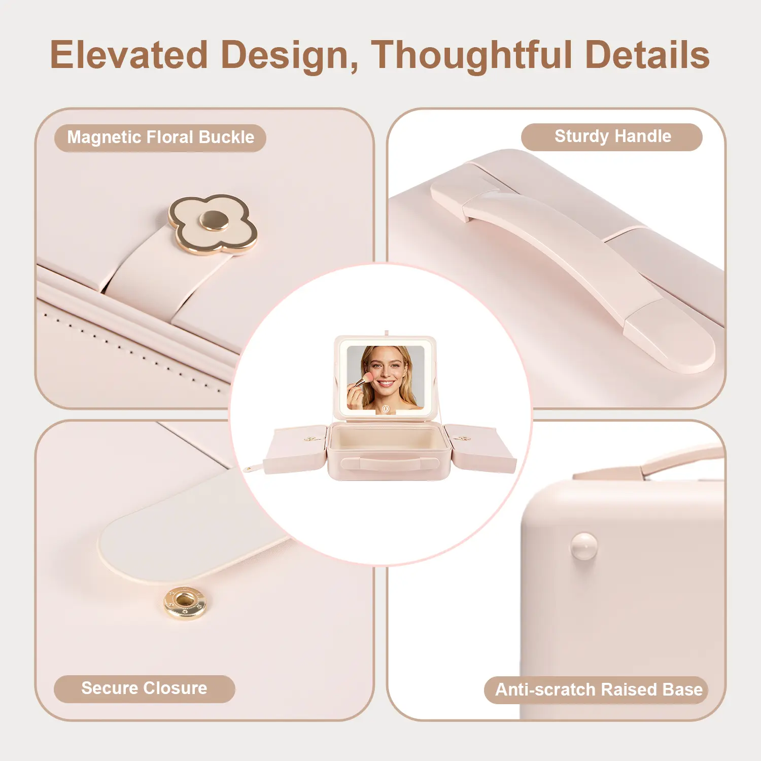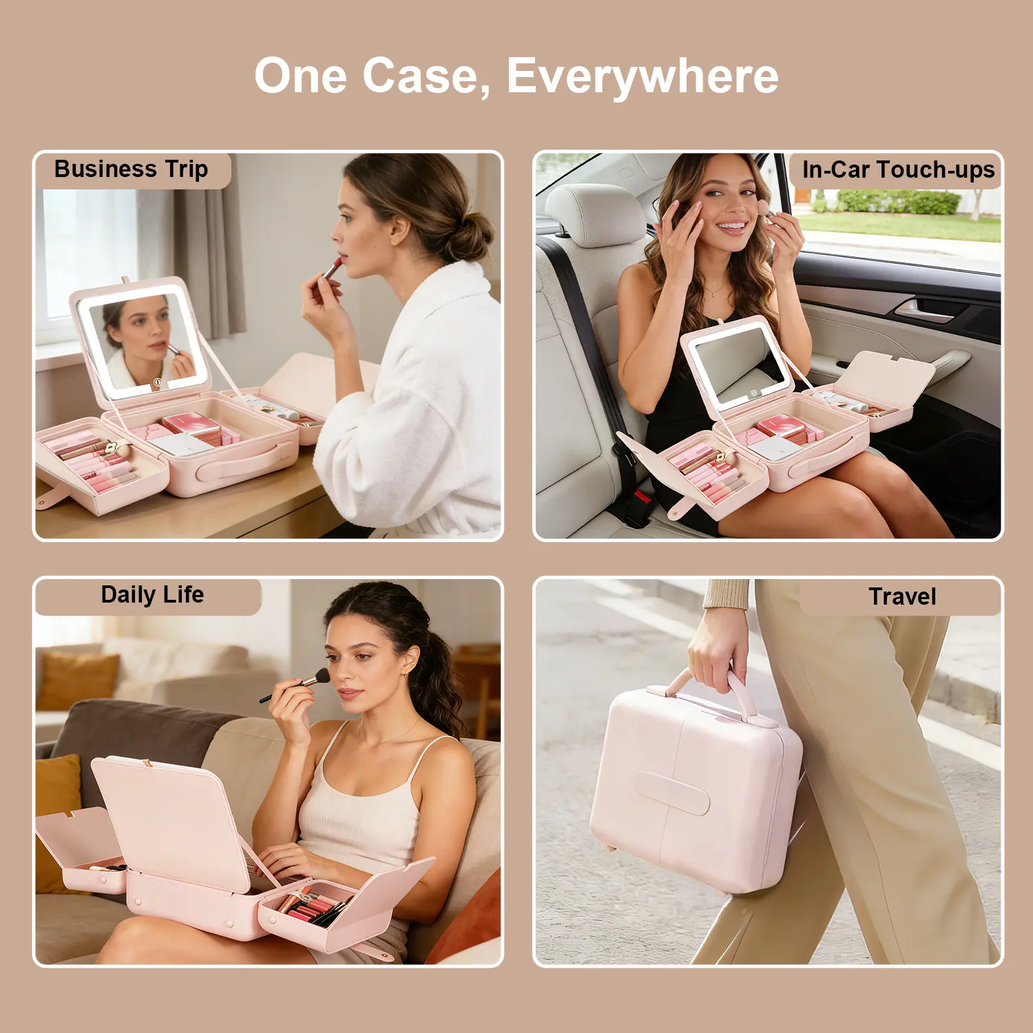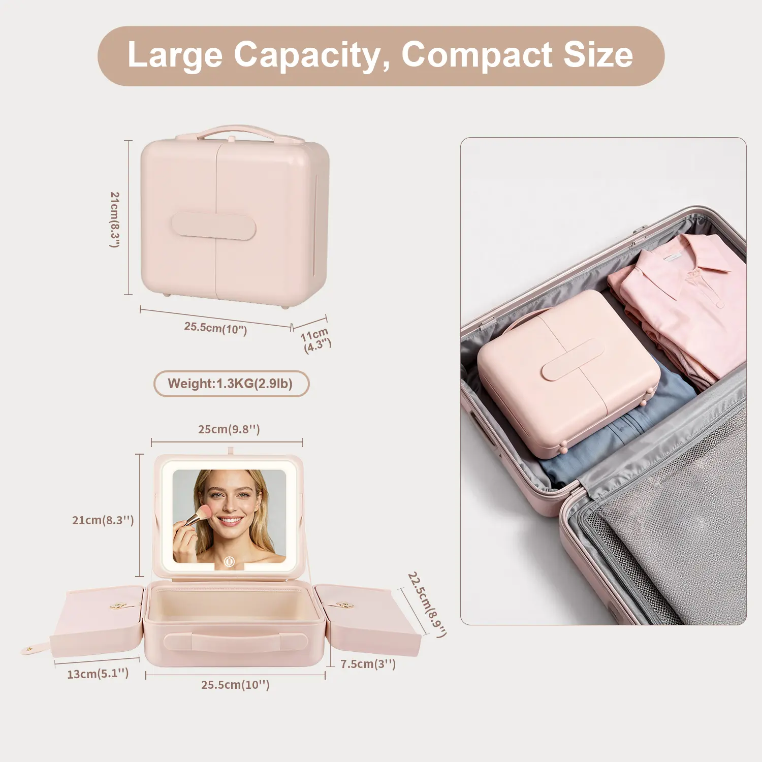 Obsessed It holds so much and has a rechargeable mirror that can go between warm, natural, and white light. Also came with a mirror to slip in any of your bag pockets so you can touch-up when you are on-the-go.