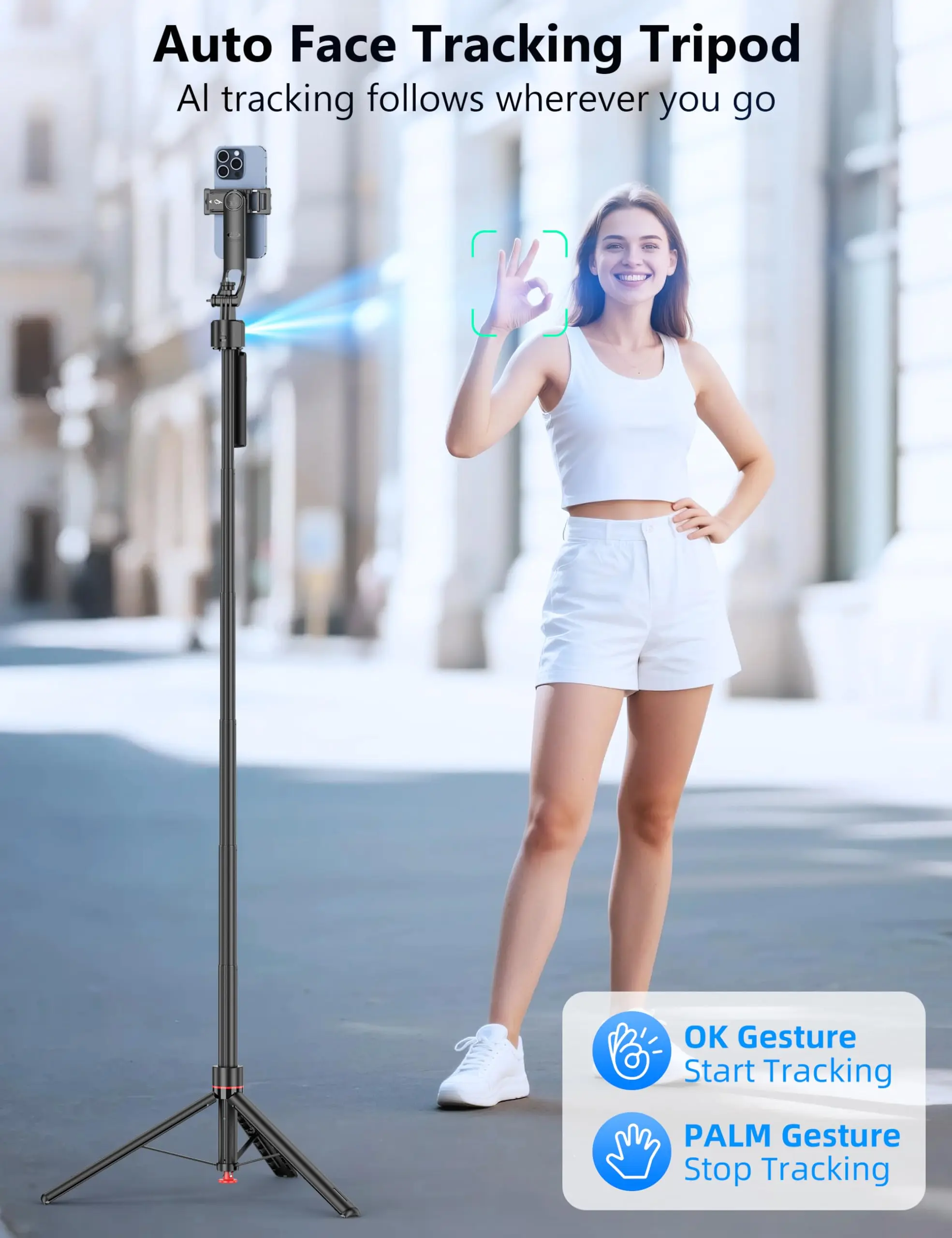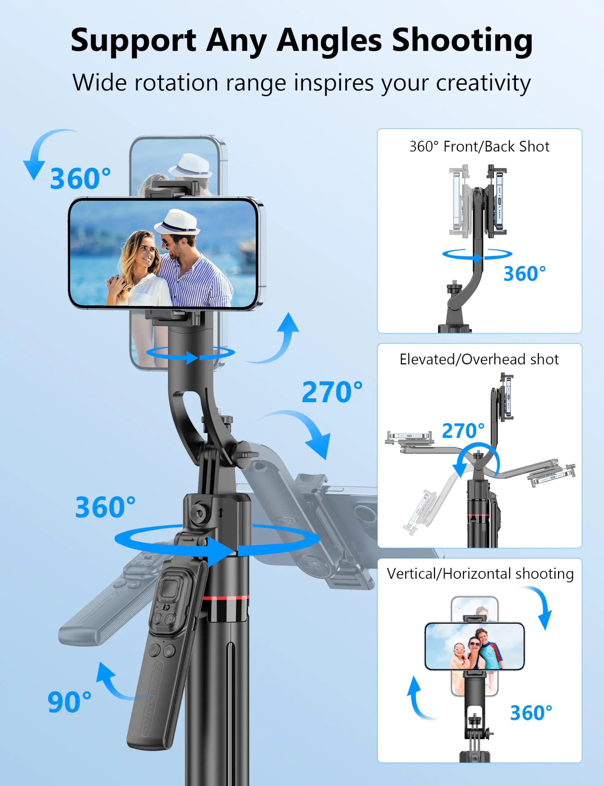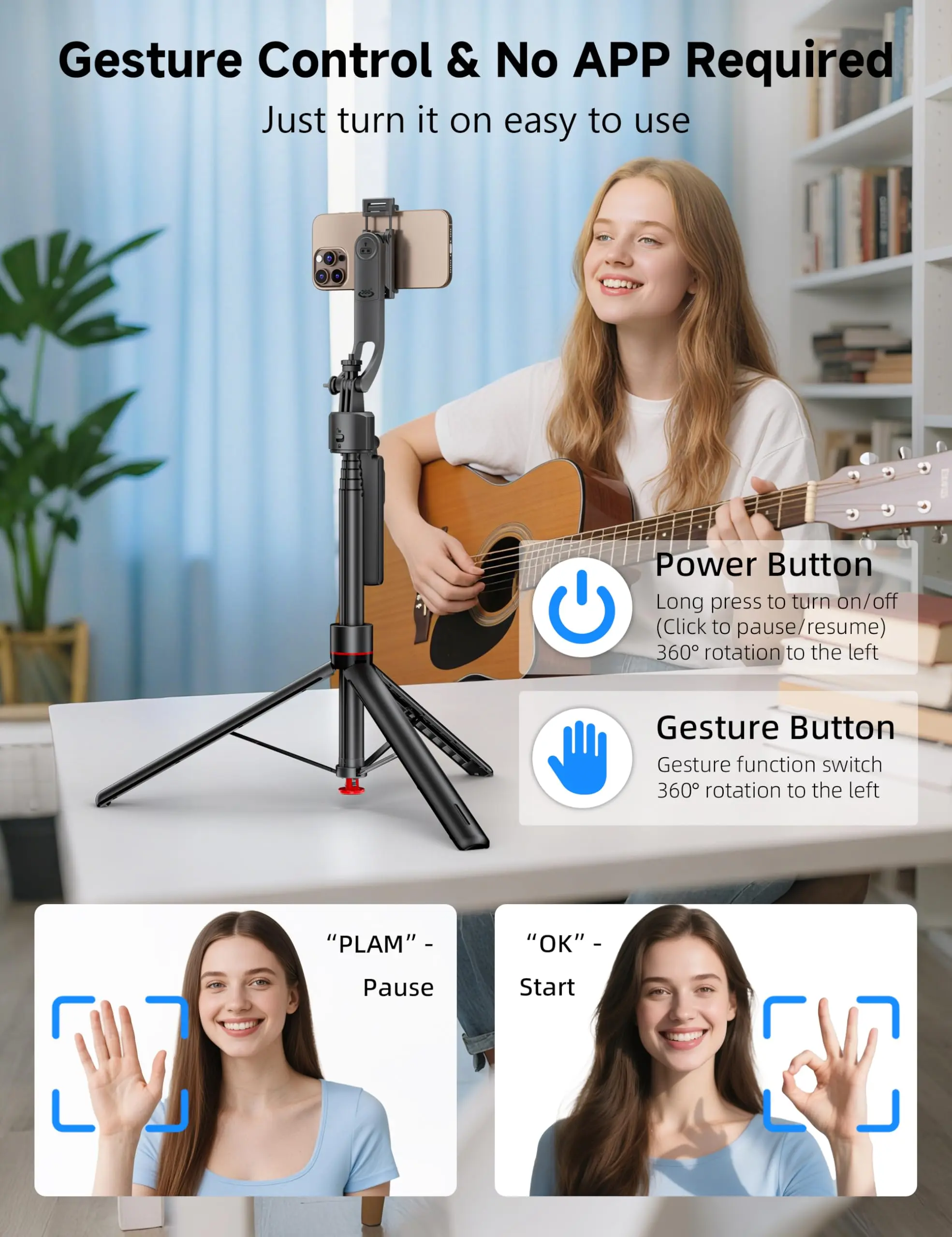 PROS: quick release tripod button, Single 360 auto tracking gimbal works w/out an app right out of the box, removable remote, adjustable telescopic base, compact, cellphone holder, can attach ring light or other accessories.