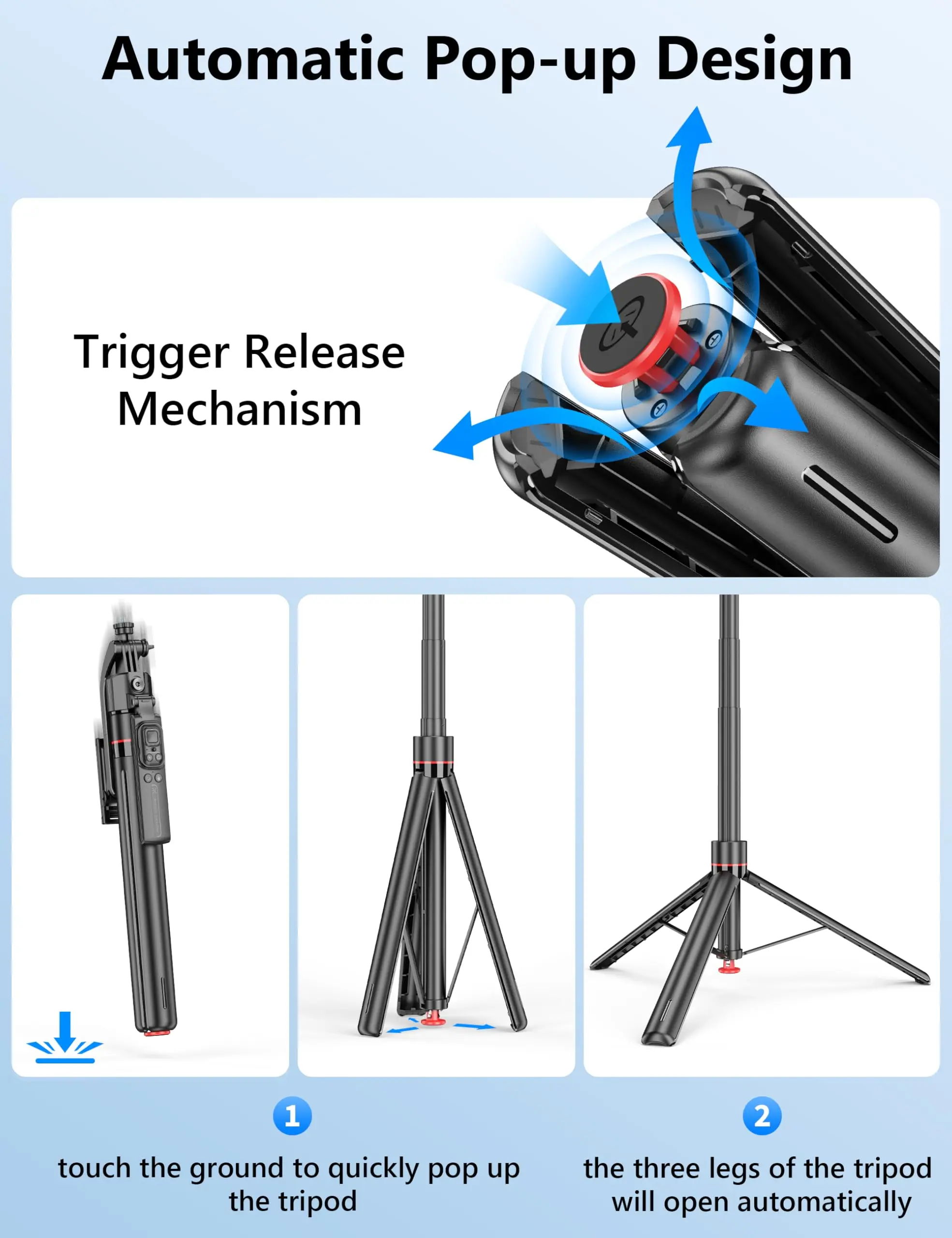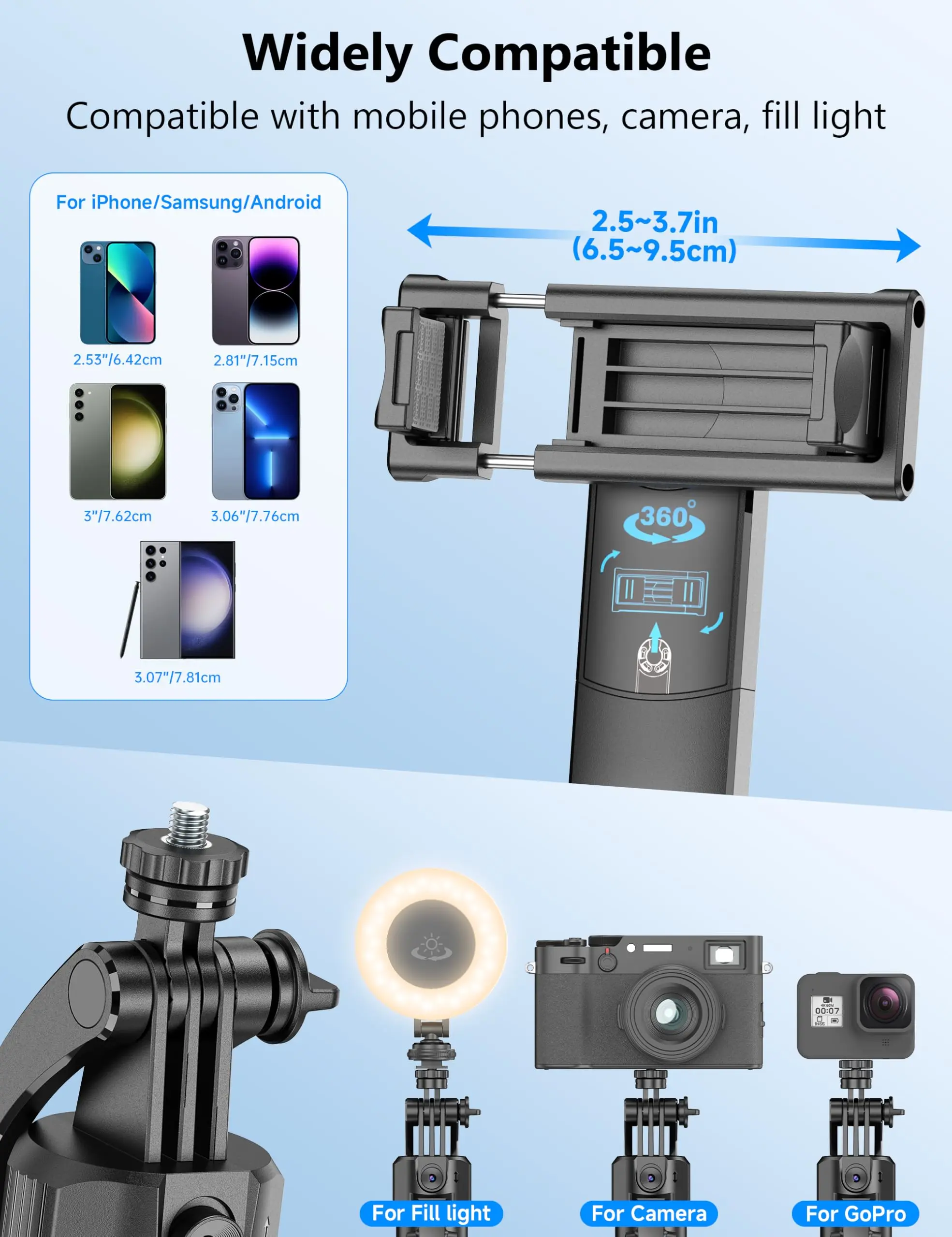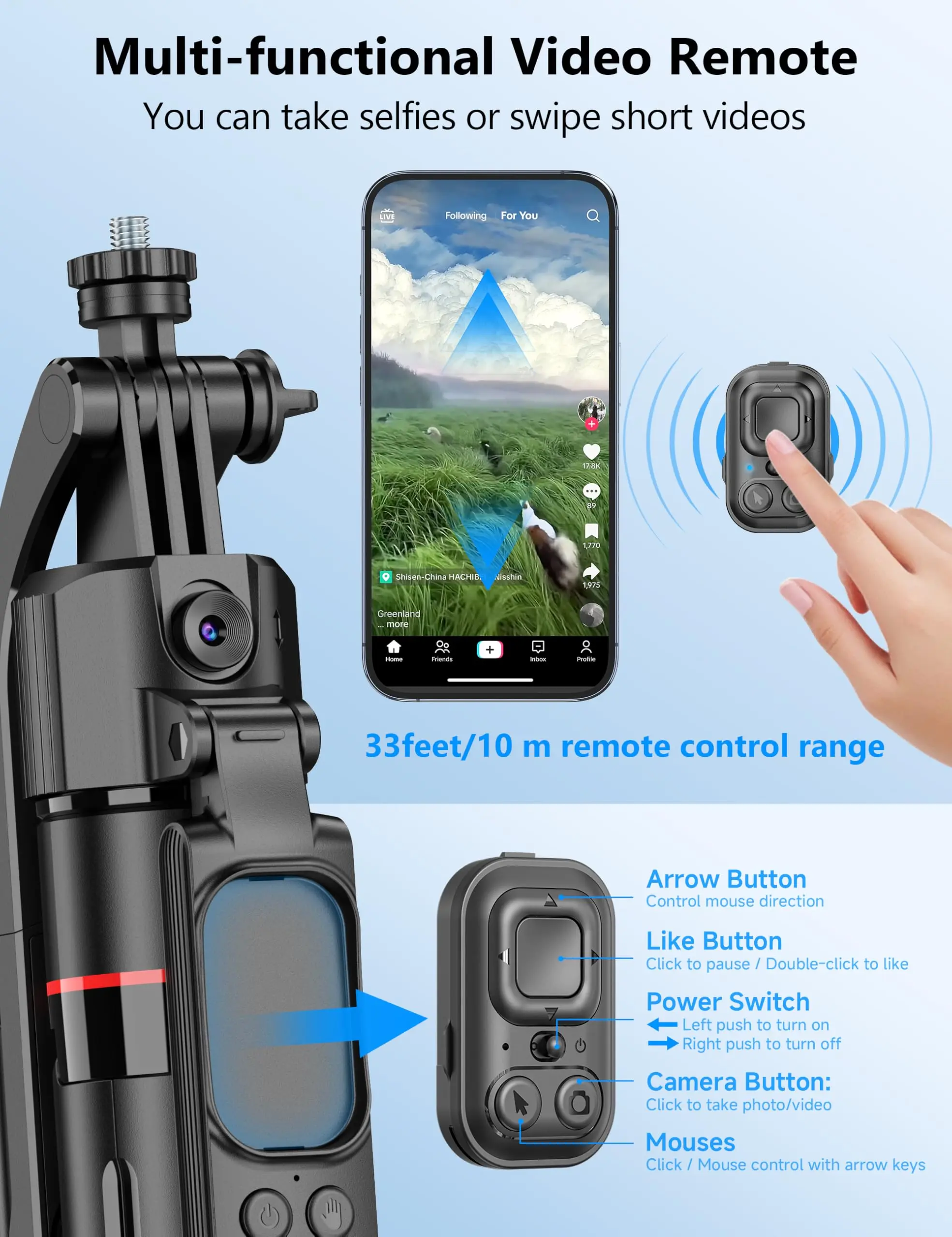 PROS: quick release tripod button, Single 360 auto tracking gimbal works w/out an app right out of the box, removable remote, adjustable telescopic base, compact, cellphone holder, can attach ring light or other accessories.