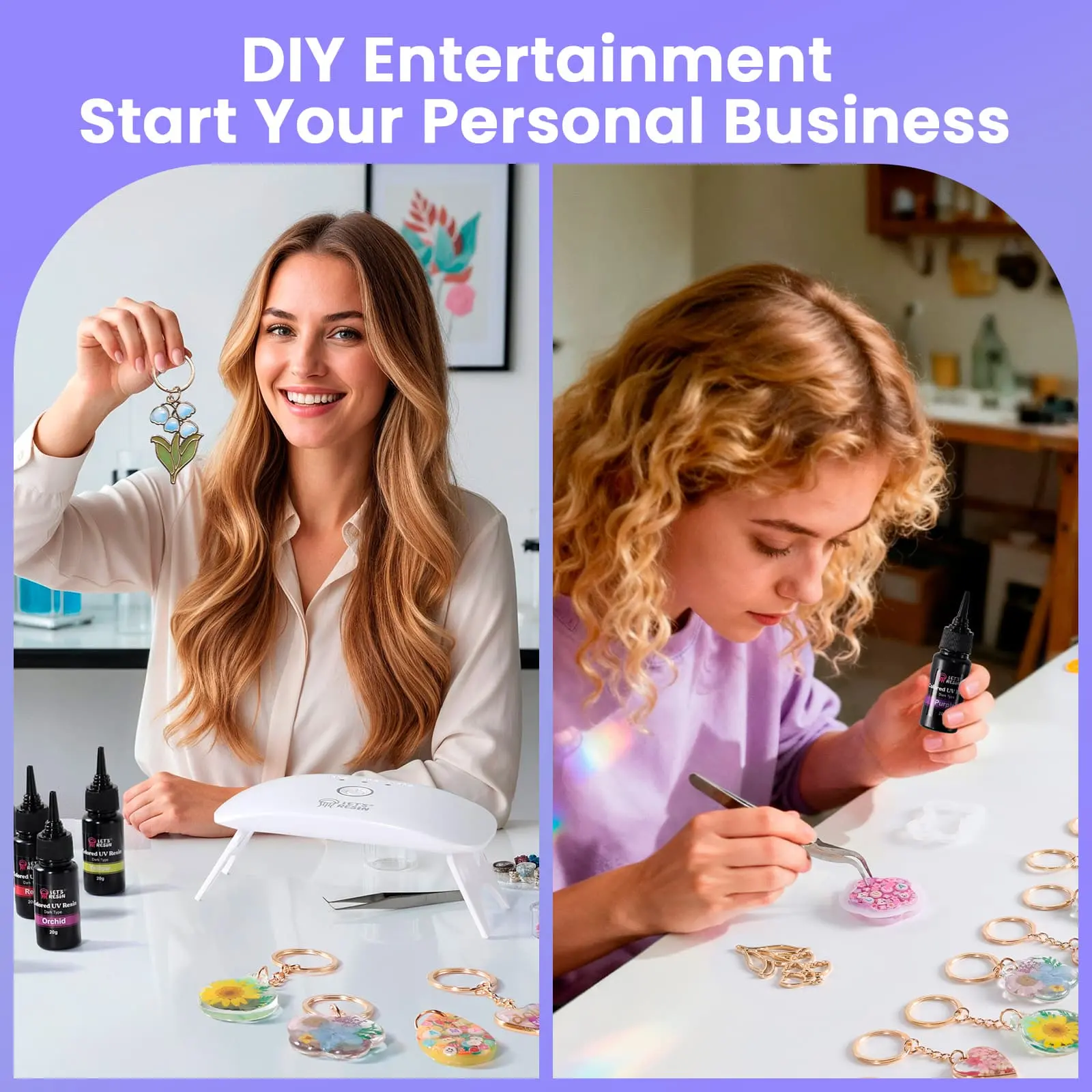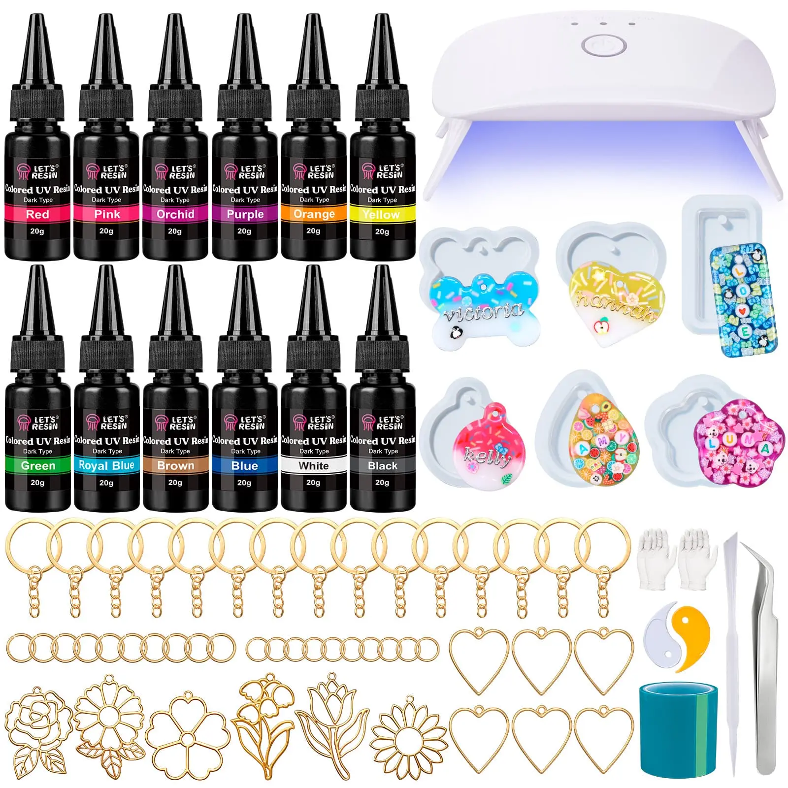 Ā·All-in-One UV Resin Kit for Beginners: This comprehensive kit includes everything you need to start UV resin jewelry making right away: 12 vibrant colored UV resin (20g each), a 12W white UV lamp, 6 keychain molds, 6 flower-shaped metal pendant frames, 6 small heart-shaped metal pendant frames, pendant chains & jump rings, UV resin tape, a pair of tweezers, a mixing stick, 2 plastic openers, and 2 pairs of gloves. Perfect for beginners to dive into DIY UV resin crafts without missing any essentials.