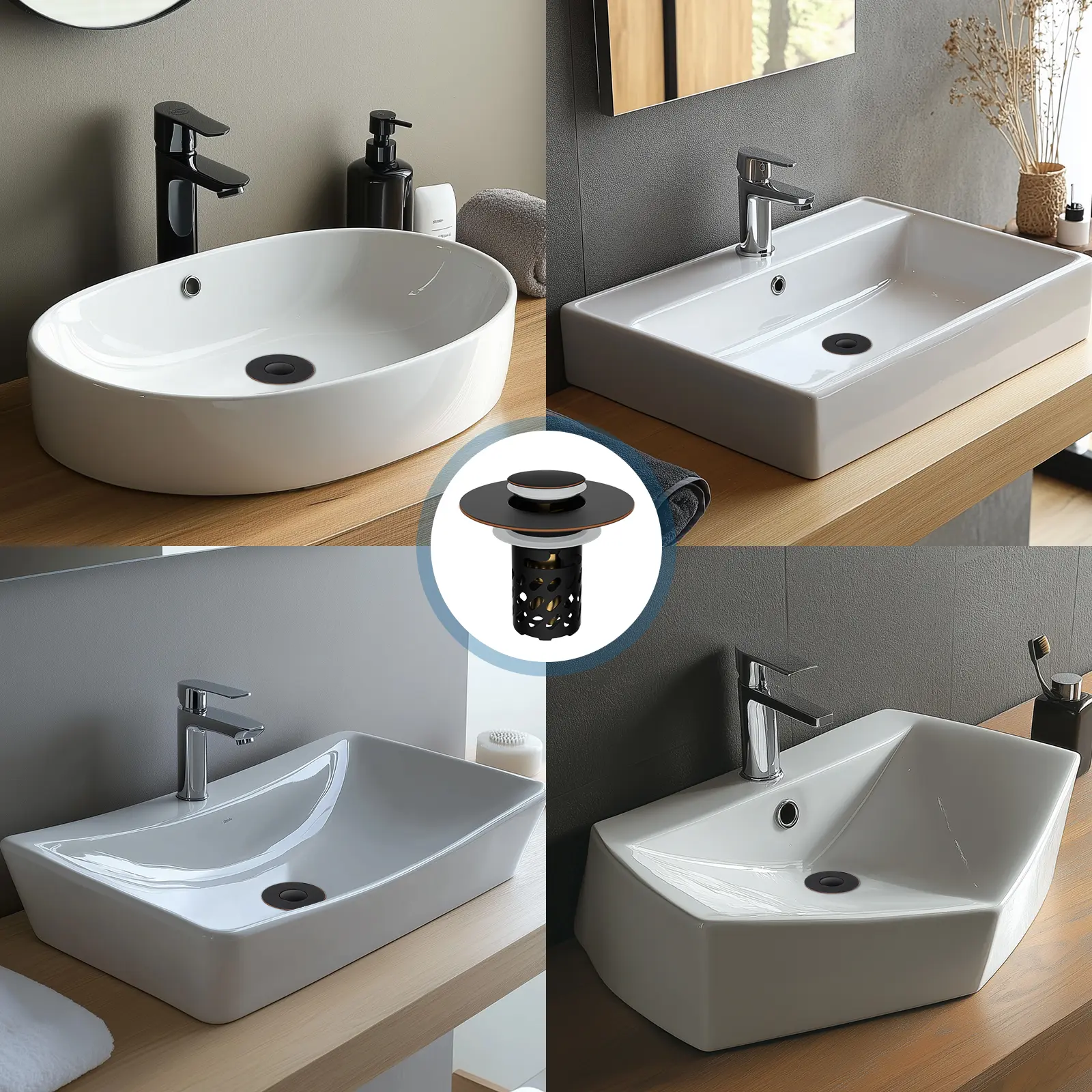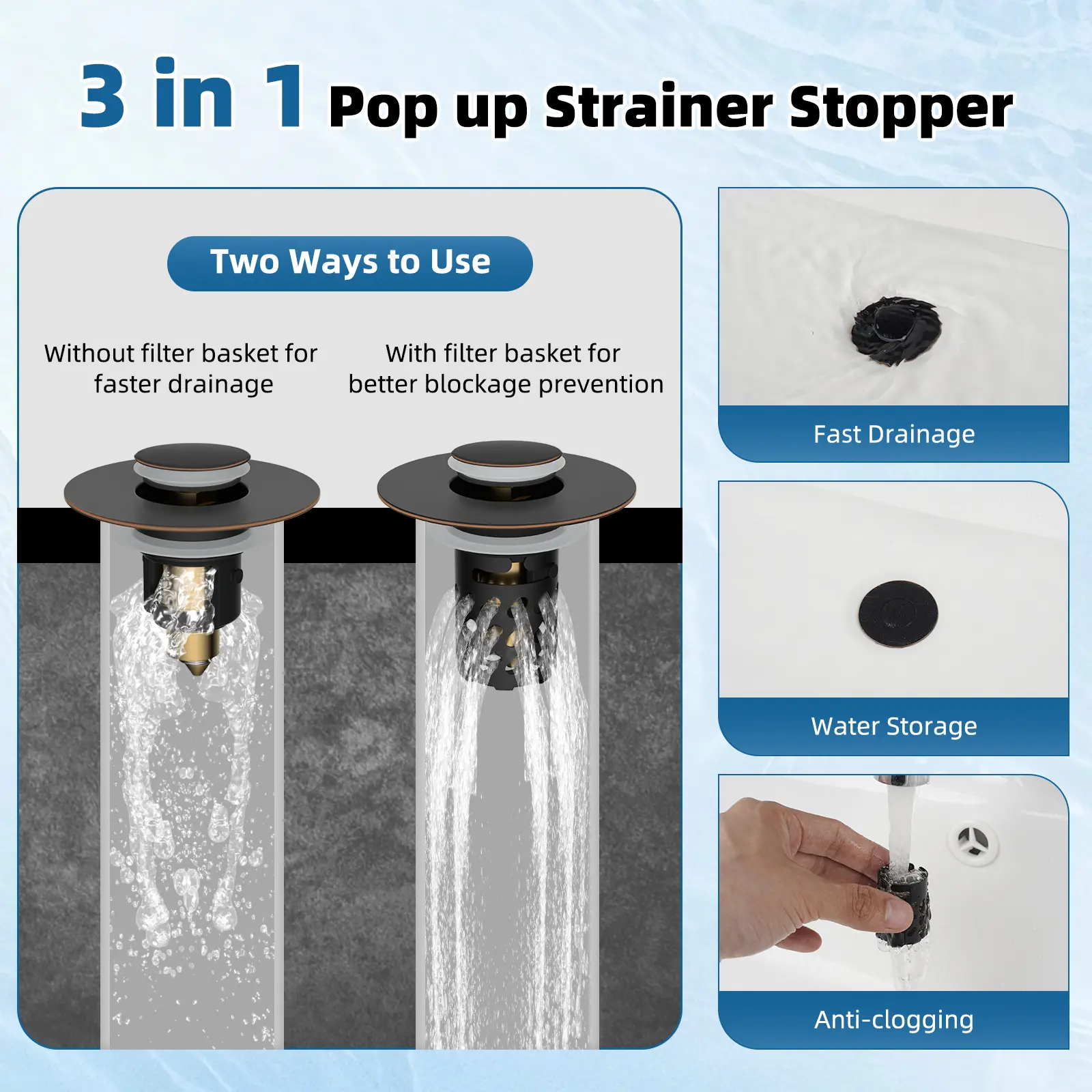 3-in-1 Design: This sink stopper combines water storage, rapid drainage, and advanced filtration in one smart design. The removable filter basket effectively traps hair, cosmetic residues, jewelry, and other tiny debris, significantly reducing pipe clogging risks. Effortlessly switch between two modes: remove the basket for faster water flow or install it to enhance blockage prevention. Designed for everyday reliability and effortless maintenance