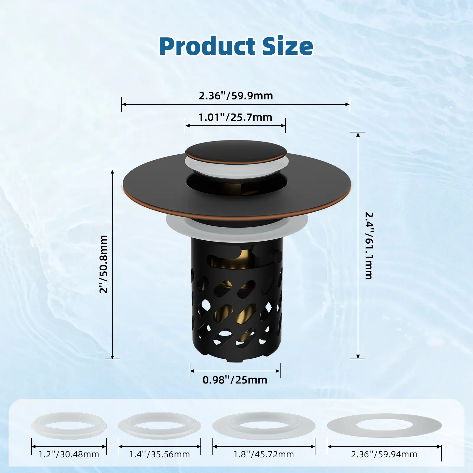 Universally Compatible Design:Designed for seamless integration, our drain stopper fits 99% of US bathroom drains, accommodating inner diameters from 1.1 inches to 2.3 inches (28mm to 58mm). Its sleek blends with your sink for a streamlined, clutter-free aesthetic. Whether you're outfitting a new sink or upgrading an existing one, it keeps a snug fit, making installation seamless and convenient