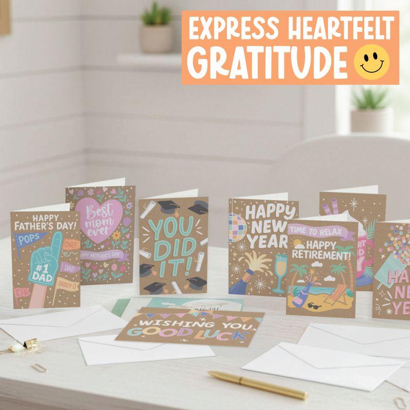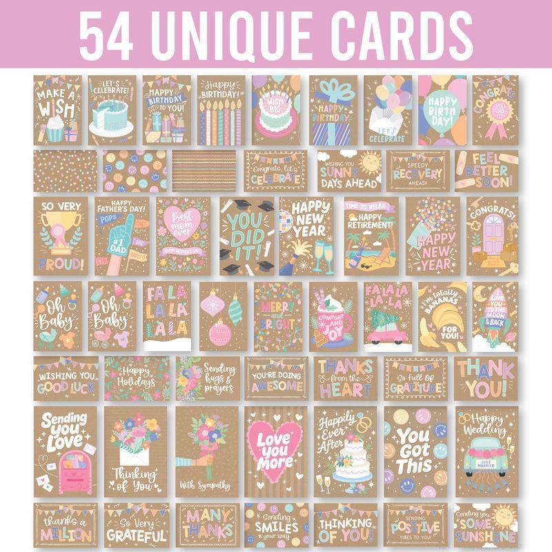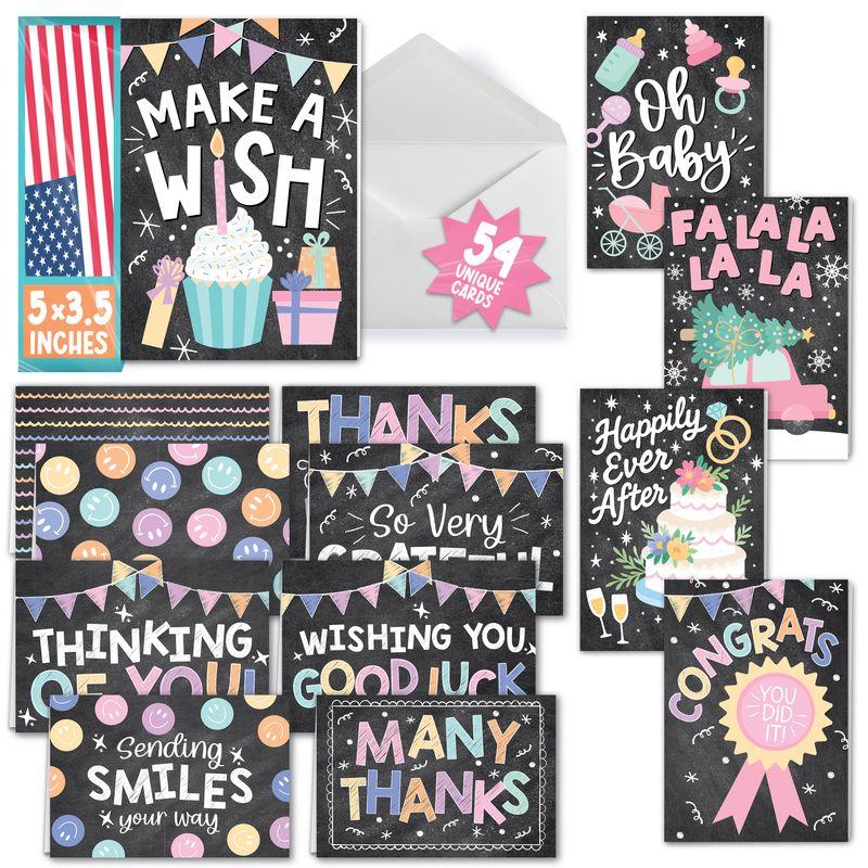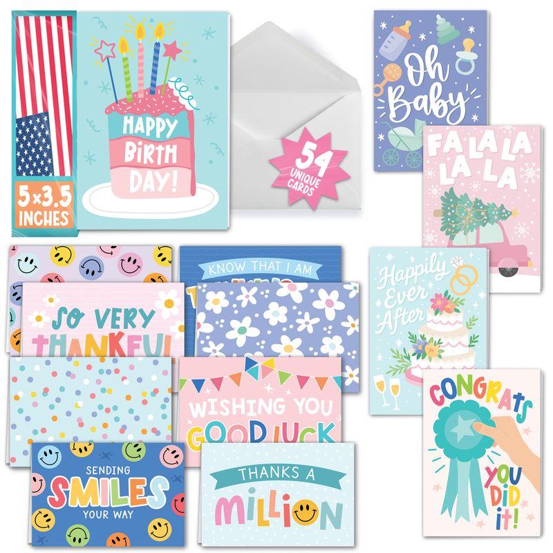 You’ll receive 54 total 5 x 3.5 inch cards with 54 matching envelopes, covering birthdays, thank yous, get well wishes, and more, so you’re prepared for every occasion. No more last-minute store runs—just meaningful connections made easy.