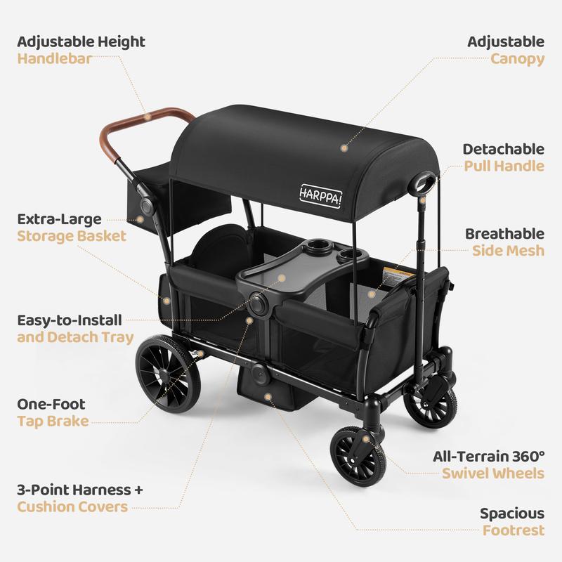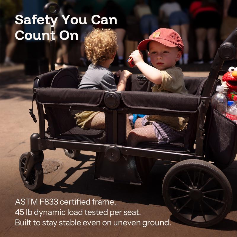 Double Stroller Wagon: Seats up to two kids ages 6–36 months, 55 lbs each (110 lbs total).